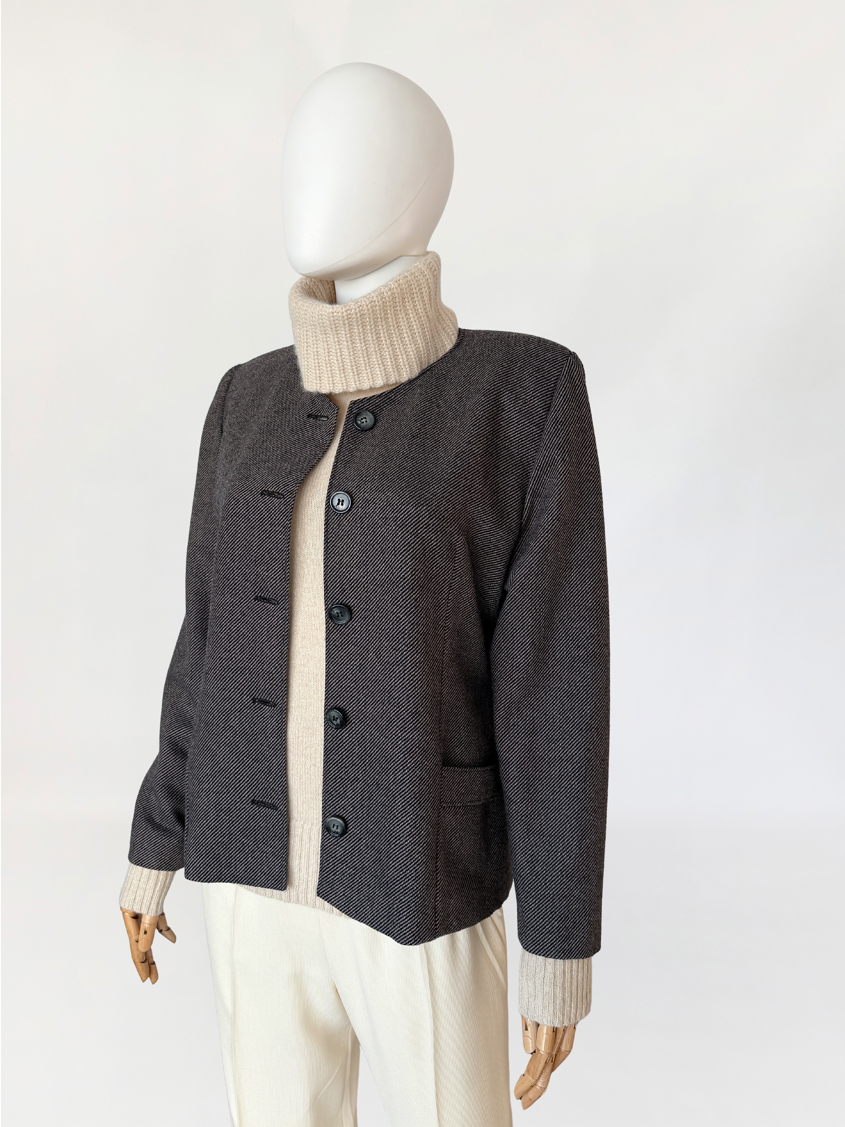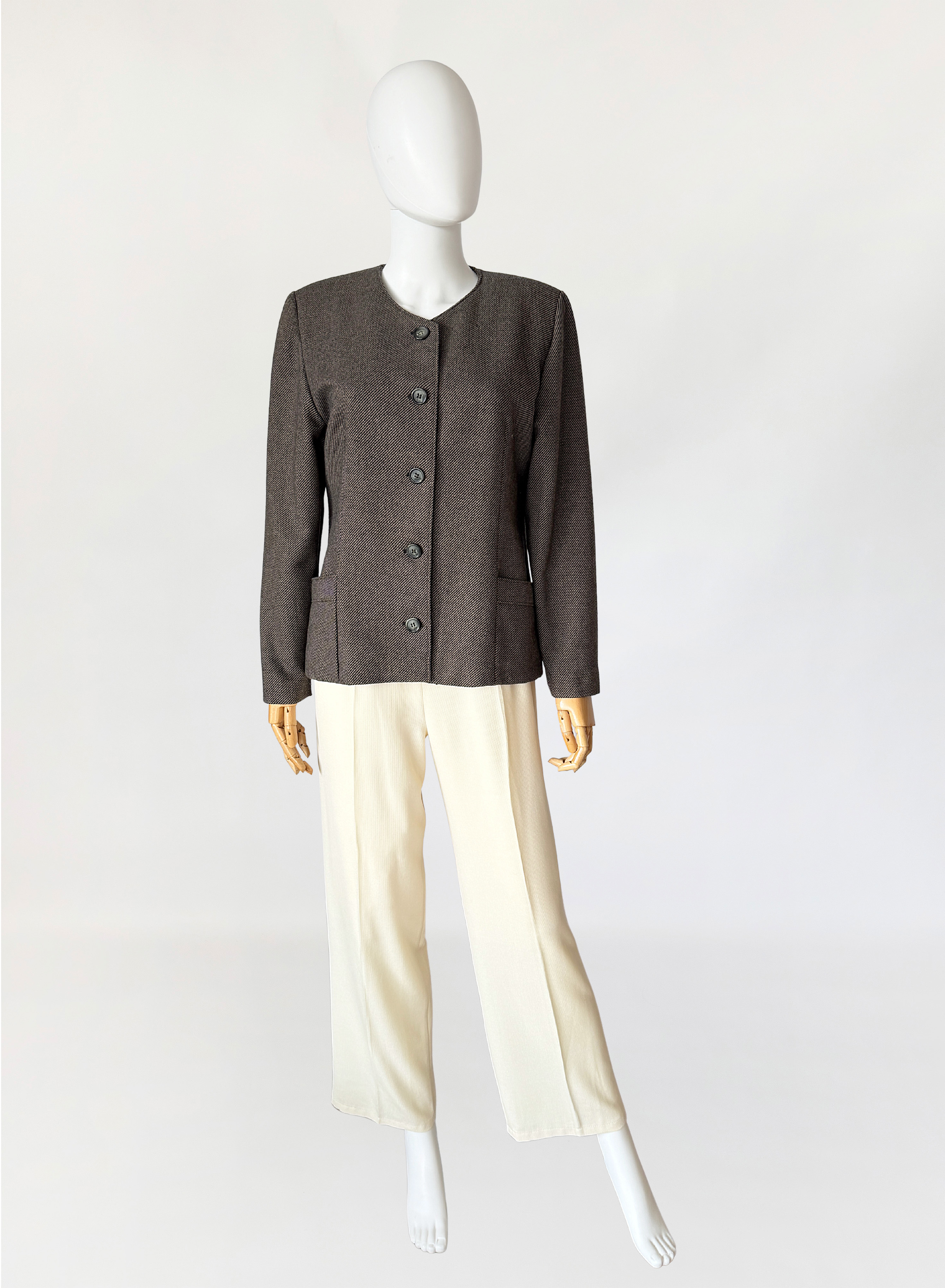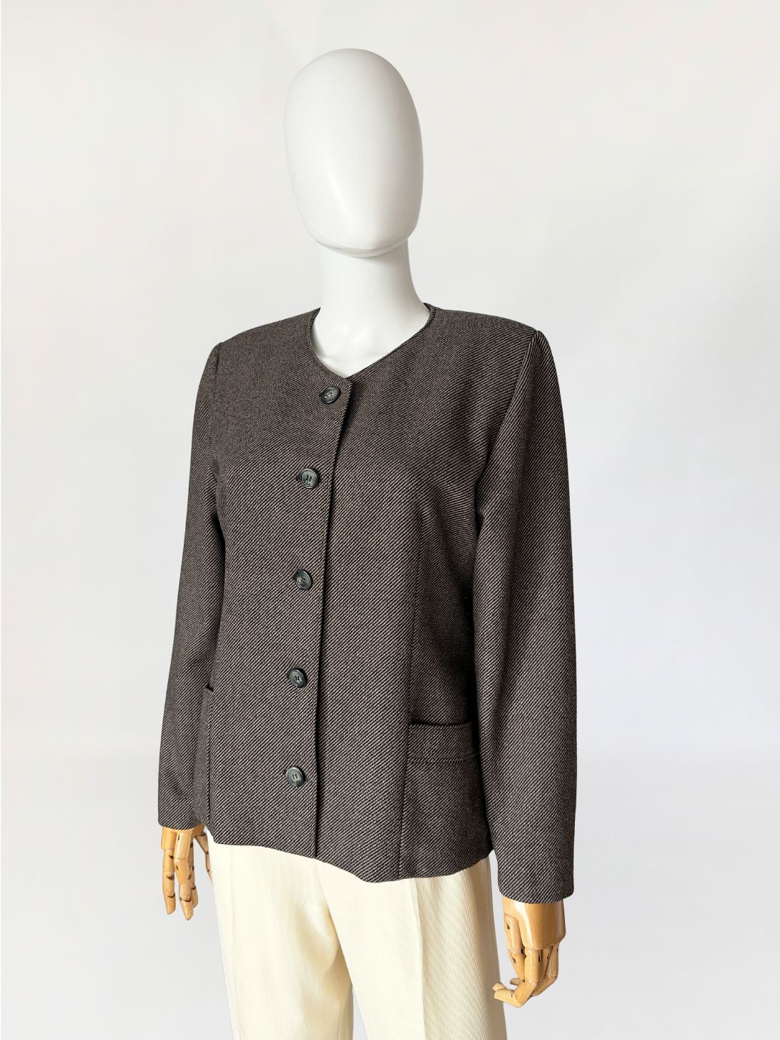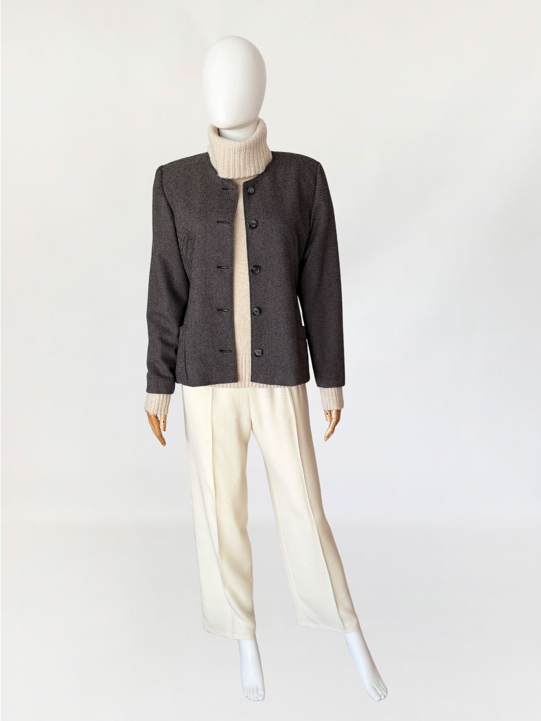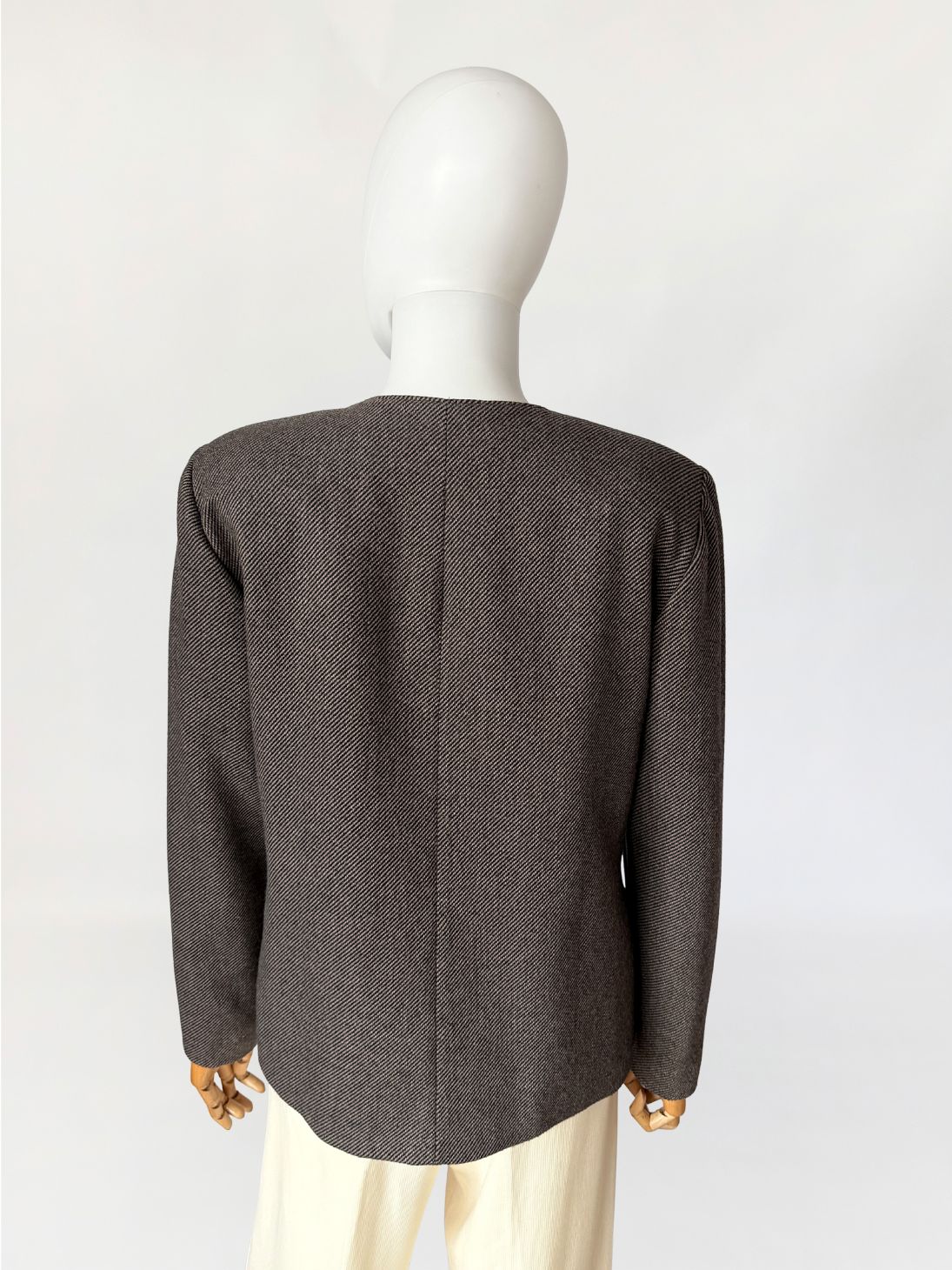 Marynarka vintage marki Luisa Spagnoli wykonana w całości z wełny. Tkanina o wyraźnym skośnym splocie w odcieniu beżu z czarnym przełamaniem. FLekko taliowany fason z prostą linią ramion podkreśloną wszytymi poduszkami. Dekolt bez kołnierza, wykończony w linii lekko zaokrąglonego V. Zapięcie jednorzędowe. Przód z pionowymi cięciami modelującymi oraz naszywanymi kieszeniami u dołu. Rękawy proste, o klasycznej konstrukcji. Tył gładki, z centralnym szwem konstrukcyjnym.