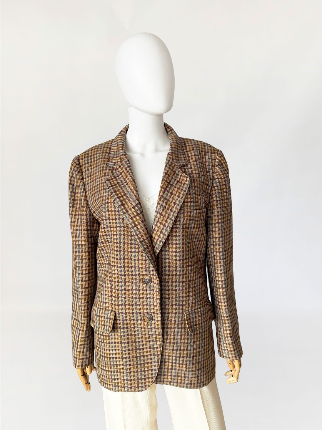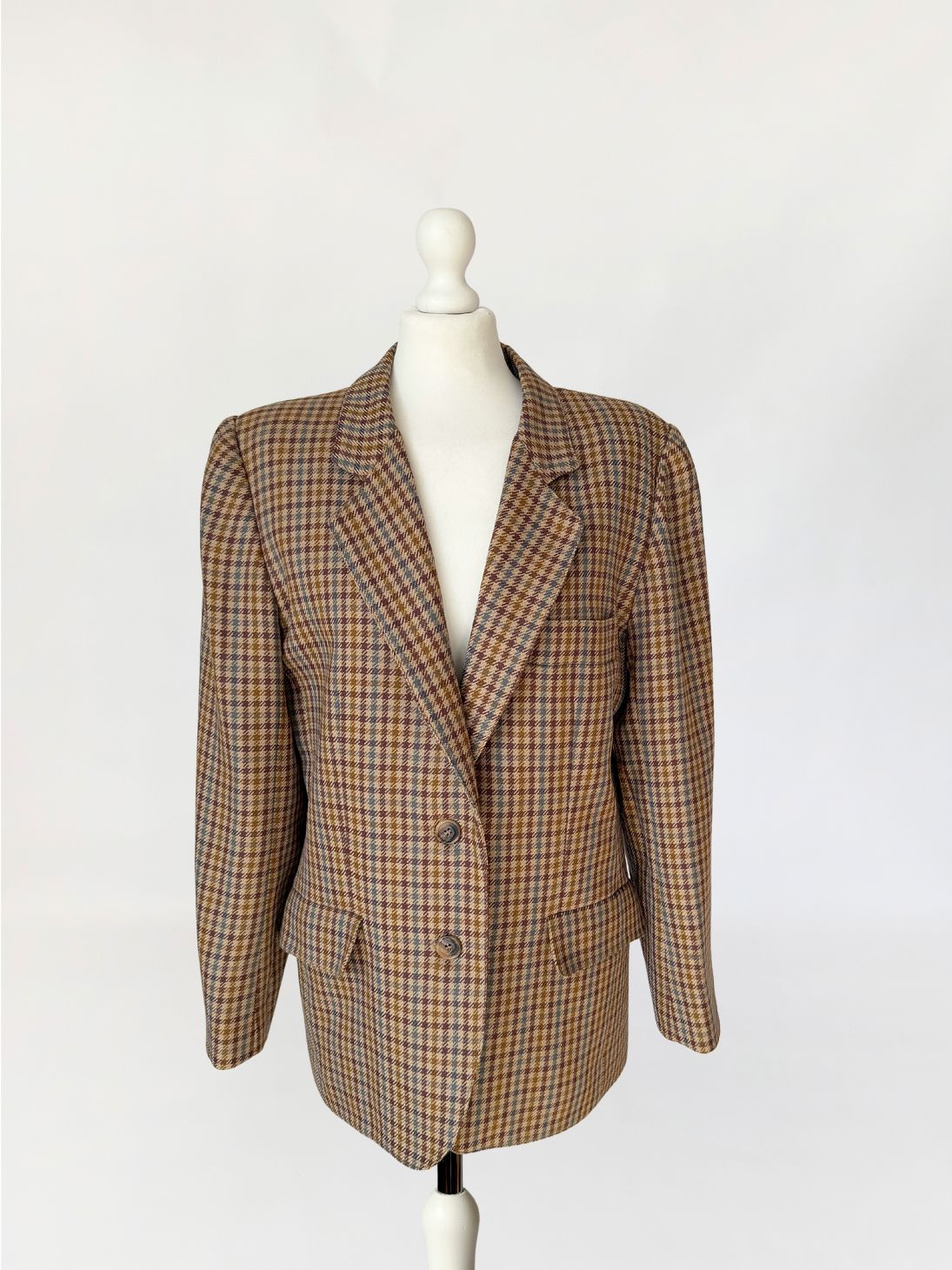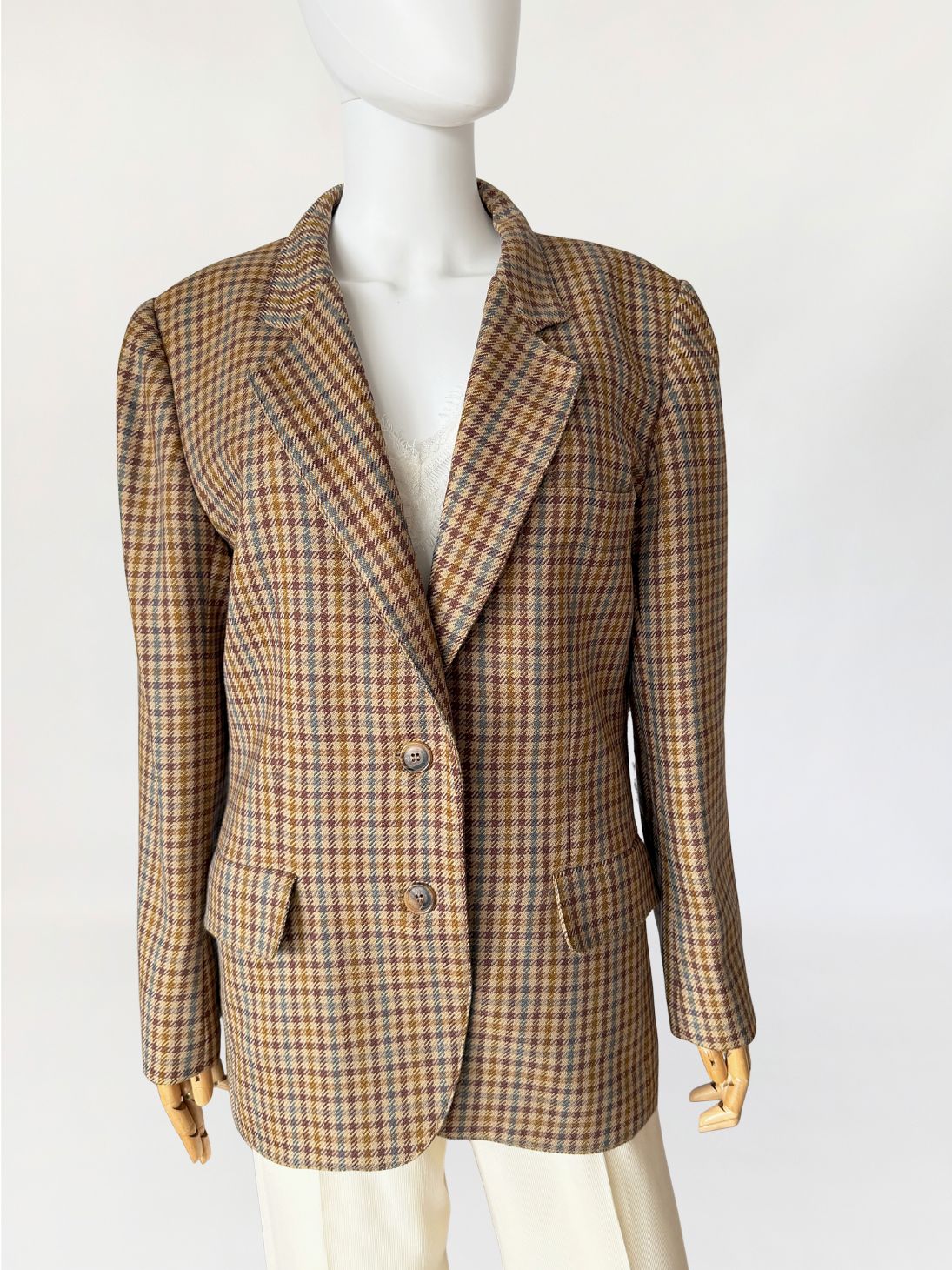 Marynarka vintage z lat 80-tych projektu marki Luisa Spagnoli> Wykonana z wełnianej tkaniny o drobnym, gęstym wzorze kraty w odcieniach brązu, beżu oraz przygaszonego błękitu. Swobodny jednorzędowy fason z klasycznym kołnierzem. Zapięcie na dwa guziki. Linia ramion podkreślona, rękawy proste, klasycznie wszyte. Przód z zaszewkami modelującymi oraz kieszenią piersiową i dwiema kieszeniami dolnymi z patkami. Tył gładki, bez rozcięcia.