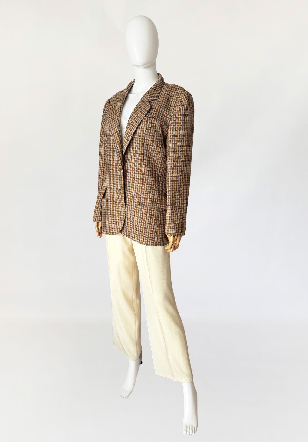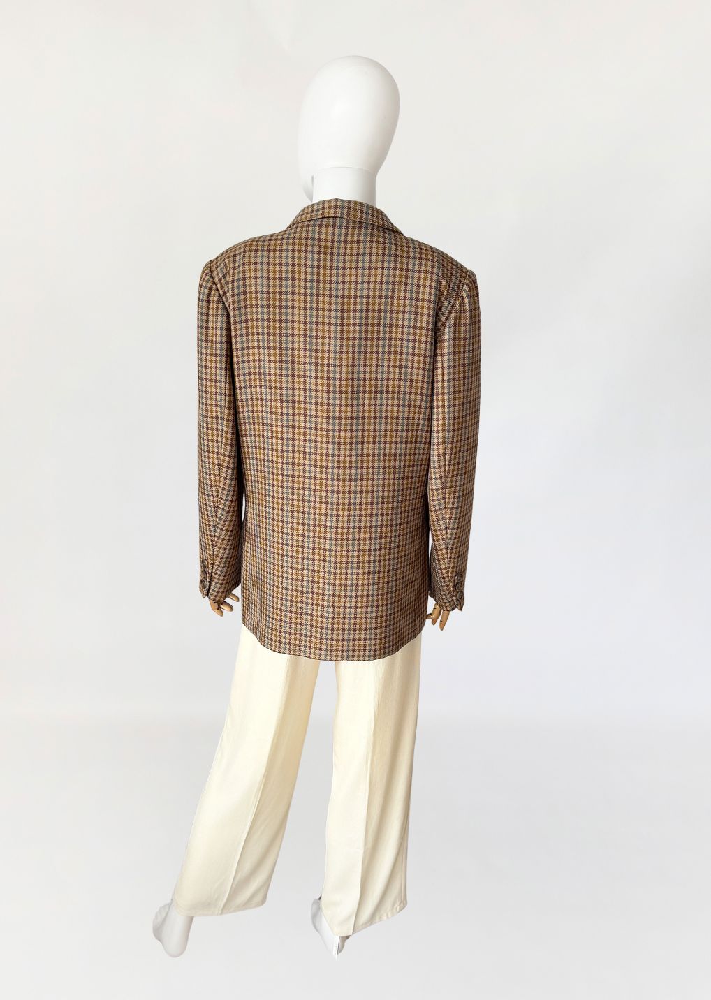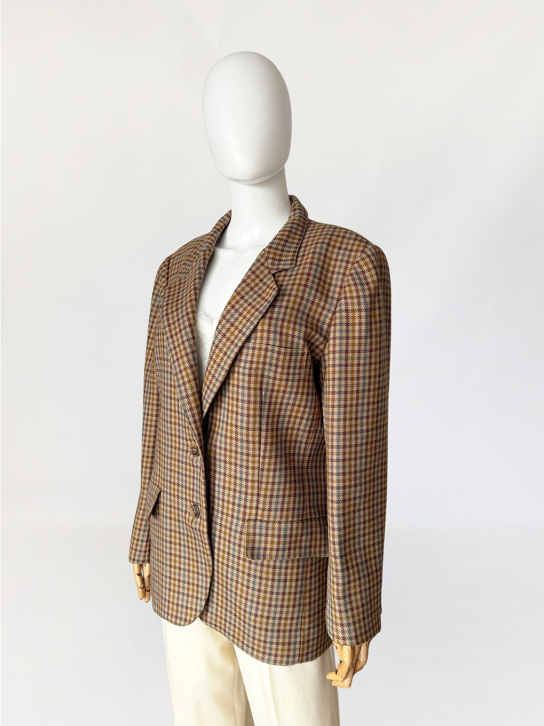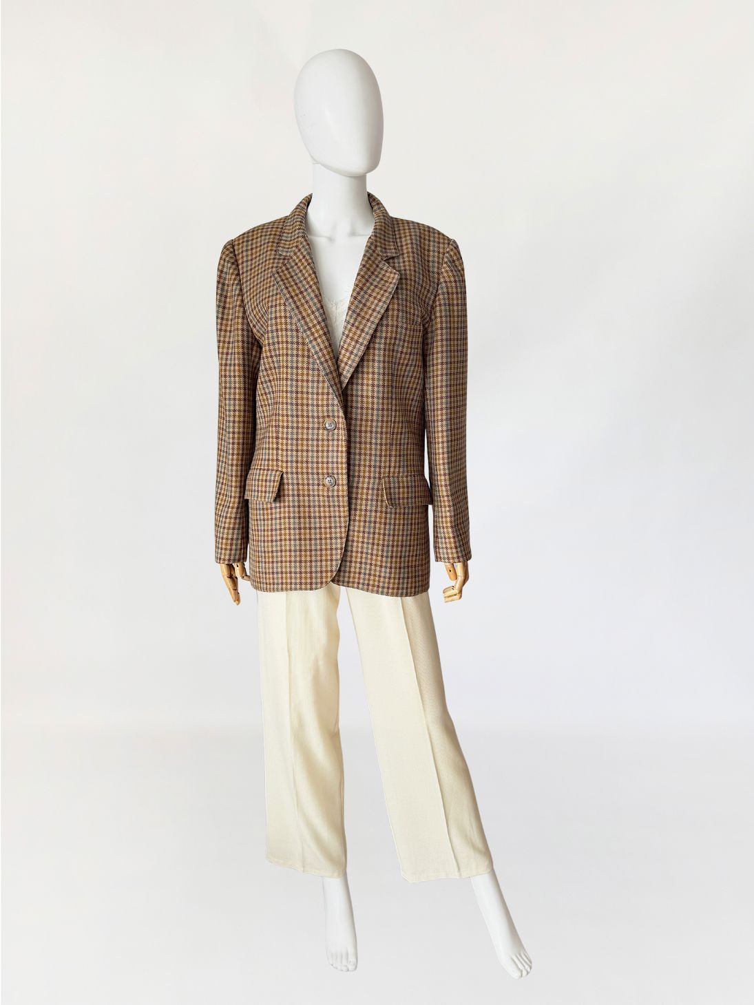 Marynarka vintage z lat 80-tych projektu marki Luisa Spagnoli> Wykonana z wełnianej tkaniny o drobnym, gęstym wzorze kraty w odcieniach brązu, beżu oraz przygaszonego błękitu. Swobodny jednorzędowy fason z klasycznym kołnierzem. Zapięcie na dwa guziki. Linia ramion podkreślona, rękawy proste, klasycznie wszyte. Przód z zaszewkami modelującymi oraz kieszenią piersiową i dwiema kieszeniami dolnymi z patkami. Tył gładki, bez rozcięcia.