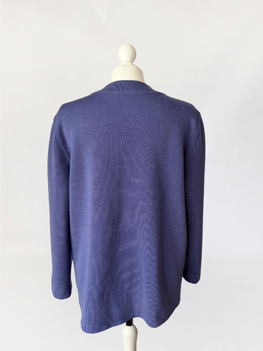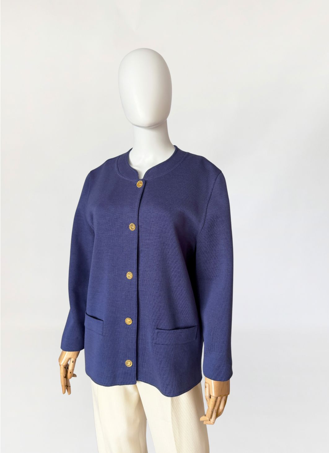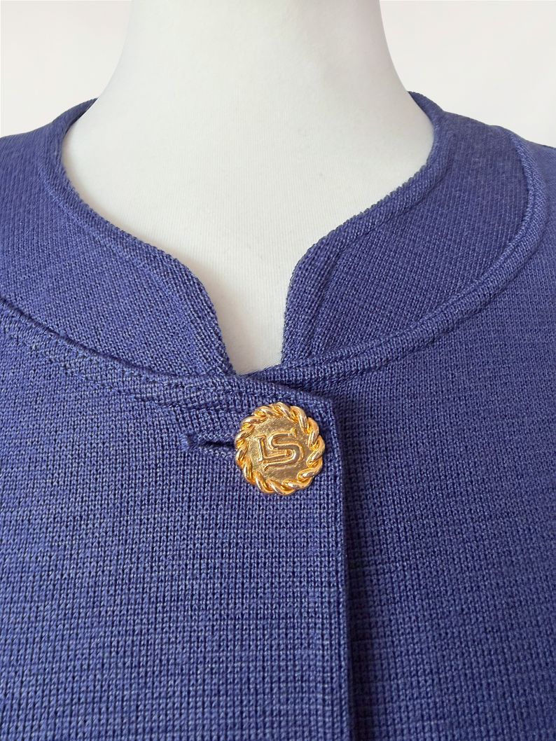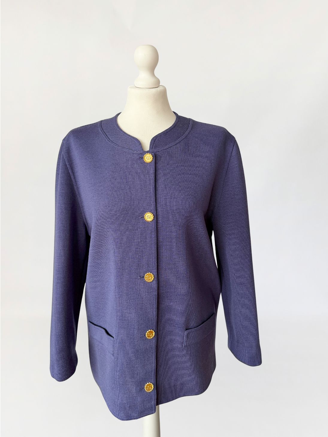 Kardigan/marynarka vintage marki Luisa Spagnoli. Wykonany w całości z wełny w odcieniu przygaszonego błękitu z nutą fioletu. Swobodny, prosty fason o długości do bioder. Dekolt półokrągły z delikatnym wycięciem w środkowej części. Zapięcie na rząd metalowych guzików w złotym kolorze, z tłoczonymi inicjałami marki. Rękawy długie, proste. Na wysokości bioder naszyte dwie kieszenie o prostokątnym kształcie.