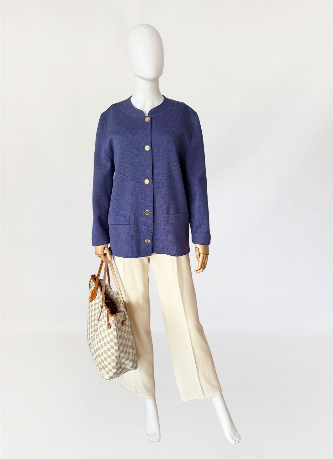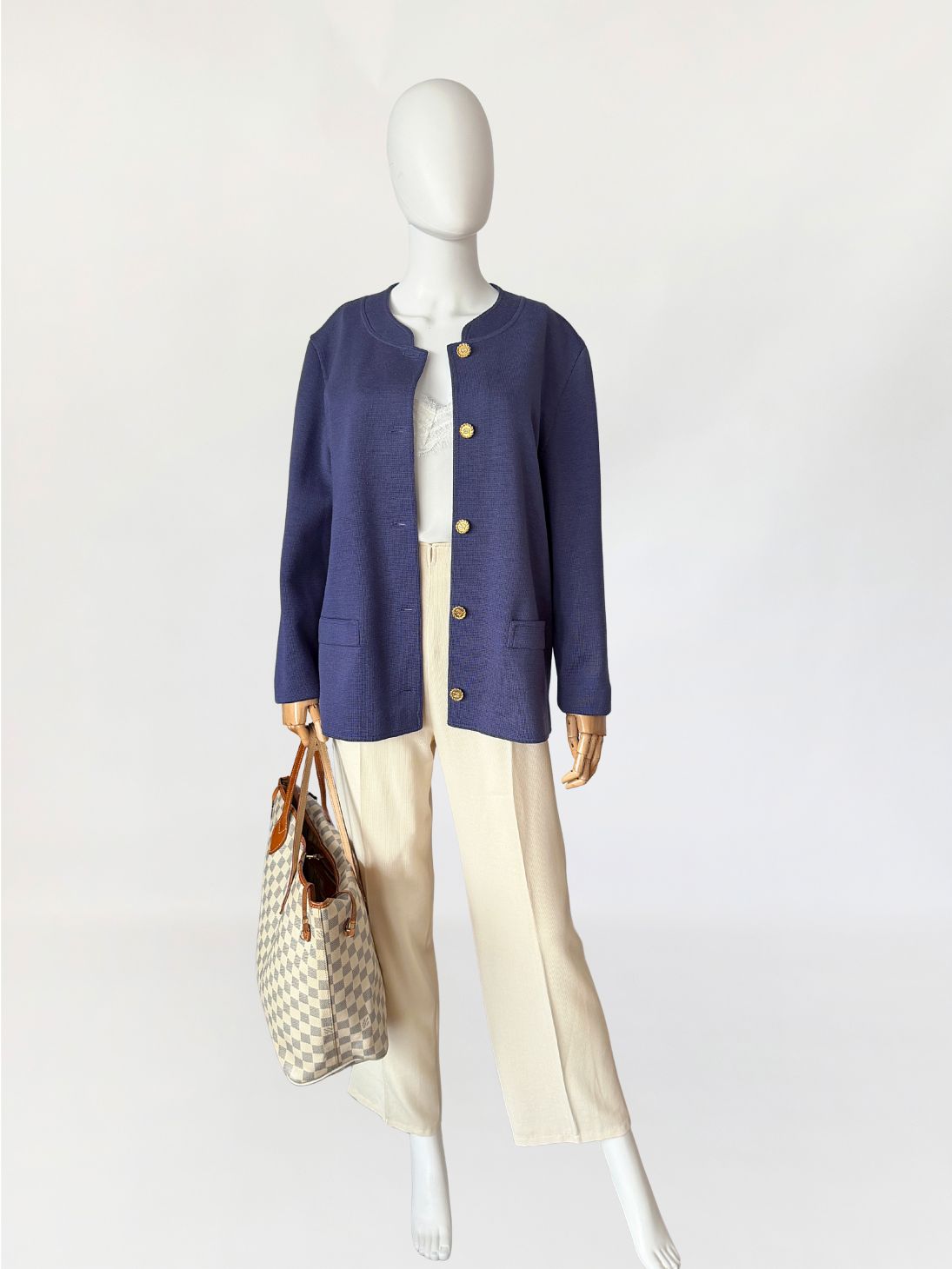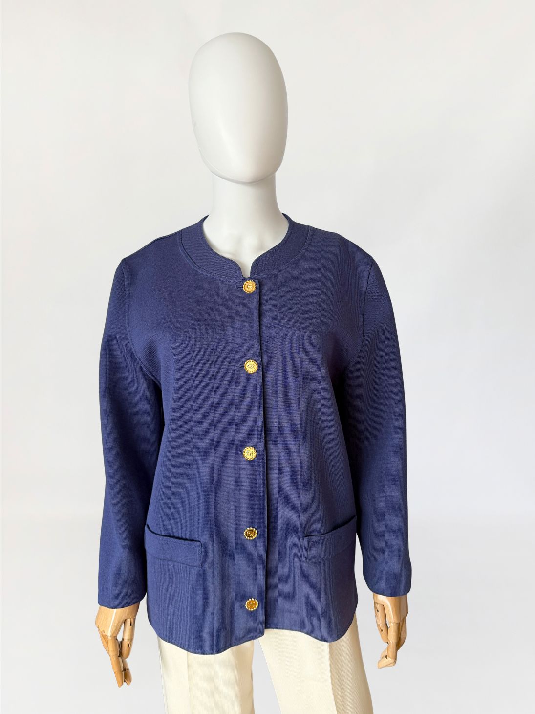 Kardigan/marynarka vintage marki Luisa Spagnoli. Wykonany w całości z wełny w odcieniu przygaszonego błękitu z nutą fioletu. Swobodny, prosty fason o długości do bioder. Dekolt półokrągły z delikatnym wycięciem w środkowej części. Zapięcie na rząd metalowych guzików w złotym kolorze, z tłoczonymi inicjałami marki. Rękawy długie, proste. Na wysokości bioder naszyte dwie kieszenie o prostokątnym kształcie.