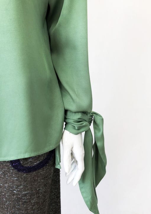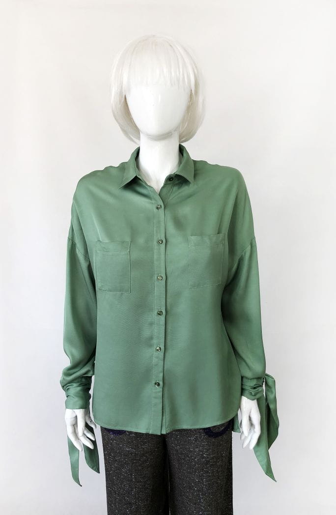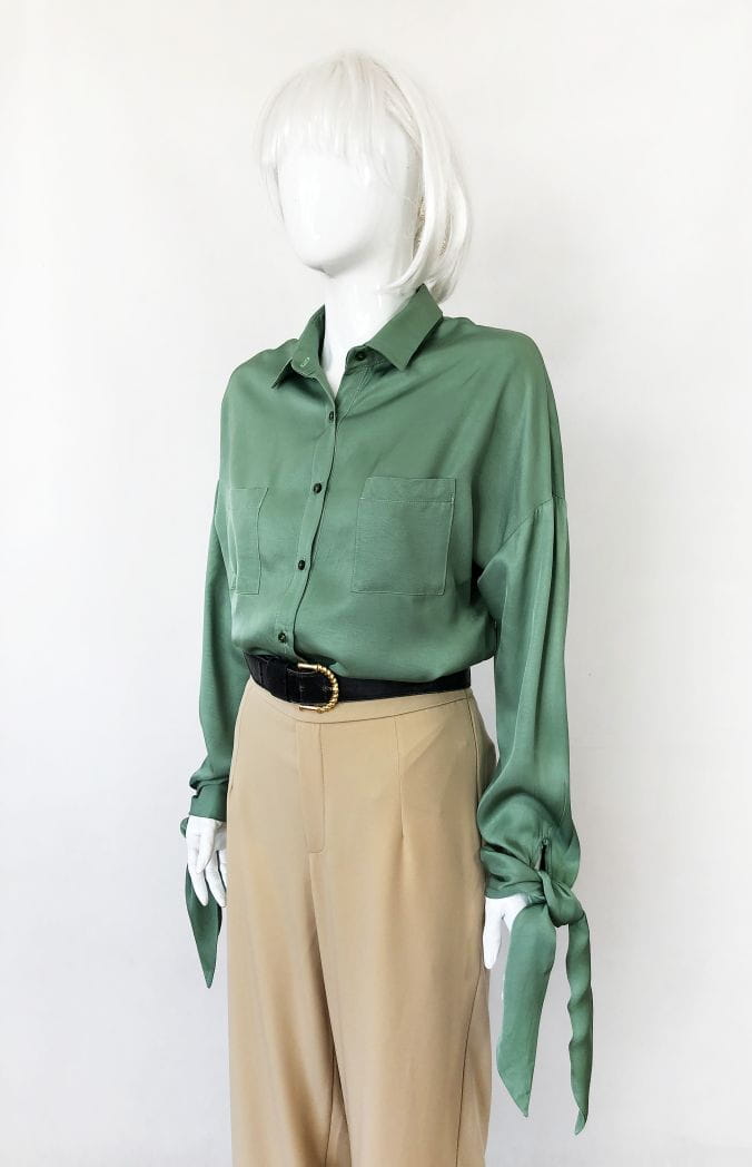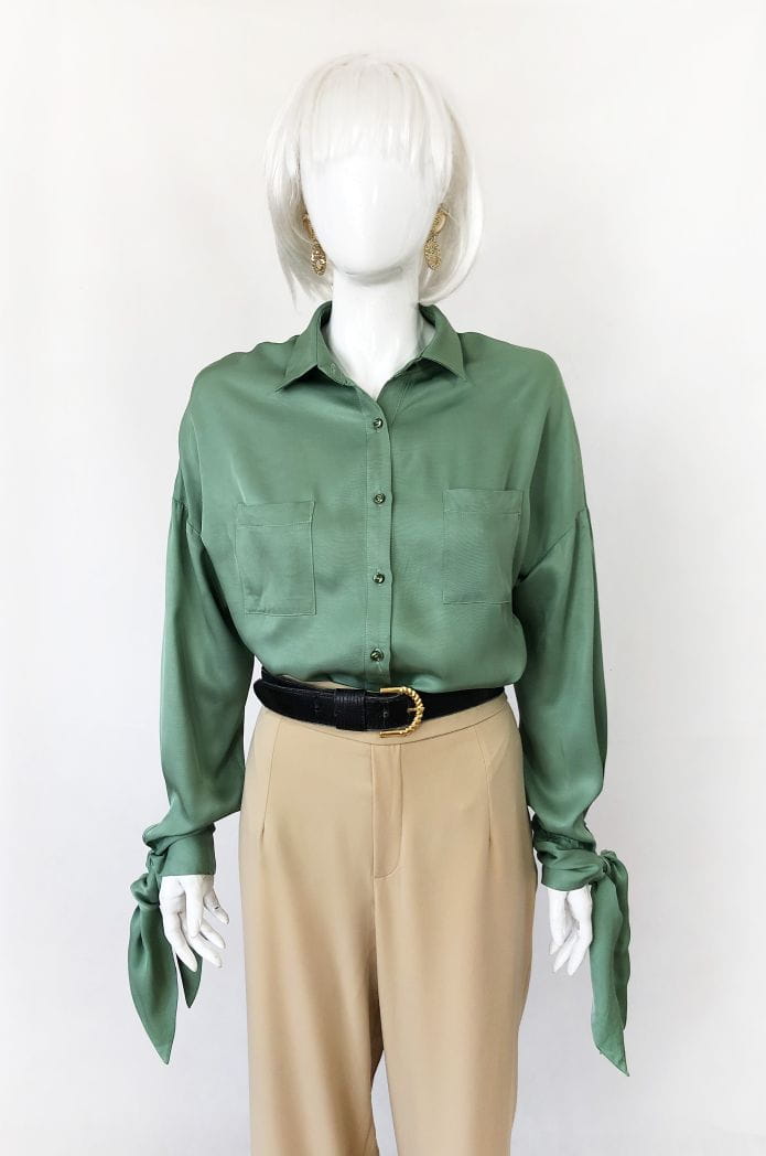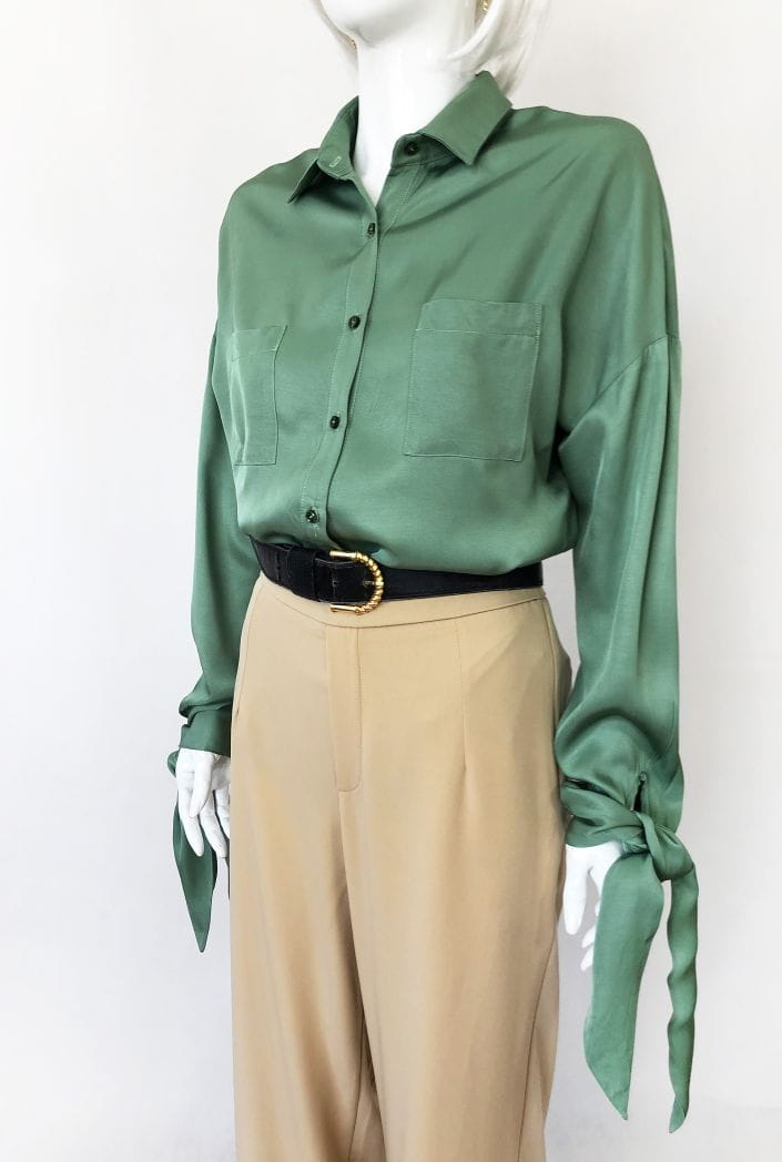 Koszula od Łukasza Jemioła , model Tuluza w zielonym odcieniu. Rozpinany, luźniejszy fason. Długie rękawy podrasowane przy mankietach efektownym wiązaniem.