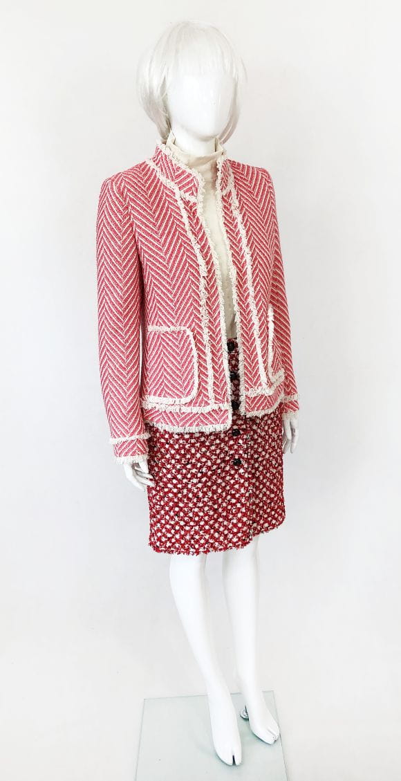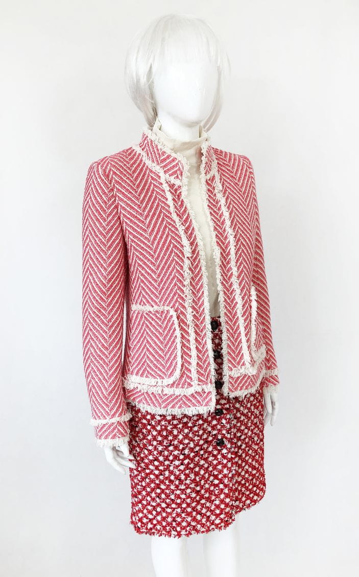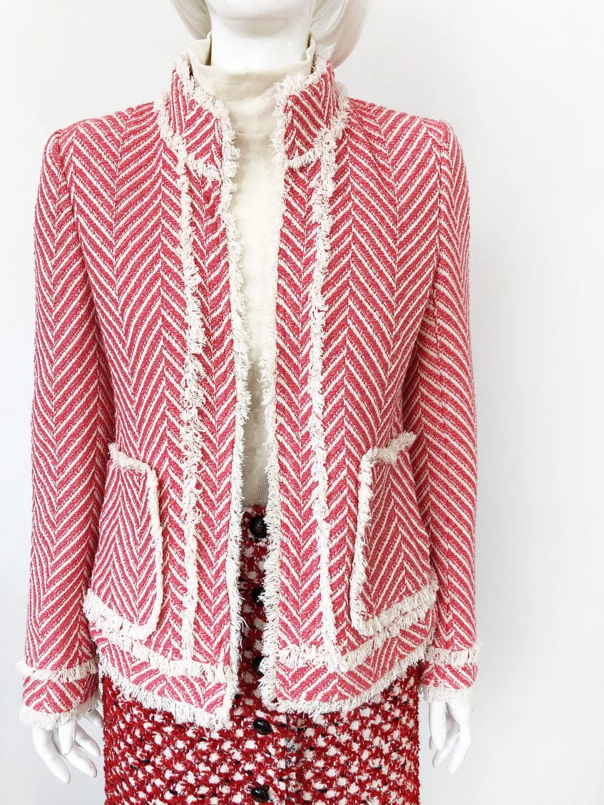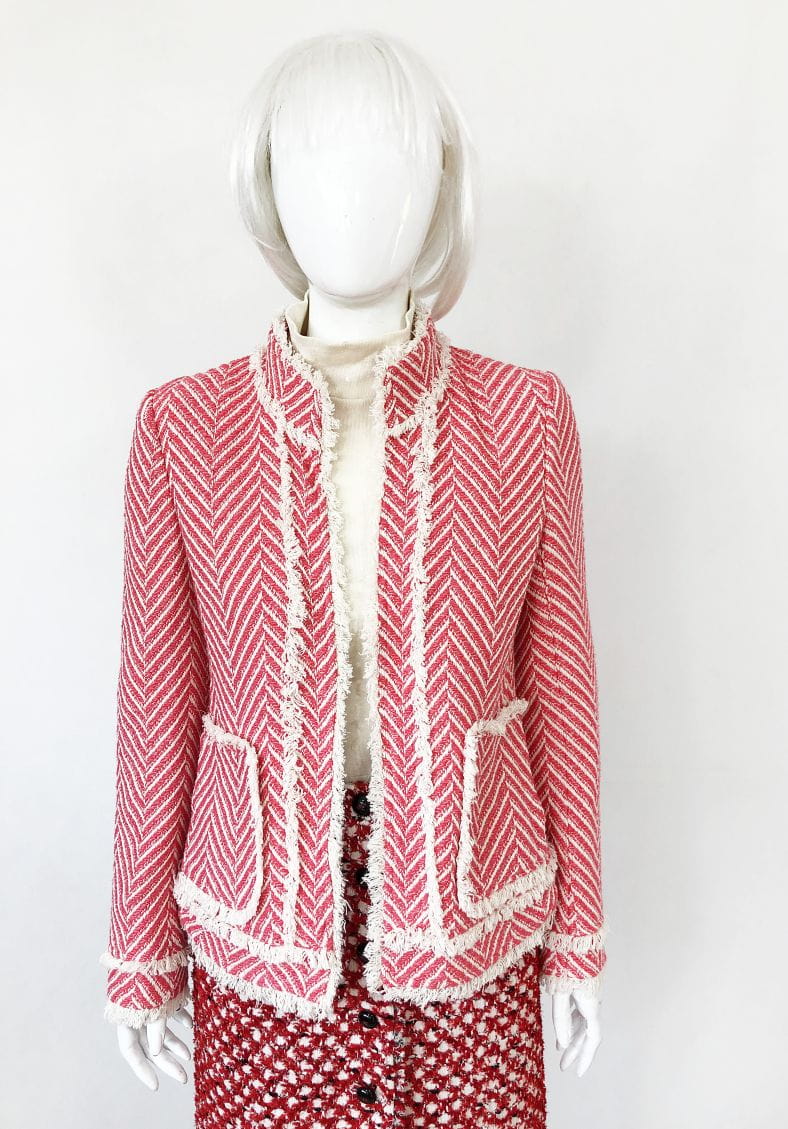 Stylowa marynarka projektu marki Marc Aurel w tweedowym stylu. Wykończenia z drobnych frędzli. Różowo-kremowy deseń. U dołu duże kieszenie. Model ze stójką.