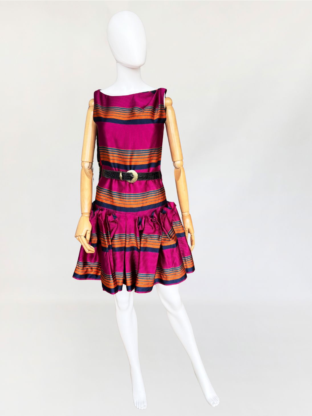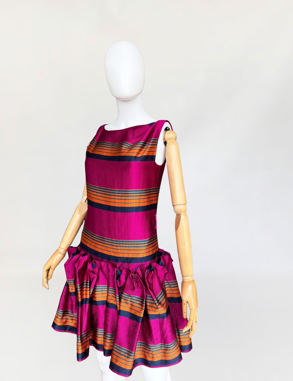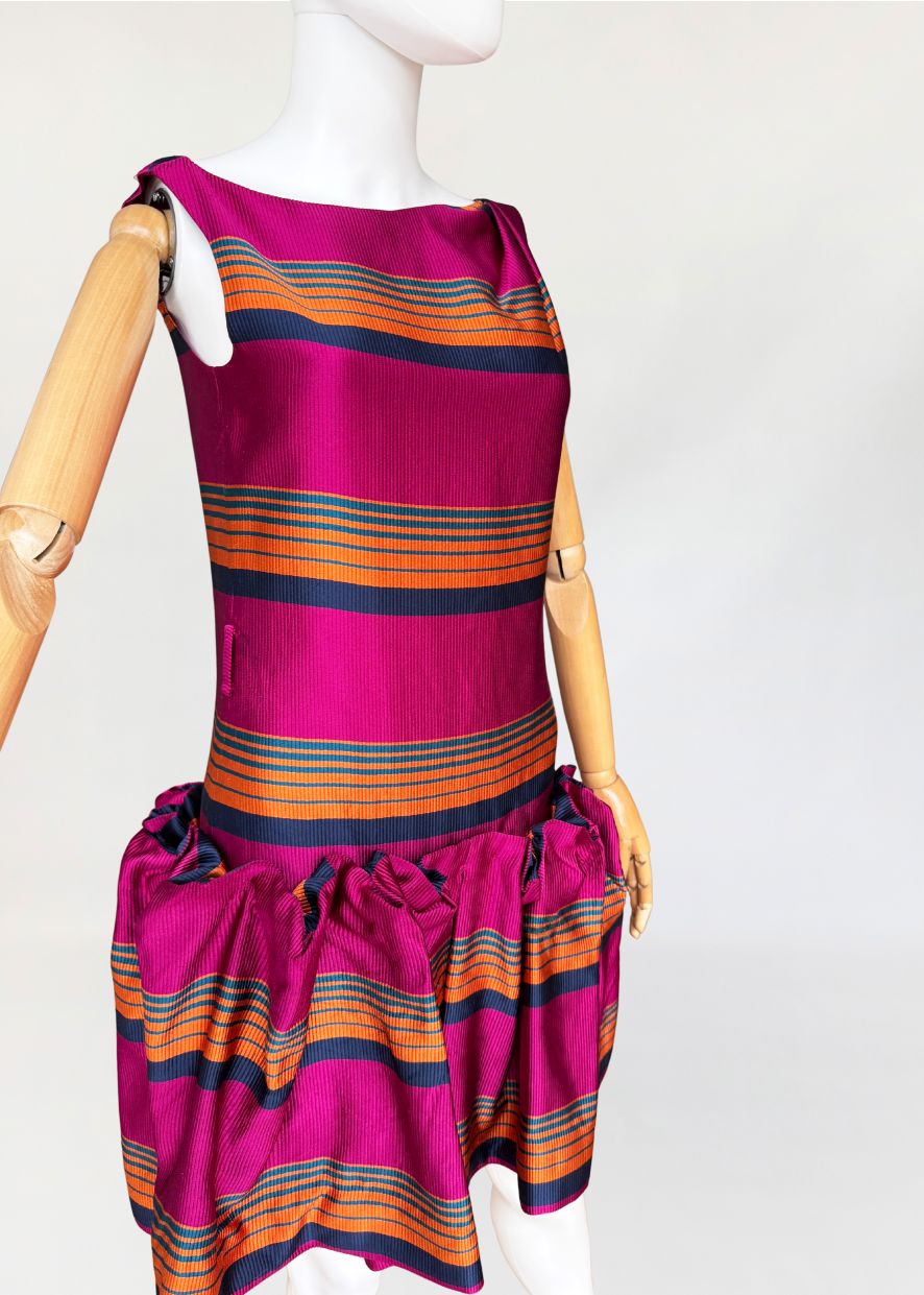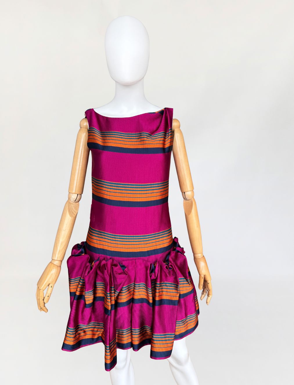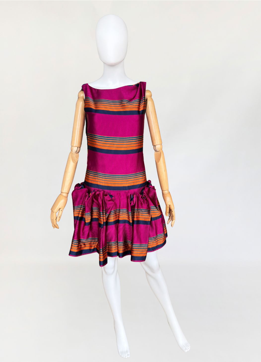 Sukienka vintage marki Marc Jacobs, wykonana z lekkiej, rypsowej tkaniny jedwabnej w kolorze magenta, z nieregularnymi pasami w odcieniach granatu, indygo i pomarańczu. Góra bez rękawów, z płytkim dekoltem. Na wysokości bioder wyraziste drapowania, od których konstrukcja stopniowo się poszerza.
