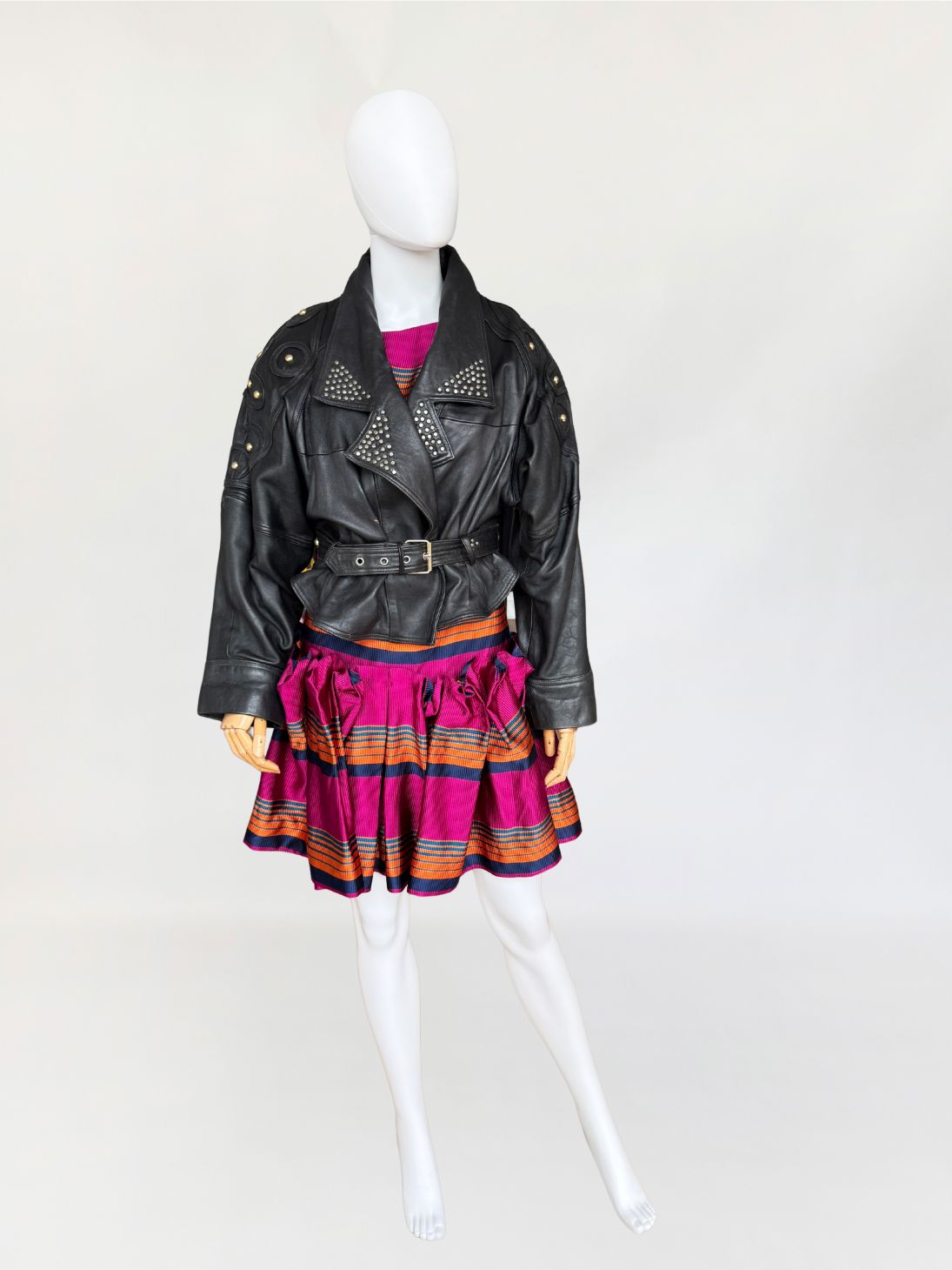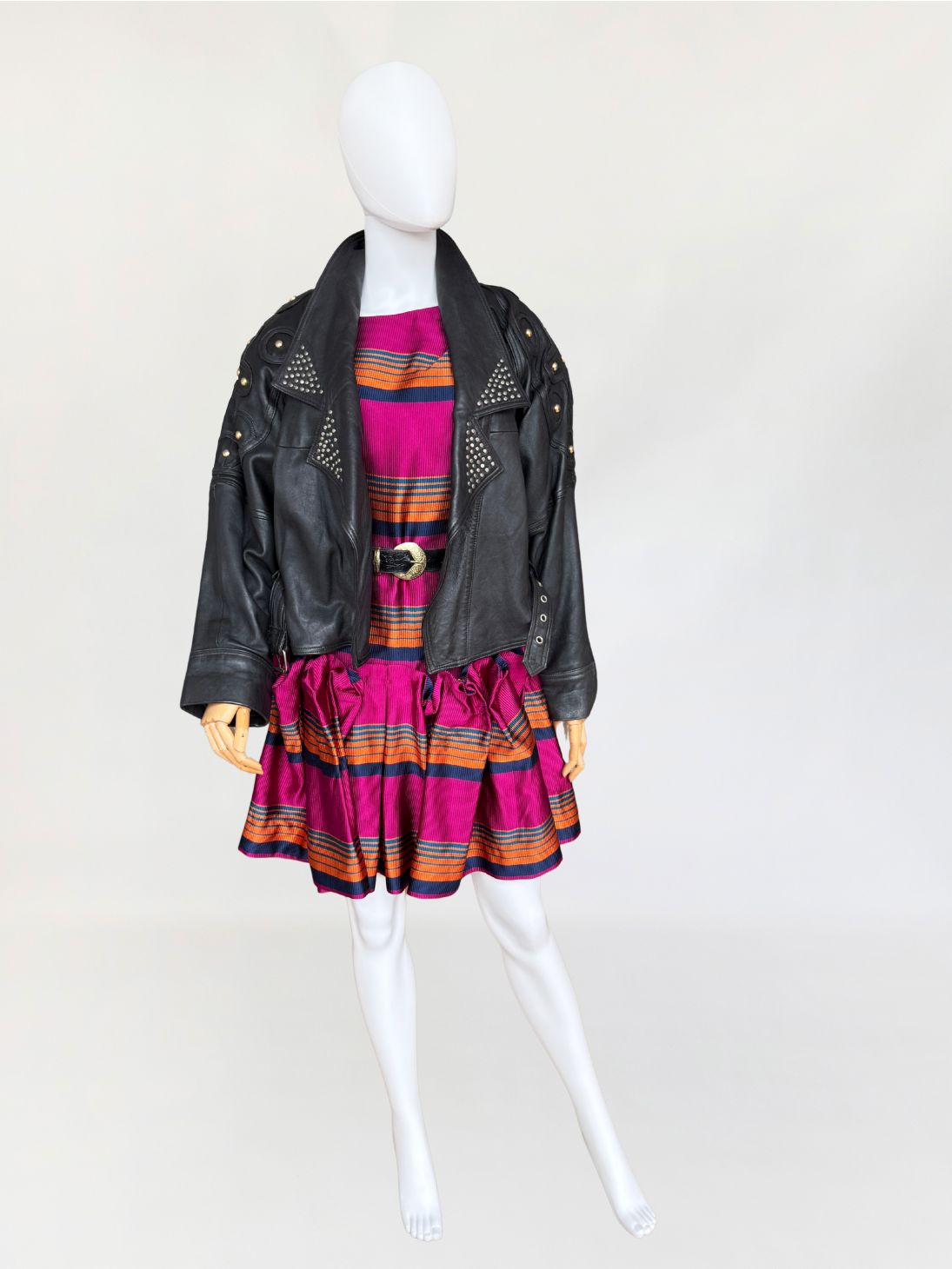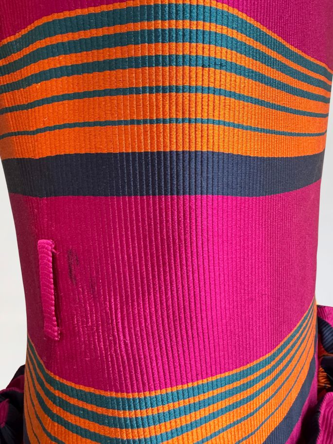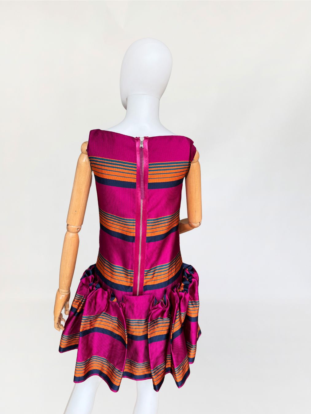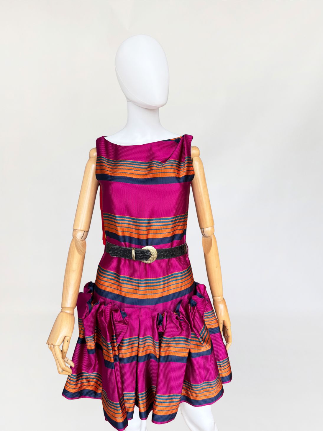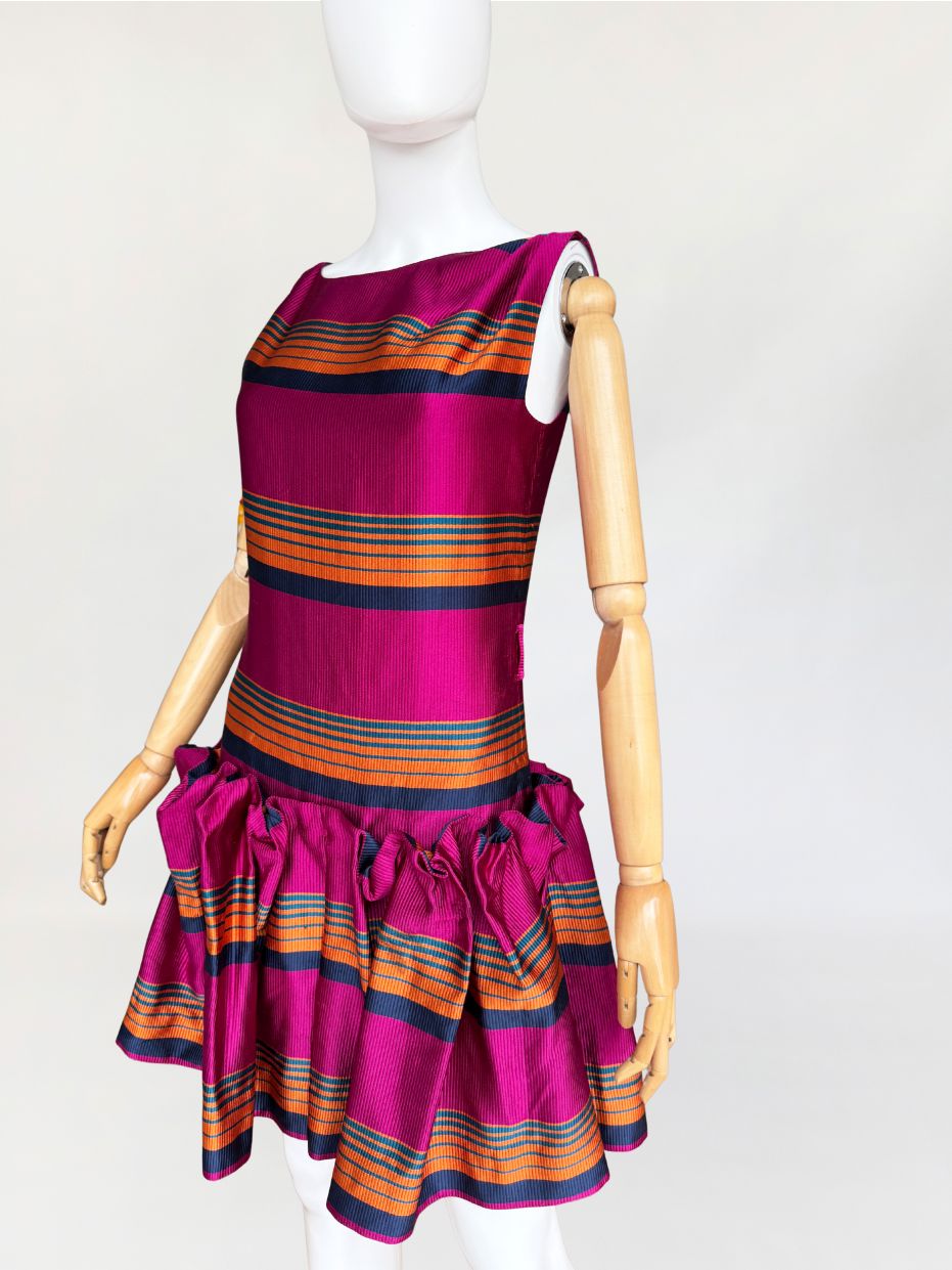 Sukienka vintage marki Marc Jacobs, wykonana z lekkiej, rypsowej tkaniny jedwabnej w kolorze magenta, z nieregularnymi pasami w odcieniach granatu, indygo i pomarańczu. Góra bez rękawów, z płytkim dekoltem. Na wysokości bioder wyraziste drapowania, od których konstrukcja stopniowo się poszerza.