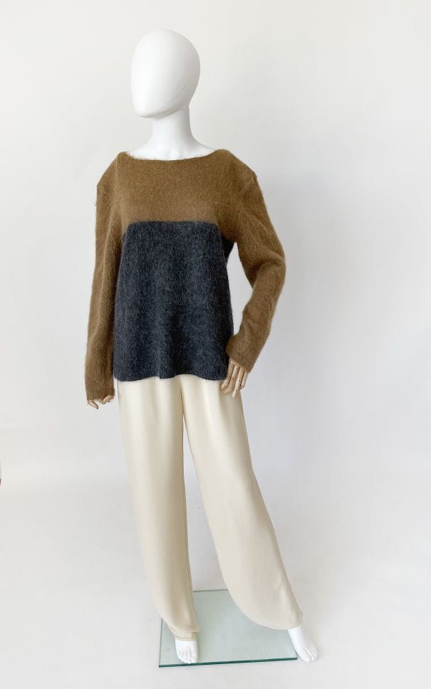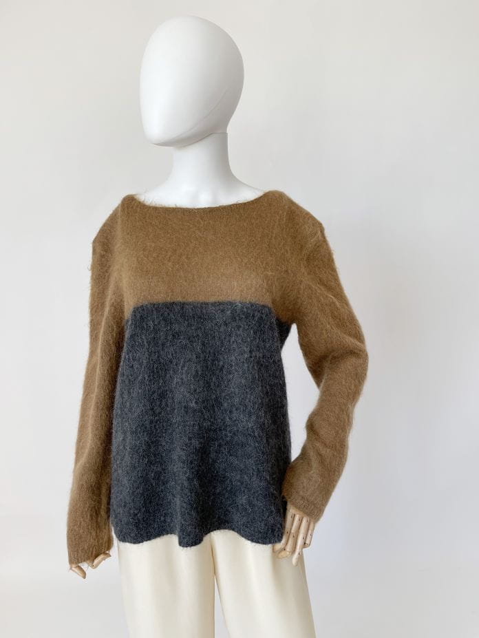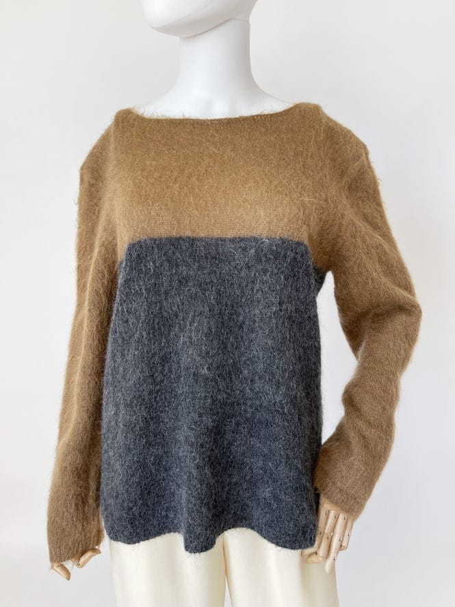 Puszysty sweter wykonany z lekkiej wełnianej dzianiny w odcieniach beżu i szarości. Całoroczny, klasyczny model z okrągłym dekoltem i długimi rękawami.