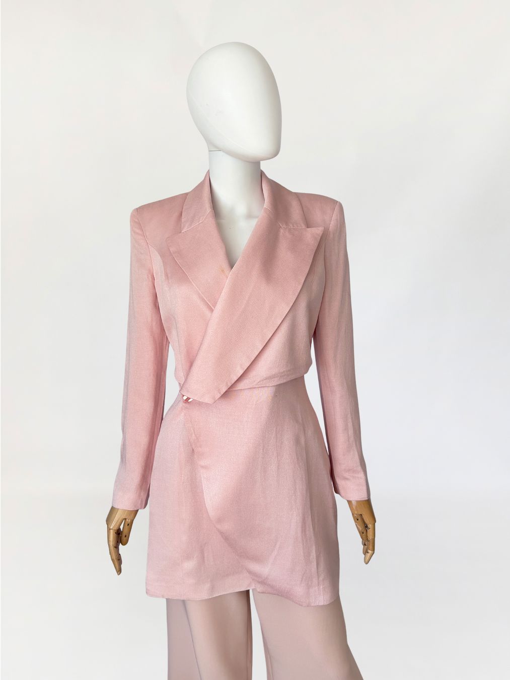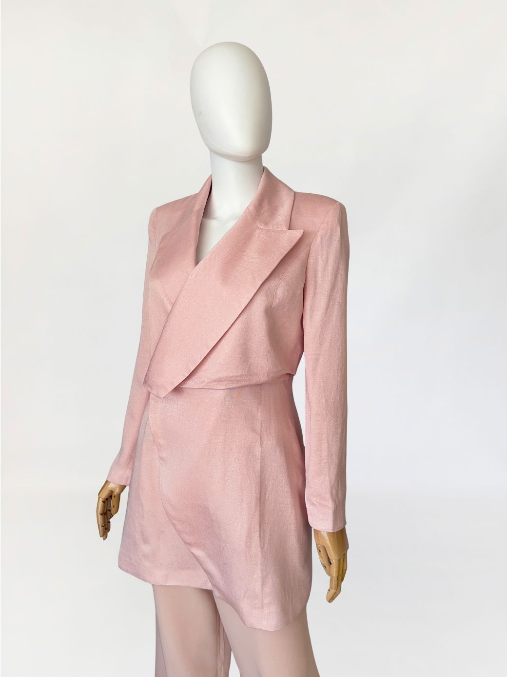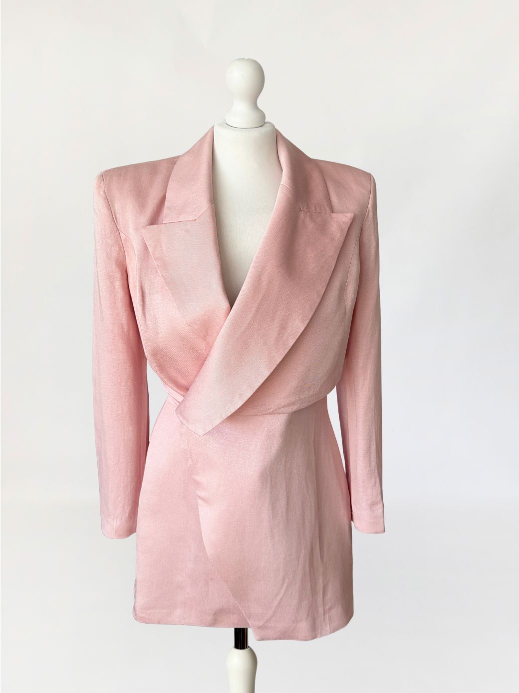 Współczesna sukienka/marynarka włoskiej topowej marki MVP od Maria Vittoria Paolillo. Wykonana z tkaniny o składzie 52% wiskoza, 27% len, 21% bawełna w odcieniu cukierkowego różu. Przód o konstrukcji kopertowej, z szeroką, nakładaną połą tworzącą głęboki dekolt w kształcie litery V. Kołnierz wykładany o wydłużonej linii, płynnie przechodzący w przednią część. Zapięcie w talii na dwa guziki osadzone w jednej linii, ukryte w konstrukcji kopertowej. Linia ramion mocno rozbudowana, z wyraźnymi poduchami konstrukcyjnymi nadającymi geometryczny kształt górnej partii. Długie rękawy, prosto wszyte. Tył gładki, z zaszewkami modelującymi linię pleców. Długość przedłużona do formy krótkiej sukienki/marynarki typu longline. Możesz nosić ją jako marynarkę lub krótką sukienkę.