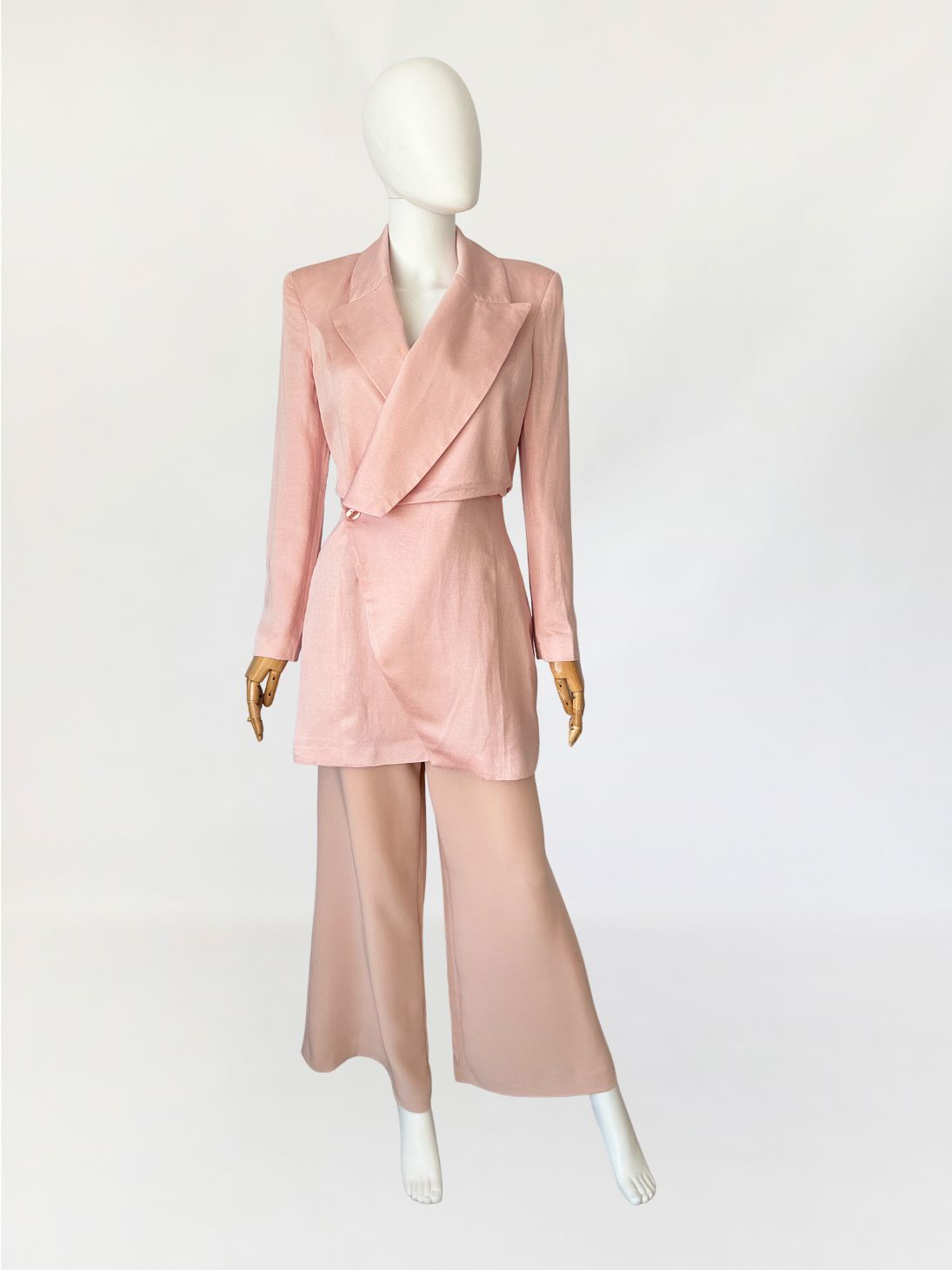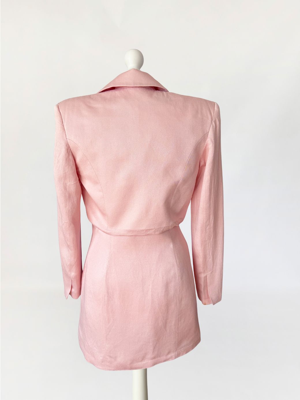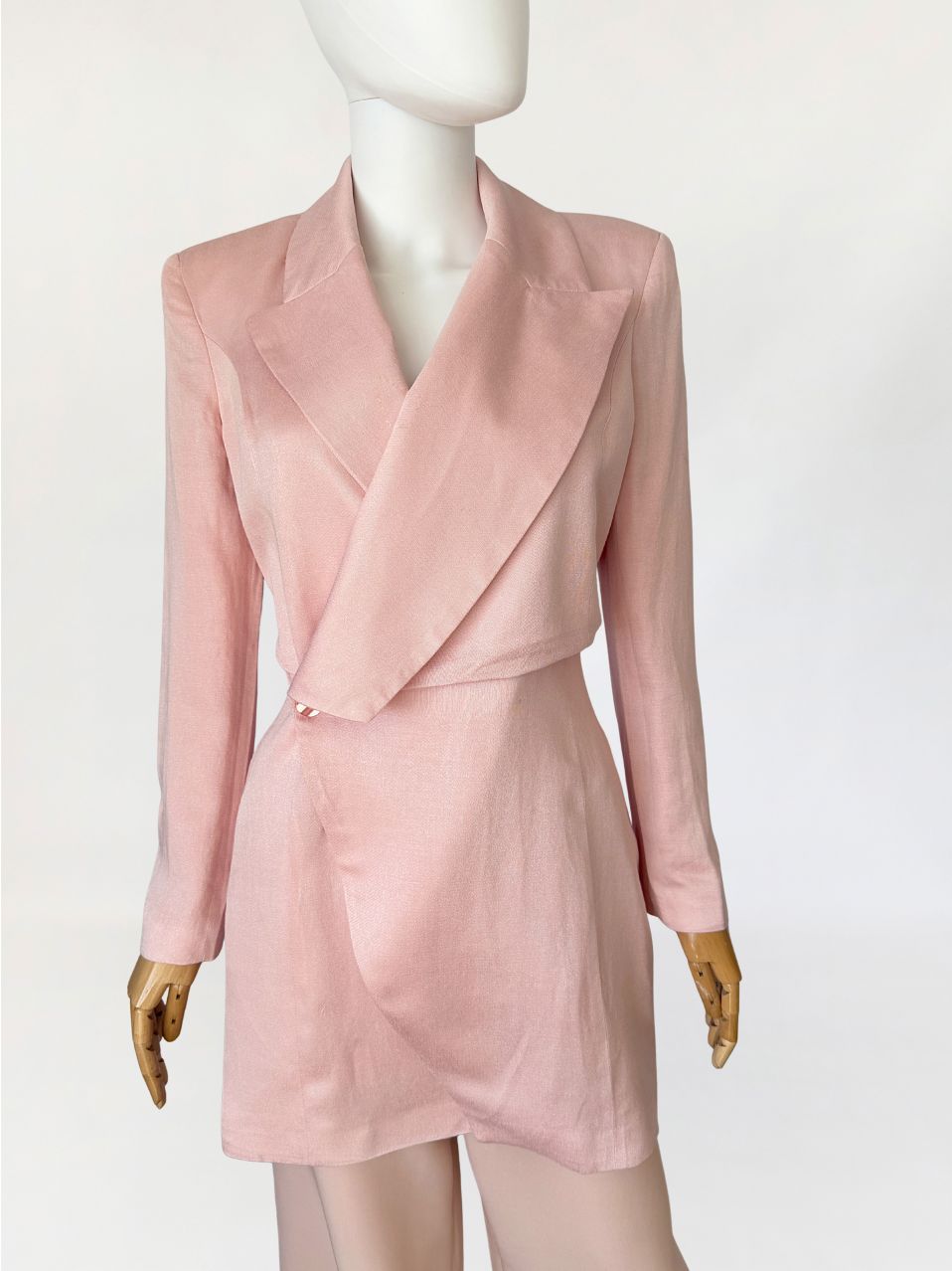 Współczesna sukienka/marynarka włoskiej topowej marki MVP od Maria Vittoria Paolillo. Wykonana z tkaniny o składzie 52% wiskoza, 27% len, 21% bawełna w odcieniu cukierkowego różu. Przód o konstrukcji kopertowej, z szeroką, nakładaną połą tworzącą głęboki dekolt w kształcie litery V. Kołnierz wykładany o wydłużonej linii, płynnie przechodzący w przednią część. Zapięcie w talii na dwa guziki osadzone w jednej linii, ukryte w konstrukcji kopertowej. Linia ramion mocno rozbudowana, z wyraźnymi poduchami konstrukcyjnymi nadającymi geometryczny kształt górnej partii. Długie rękawy, prosto wszyte. Tył gładki, z zaszewkami modelującymi linię pleców. Długość przedłużona do formy krótkiej sukienki/marynarki typu longline. Możesz nosić ją jako marynarkę lub krótką sukienkę.