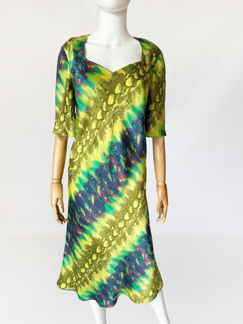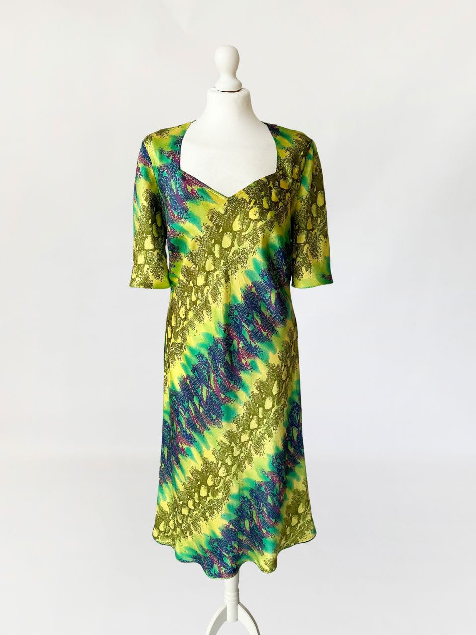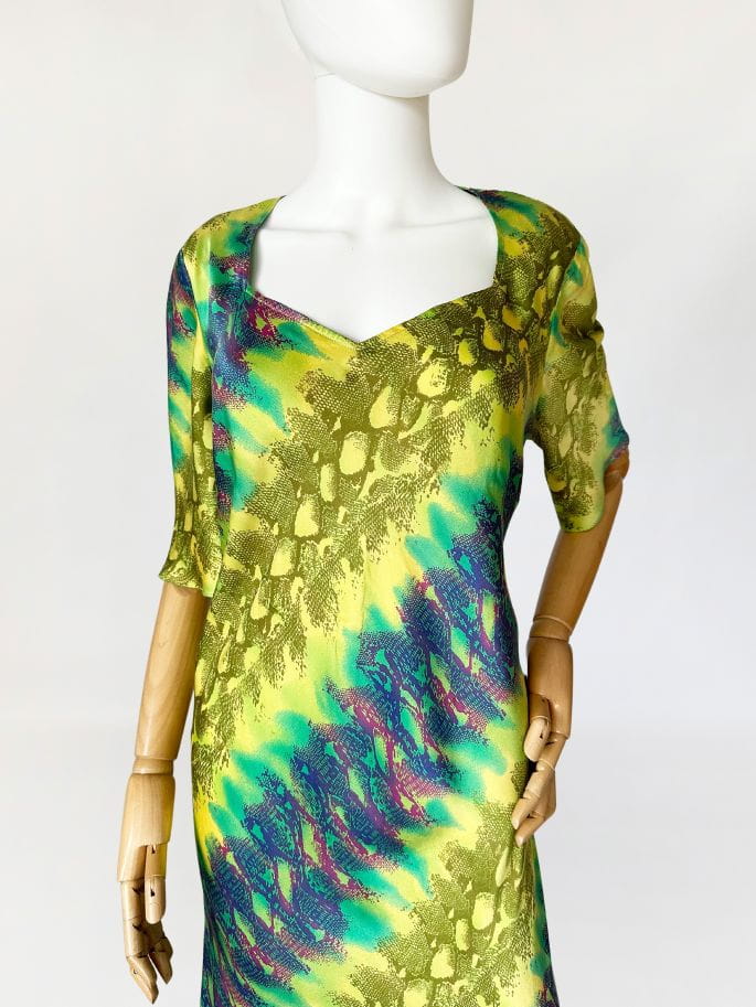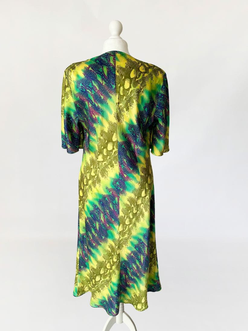 Długa sukienka o swobodnym kroju, model luksusowej włoskiej marki Mariella Burani. Wykonana w całości z jedwabnej satyny w barwne wzory. Góra z krótkimi rękawami i dekoltem "v".