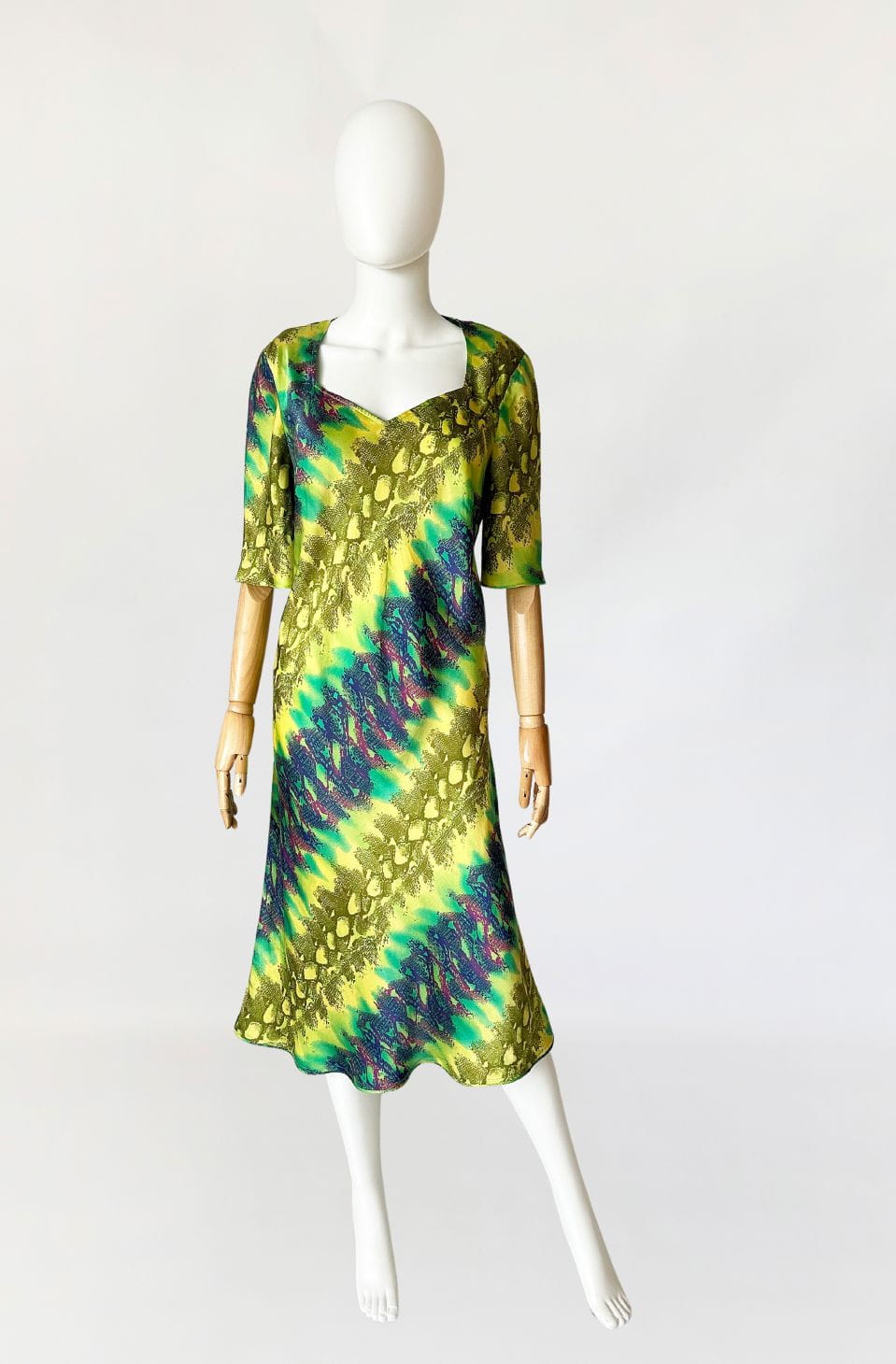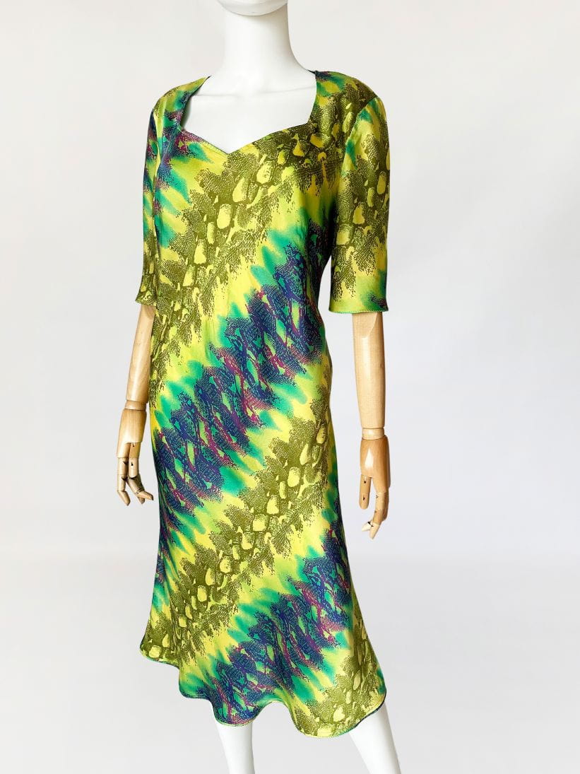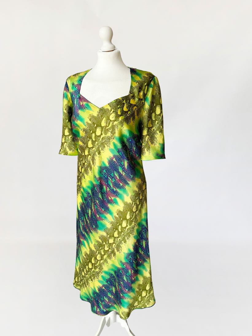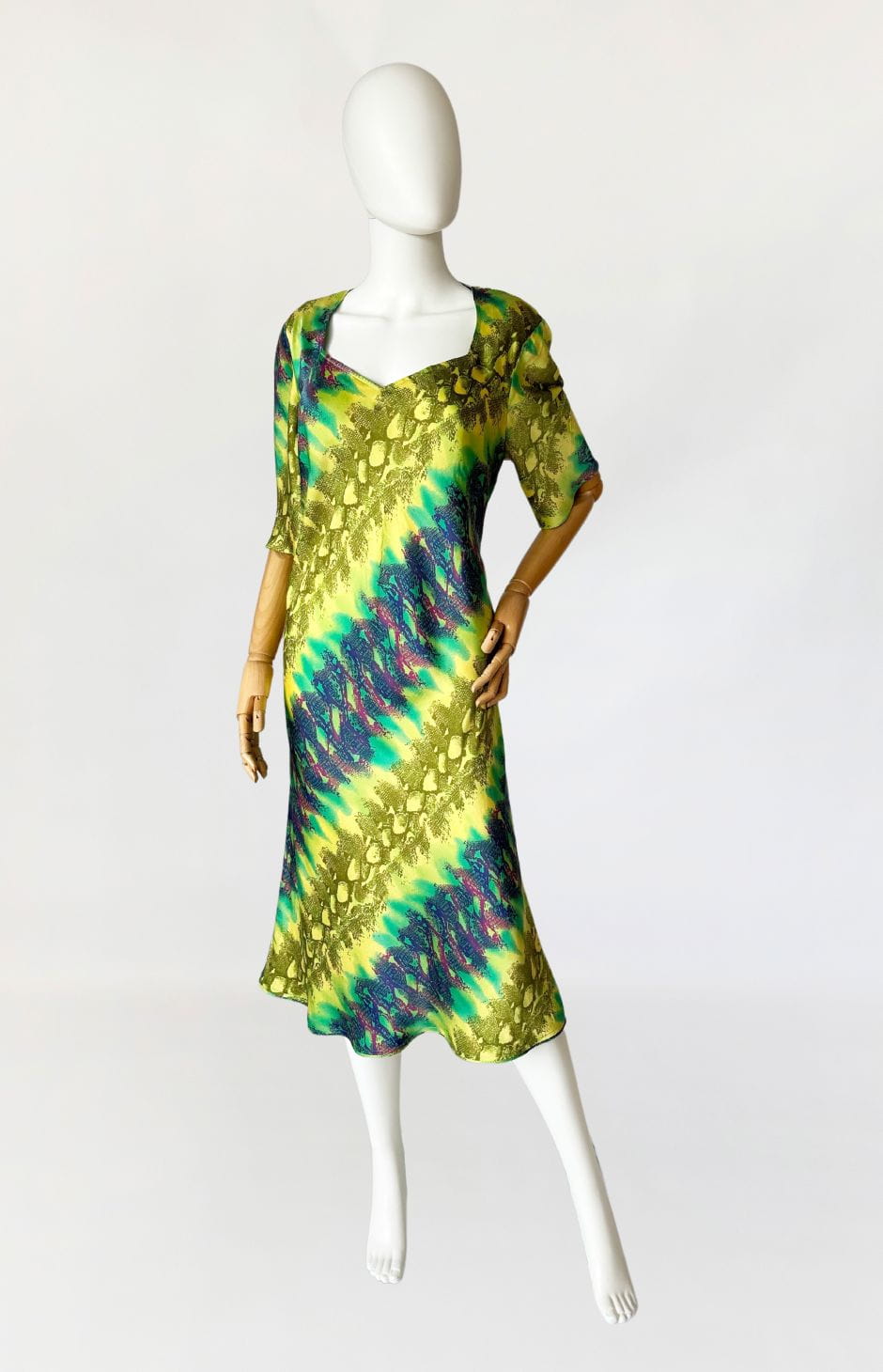Długa sukienka o swobodnym kroju, model luksusowej włoskiej marki Mariella Burani. Wykonana w całości z jedwabnej satyny w barwne wzory. Góra z krótkimi rękawami i dekoltem "v".
