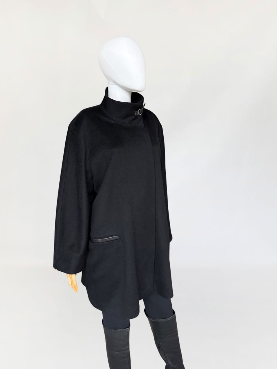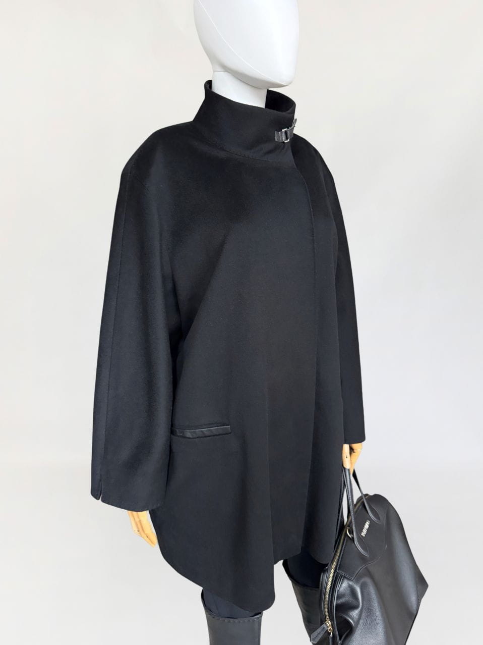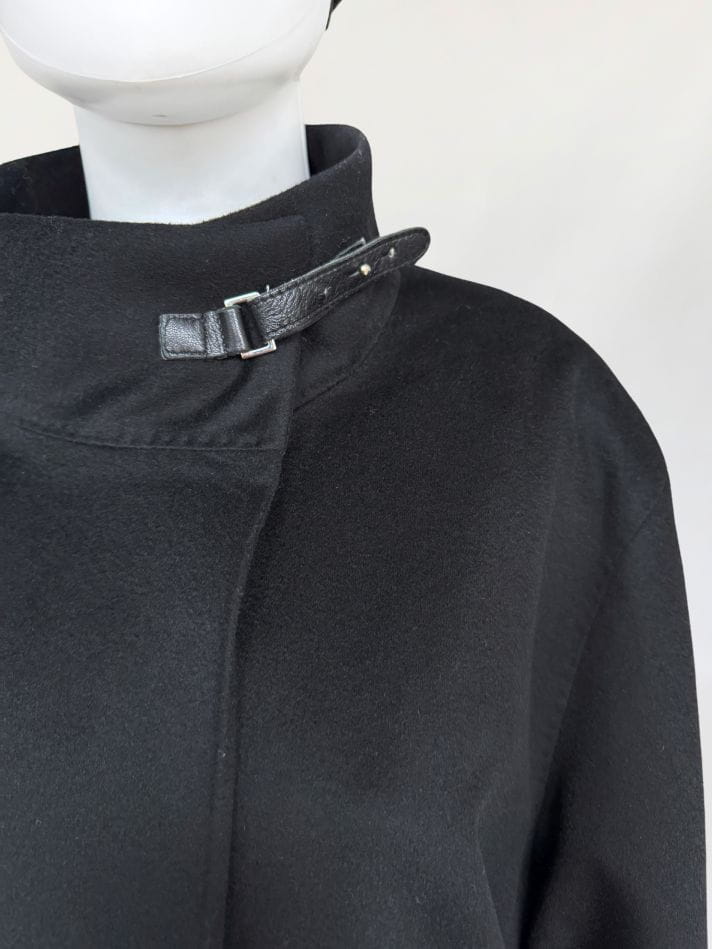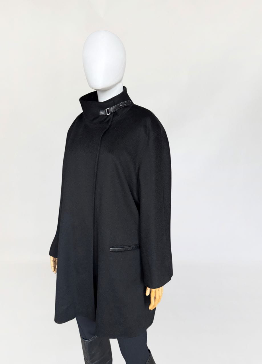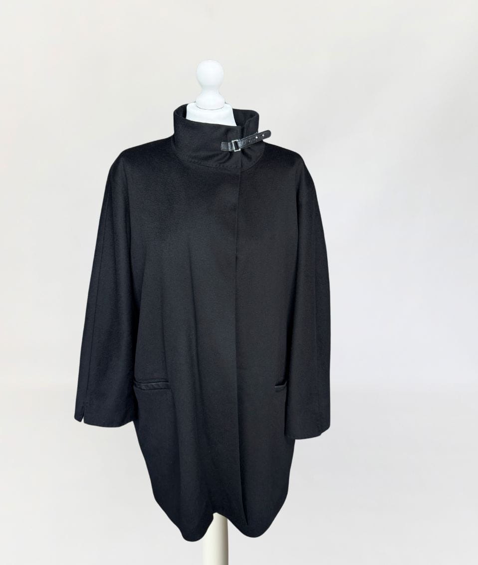Minimalistyczna kurtka w stylu quiet luxury, luksusowej włoskiej marki Marina Rinaldi, należącej do grupy Max Mara. Wykonana z doskonałej jakości wełny dziewiczej, Wełna jest wspaniale miękka, gładka jak tafla wody, kruczoczarna - gdyby nie metka, powiedzielibyśmy, że tkanina to kaszmir. Swobodny, pudełkowy oversize'owy fason z długimi rękawami. Kołnierz typu stójka, przepinany skórzanym paskiem. W dolnej części kieszenie obszyte skórką. Kurtka jest zapinana na jeden guzik na wysokości pasa (od wewnątrz). Można go przeszyć, aby uzyskać kilka cm różnicy w obwodzie. Całość na logowanej podszewce.
