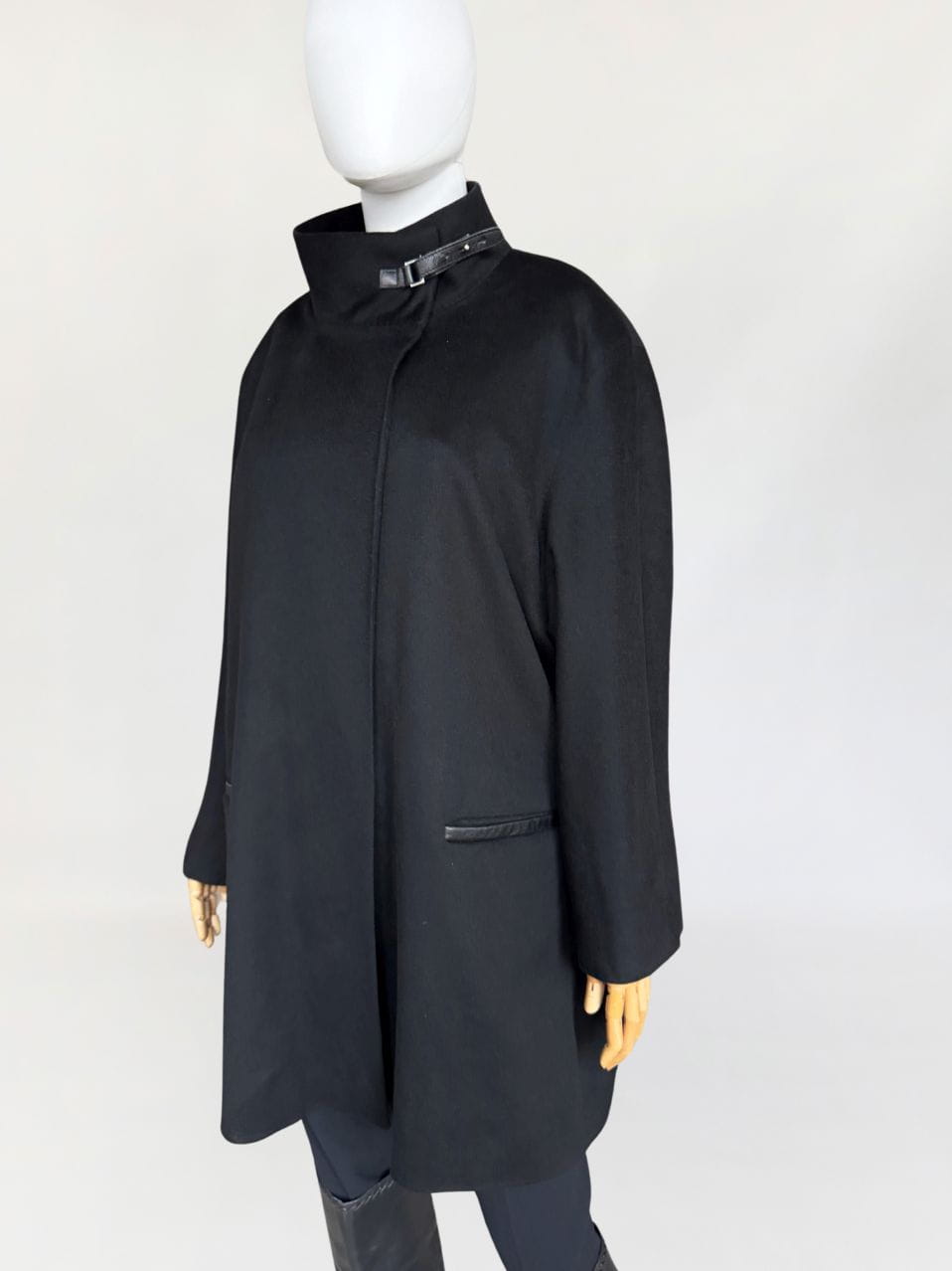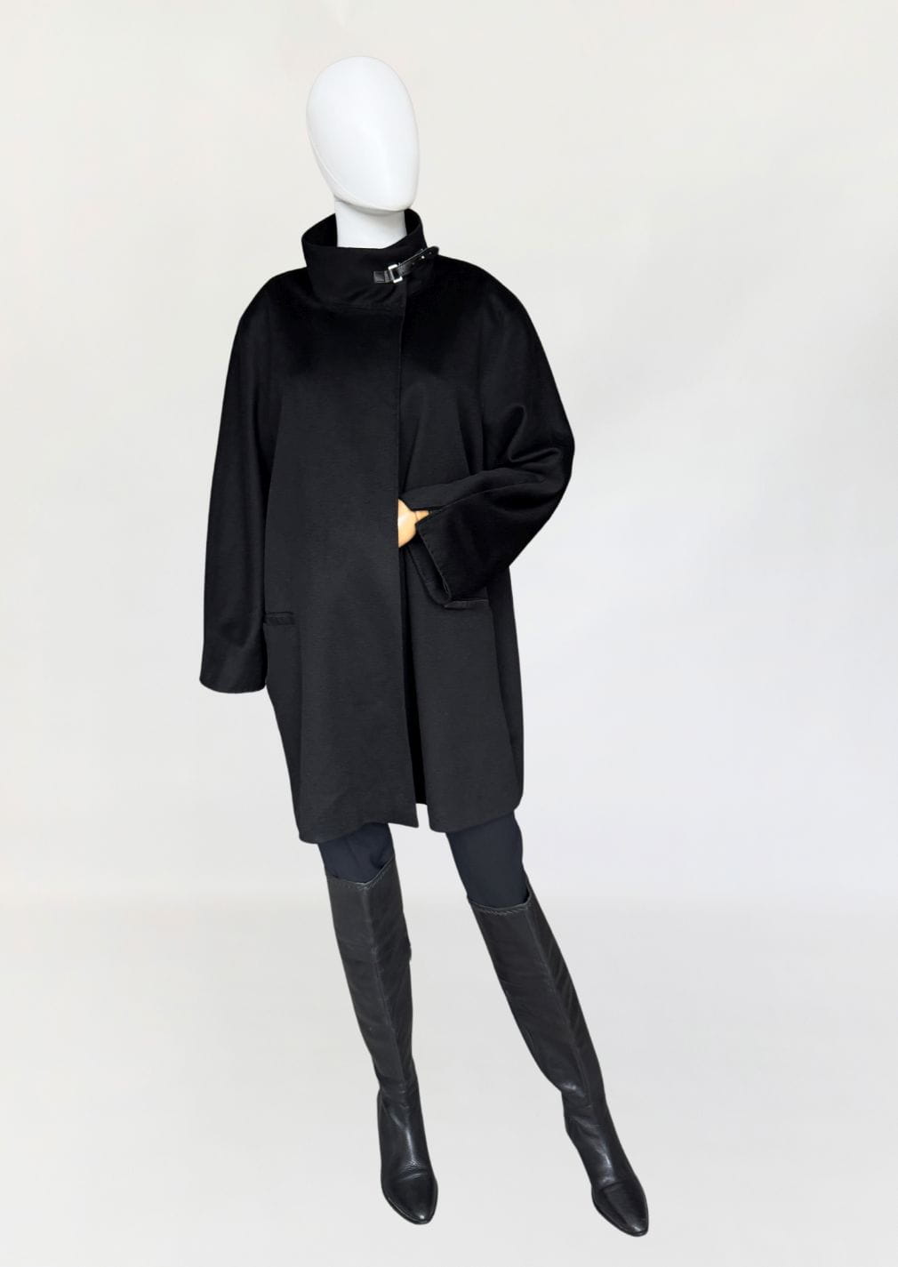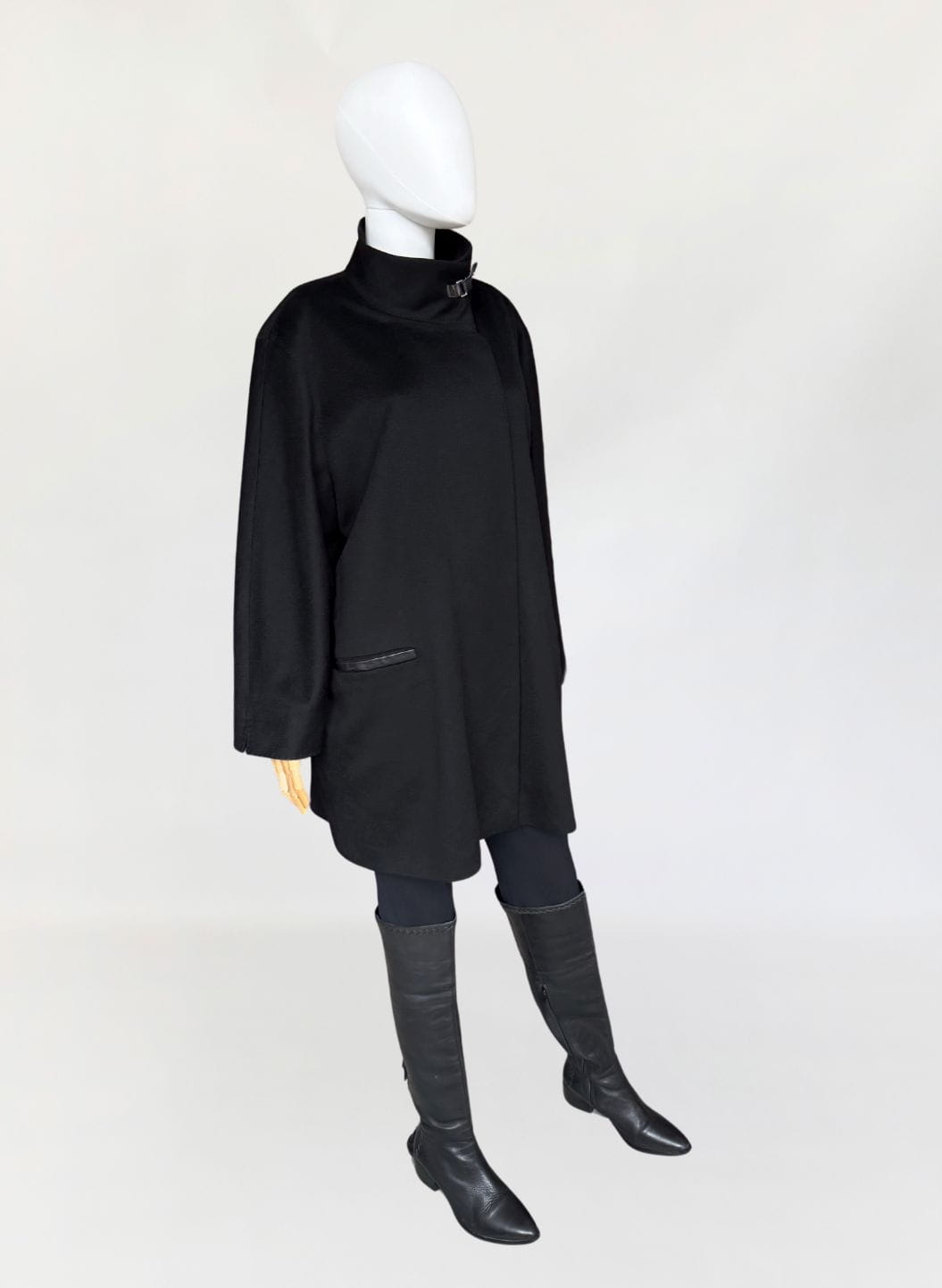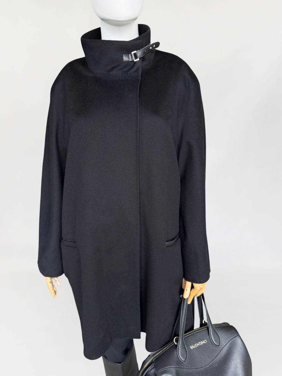 Minimalistyczna kurtka w stylu quiet luxury, luksusowej włoskiej marki Marina Rinaldi, należącej do grupy Max Mara. Wykonana z doskonałej jakości wełny dziewiczej, Wełna jest wspaniale miękka, gładka jak tafla wody, kruczoczarna - gdyby nie metka, powiedzielibyśmy, że tkanina to kaszmir. Swobodny, pudełkowy oversize'owy fason z długimi rękawami. Kołnierz typu stójka, przepinany skórzanym paskiem. W dolnej części kieszenie obszyte skórką. Kurtka jest zapinana na jeden guzik na wysokości pasa (od wewnątrz). Można go przeszyć, aby uzyskać kilka cm różnicy w obwodzie. Całość na logowanej podszewce.