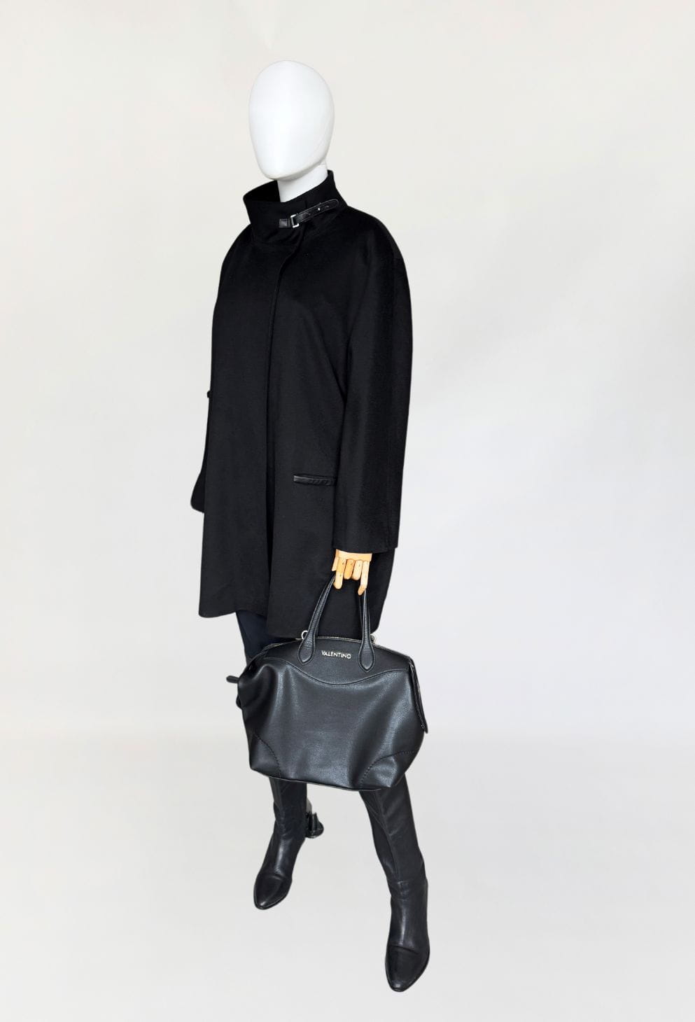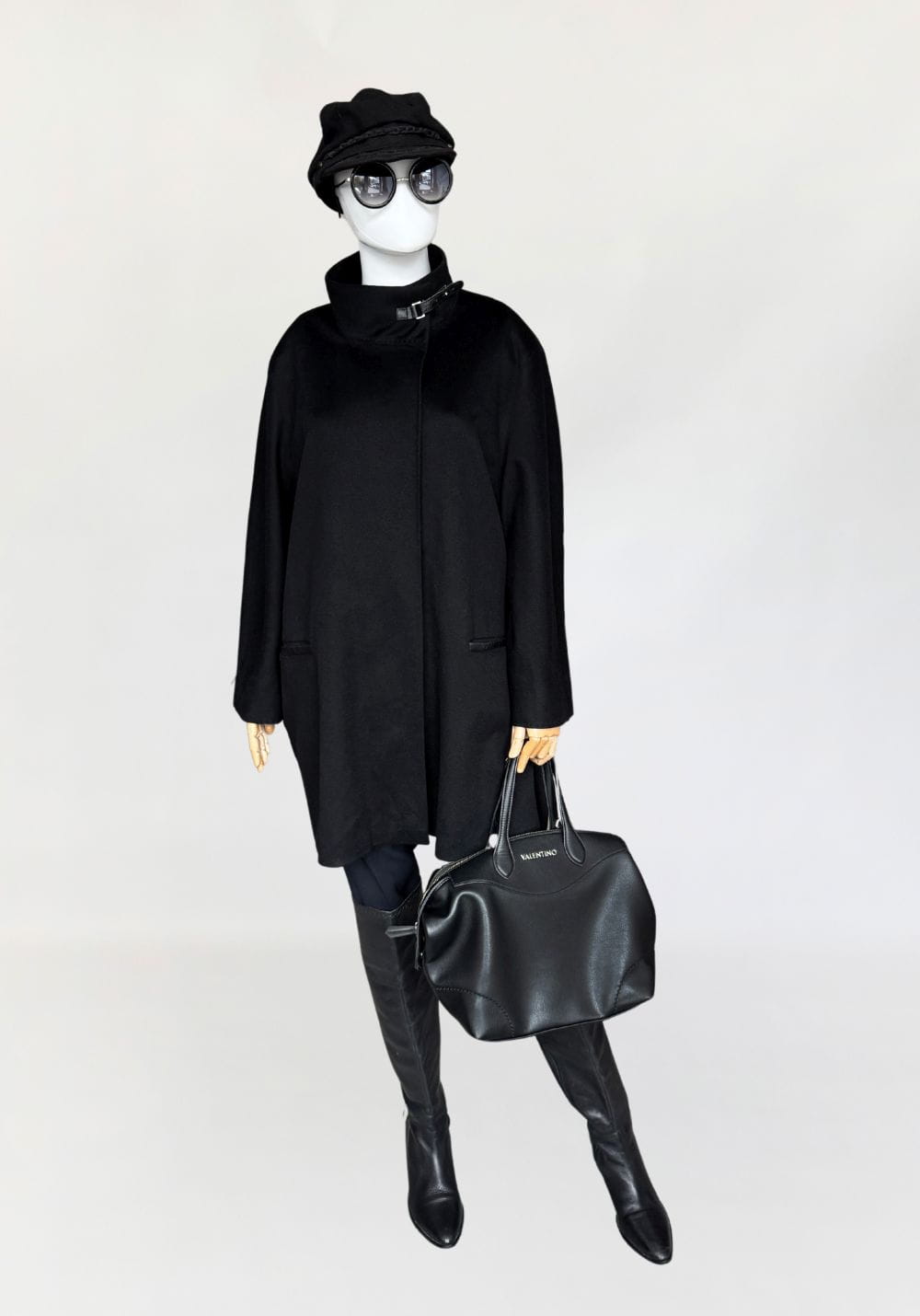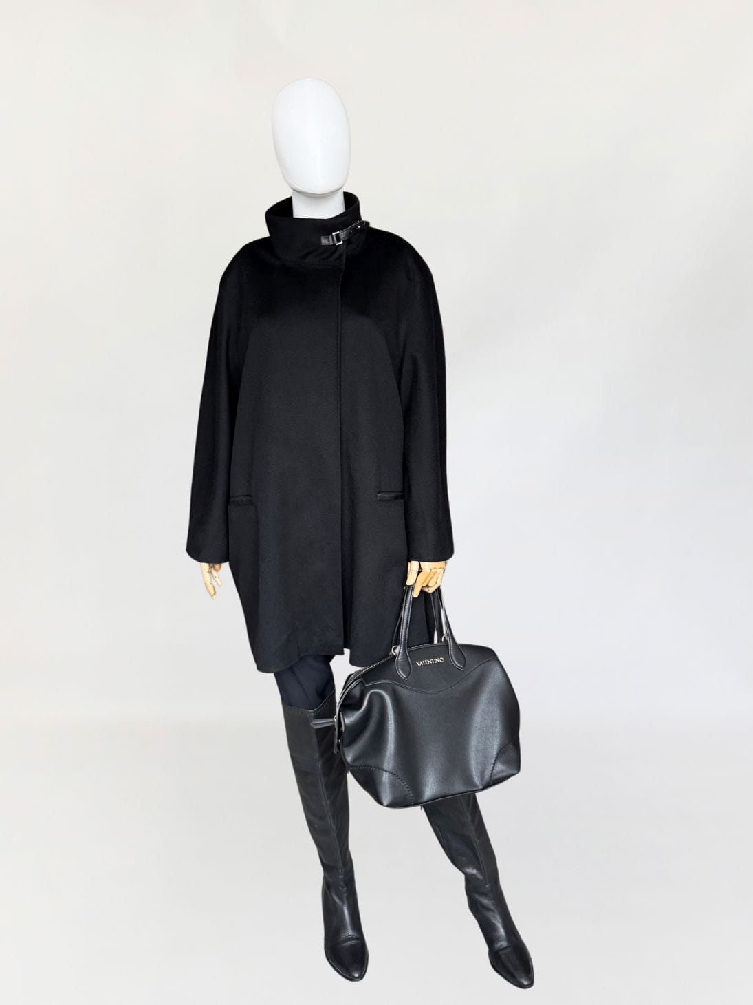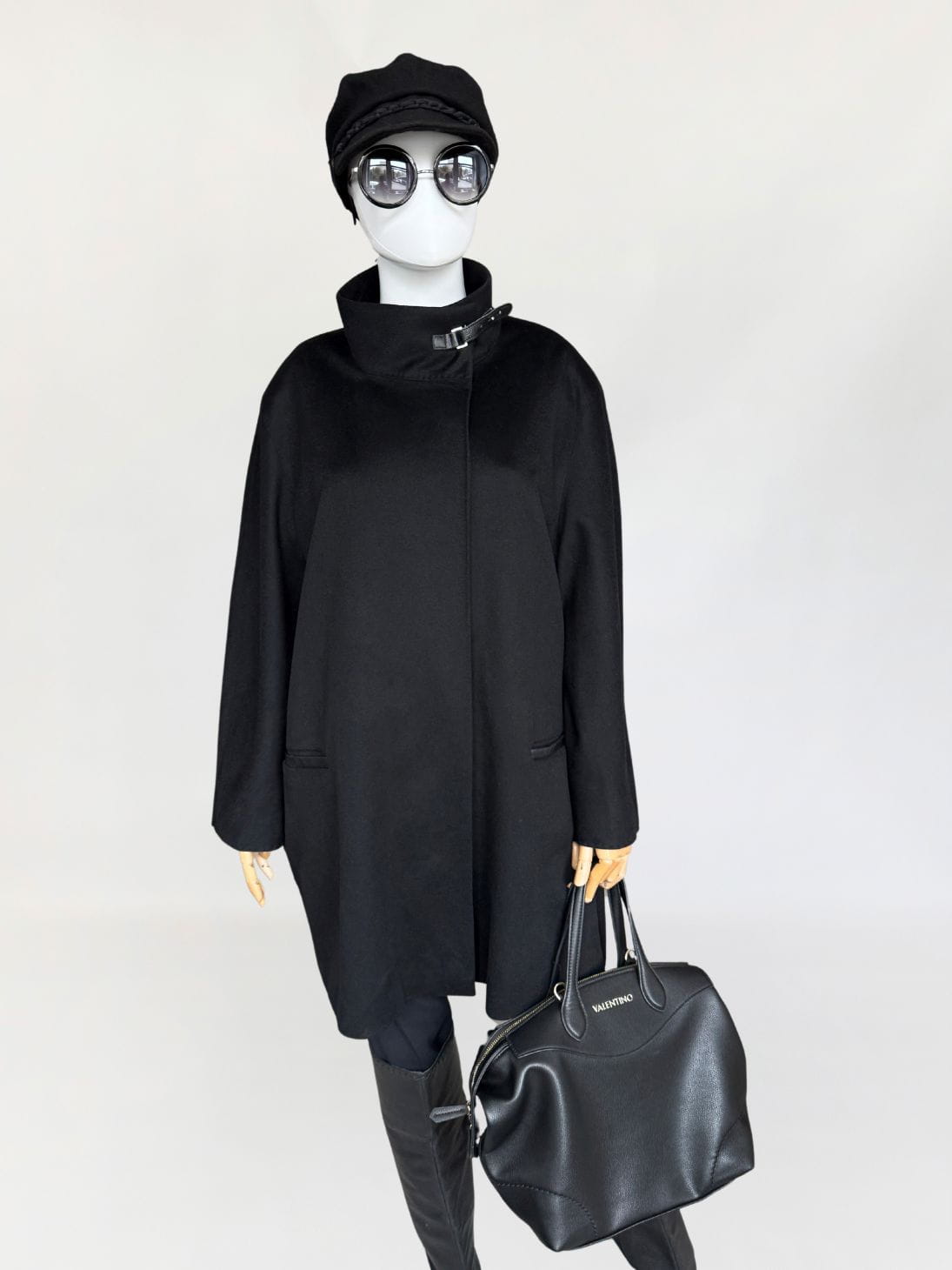 Minimalistyczna kurtka w stylu quiet luxury, luksusowej włoskiej marki Marina Rinaldi, należącej do grupy Max Mara. Wykonana z doskonałej jakości wełny dziewiczej, Wełna jest wspaniale miękka, gładka jak tafla wody, kruczoczarna - gdyby nie metka, powiedzielibyśmy, że tkanina to kaszmir. Swobodny, pudełkowy oversize'owy fason z długimi rękawami. Kołnierz typu stójka, przepinany skórzanym paskiem. W dolnej części kieszenie obszyte skórką. Kurtka jest zapinana na jeden guzik na wysokości pasa (od wewnątrz). Można go przeszyć, aby uzyskać kilka cm różnicy w obwodzie. Całość na logowanej podszewce.