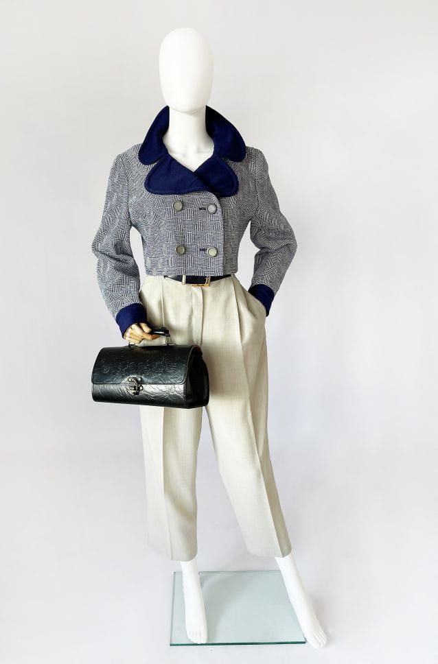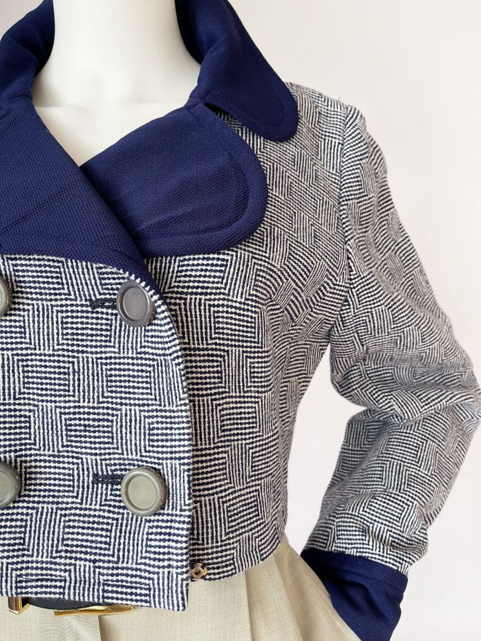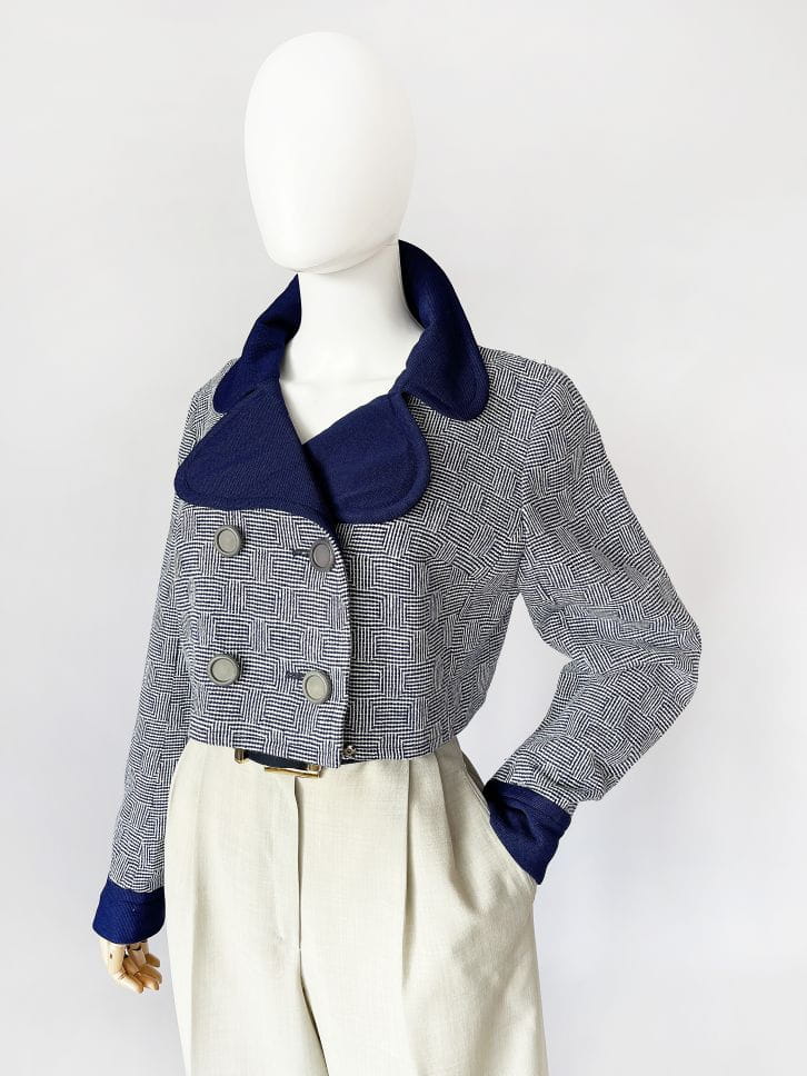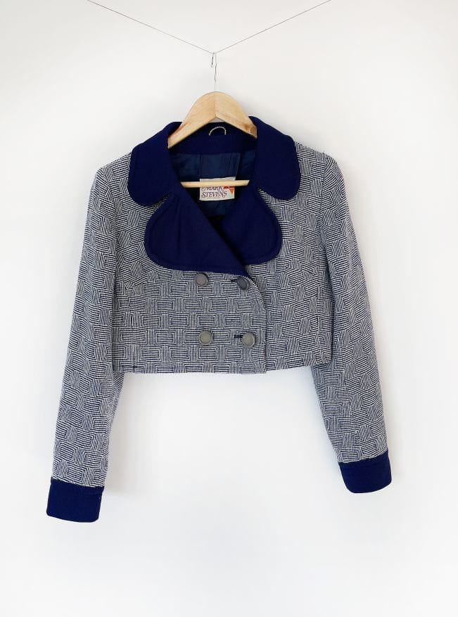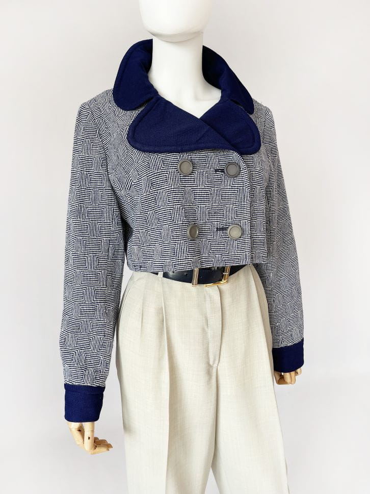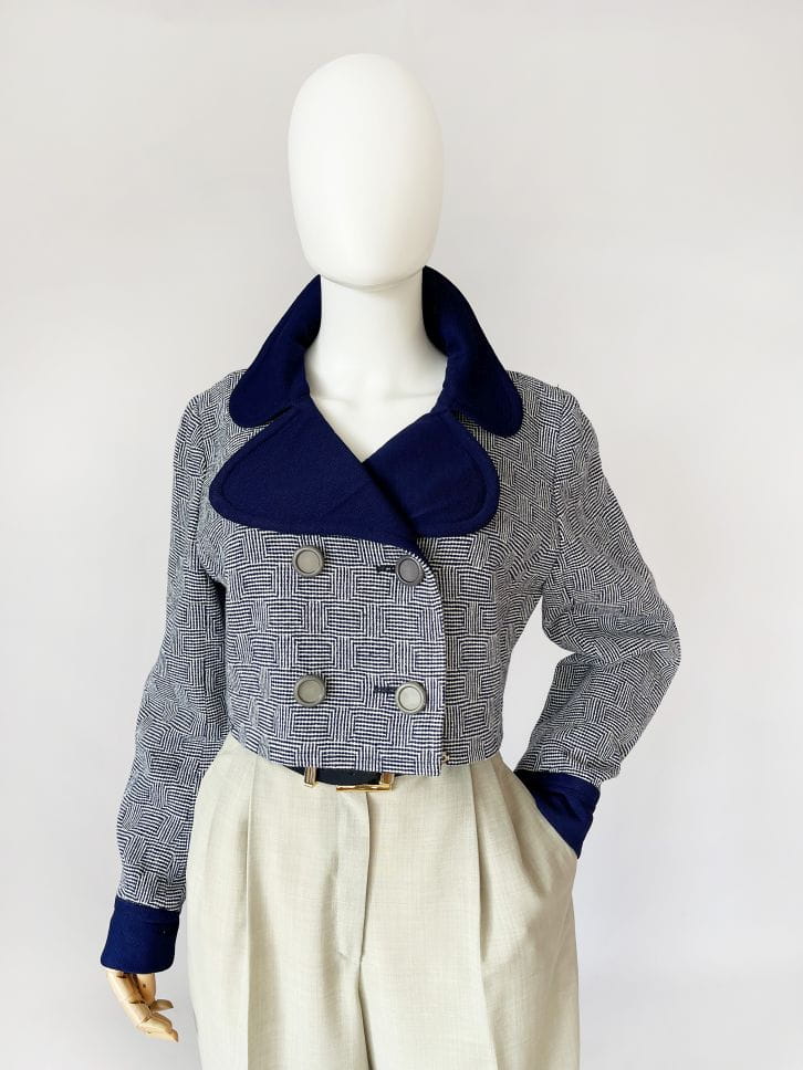 Autentyczny egzemplarz vintage z lat 60-tych. Kurtka/żakiet projektu Marka Stevens'a. Model o krótkim dwurzędowym fasonie z dużym kołnierzem i długimi rękawami. Uszyty z wełnianej dzianiny w drobne regularne wzory.