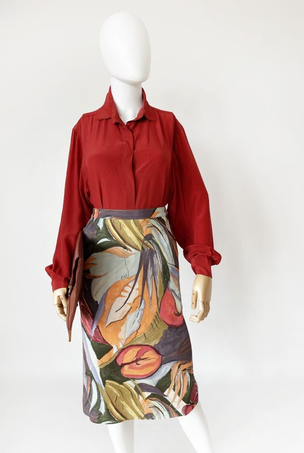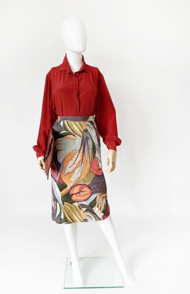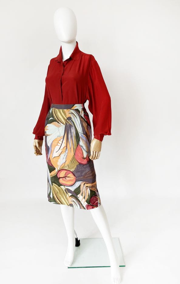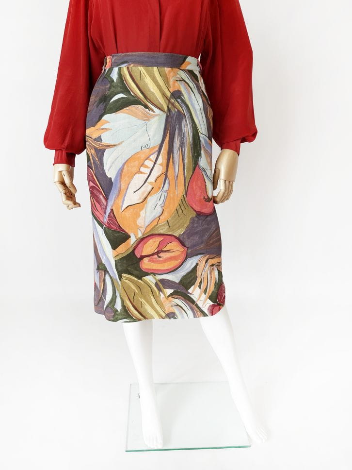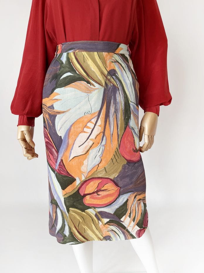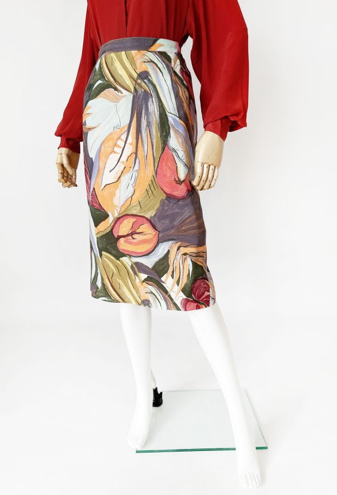 Zjawiskowa spódnica vintage z lat 80-tych/90-tych z pracowni marki Markwald. Wykonana z przewiewnej tkaniny naturalnej w malowane pastelowe wzory. Prosty fason o długości midi. W pasie po bokach elastyczne wstawki. Ma podszewkę. Z tyłu u dołu rozporek.