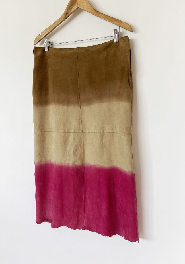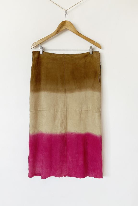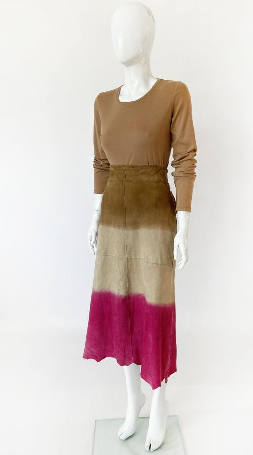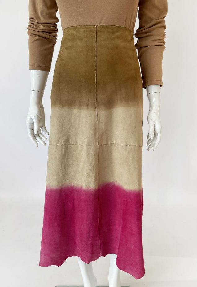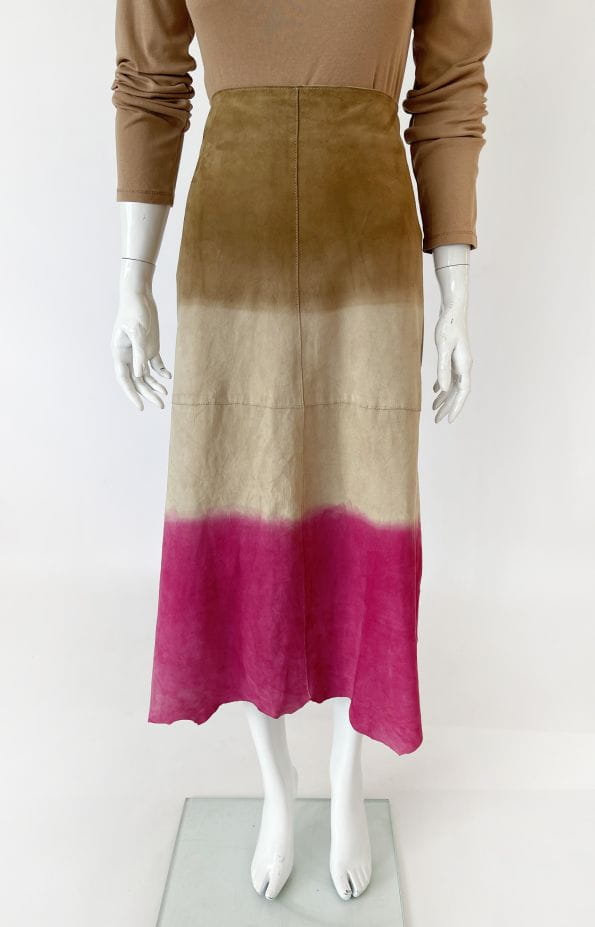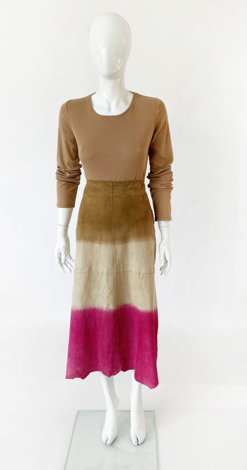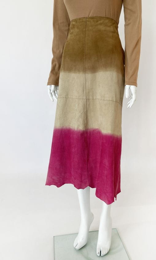 Długa spódnica vintage kultowej marki Marlboro, wykonana z miękkiej naturalnej skóry koziej. Delikatnie poszerzany ku dołowi fason o cieniowanym deseniu w barwach beżu, kości słoniowej i fuksji. Zasuwana na boczny zamek kryty. Model z podszewką.