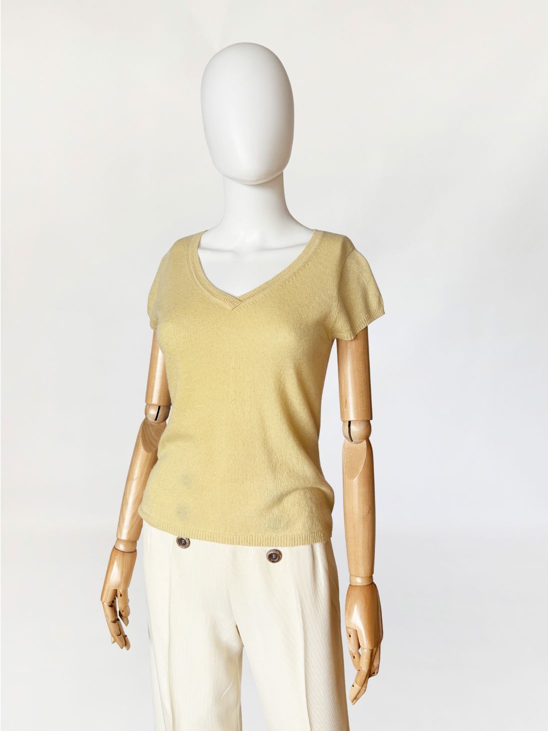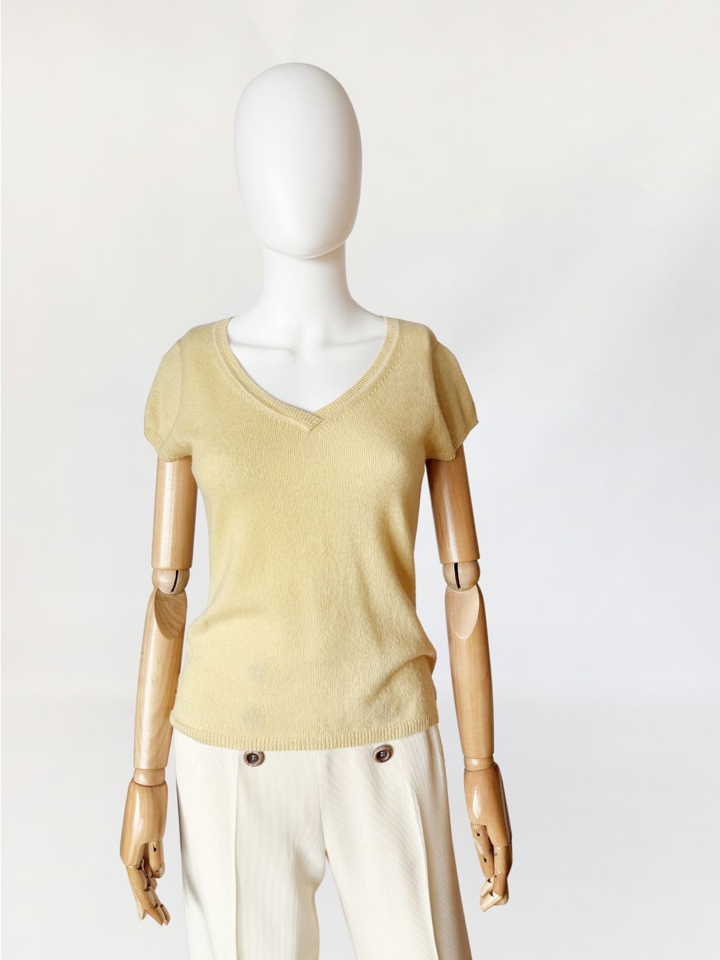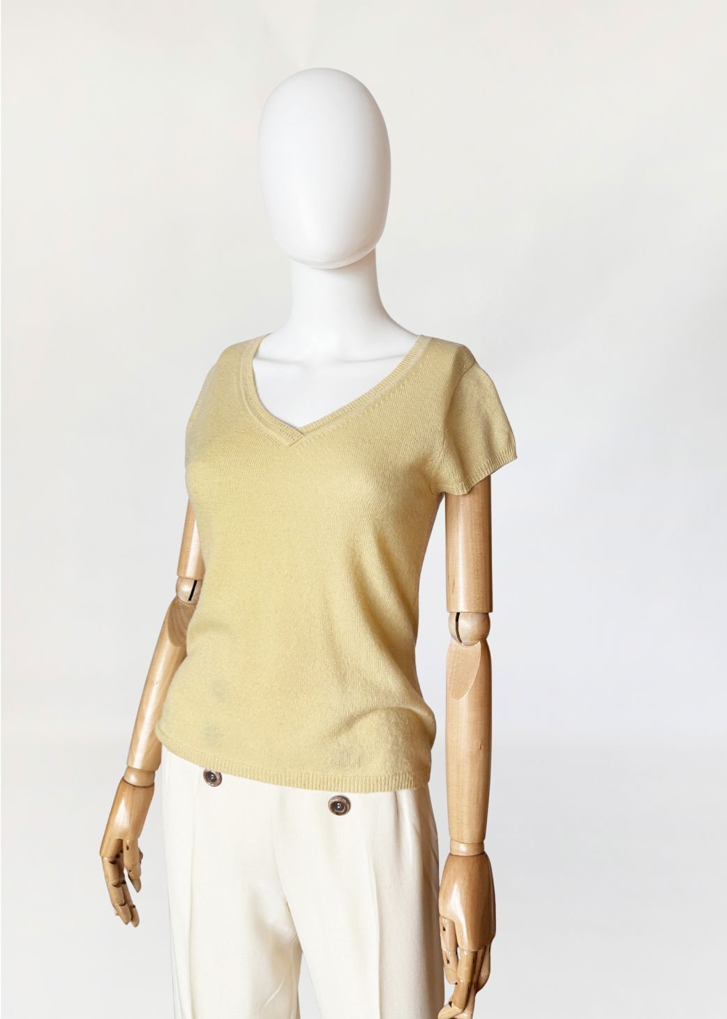 Minimalistyczny lekki sweter vintage o dopasowanym fasonie z krótkimi rękawami i dekoltem v-neck. Wykonany w całości z miękkiego kaszmiru w masełkowym kolorze.