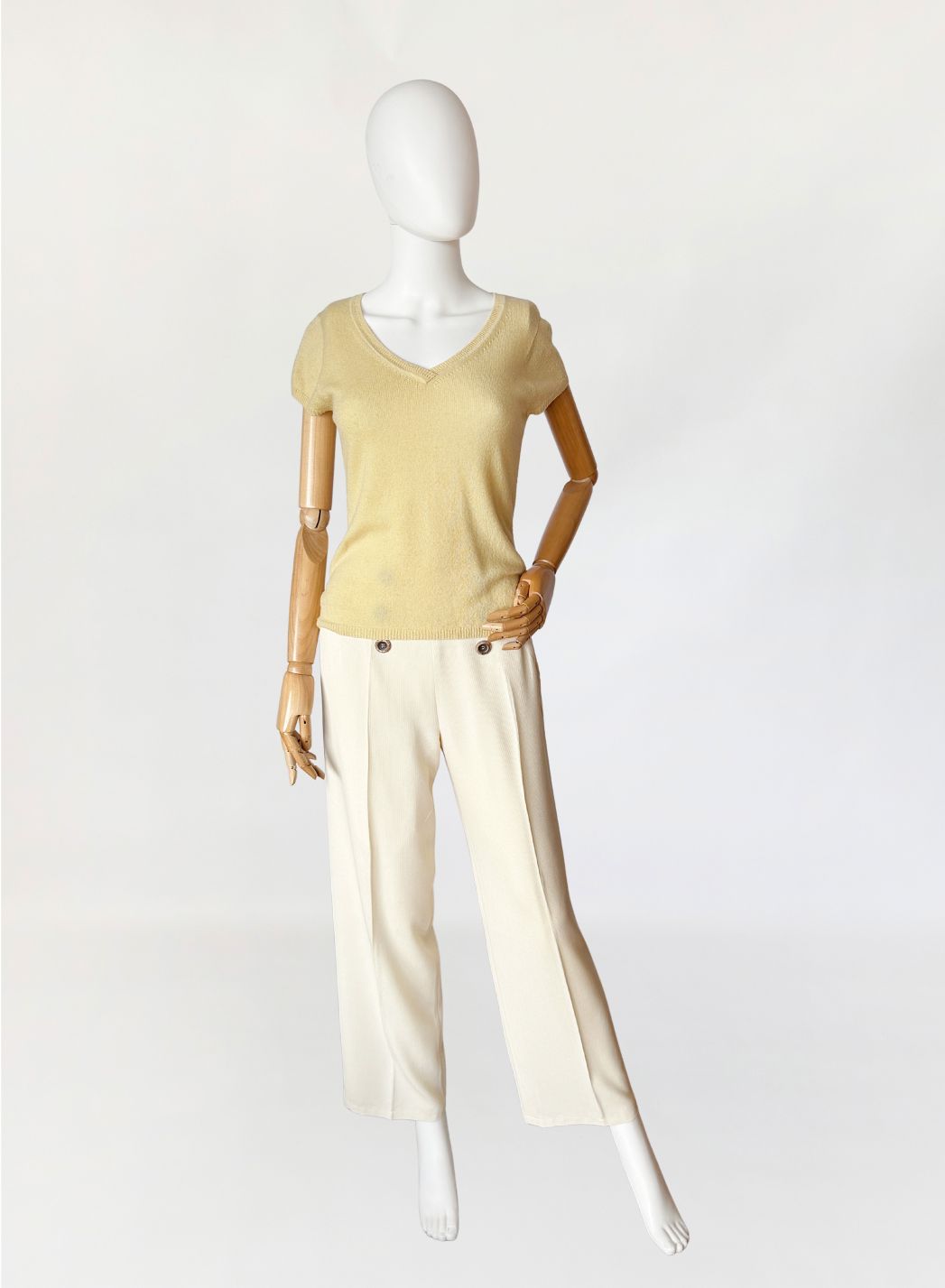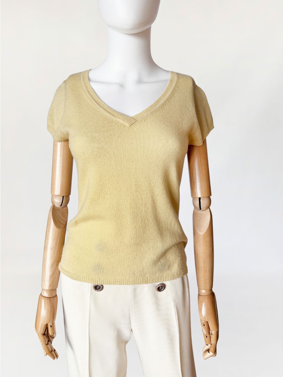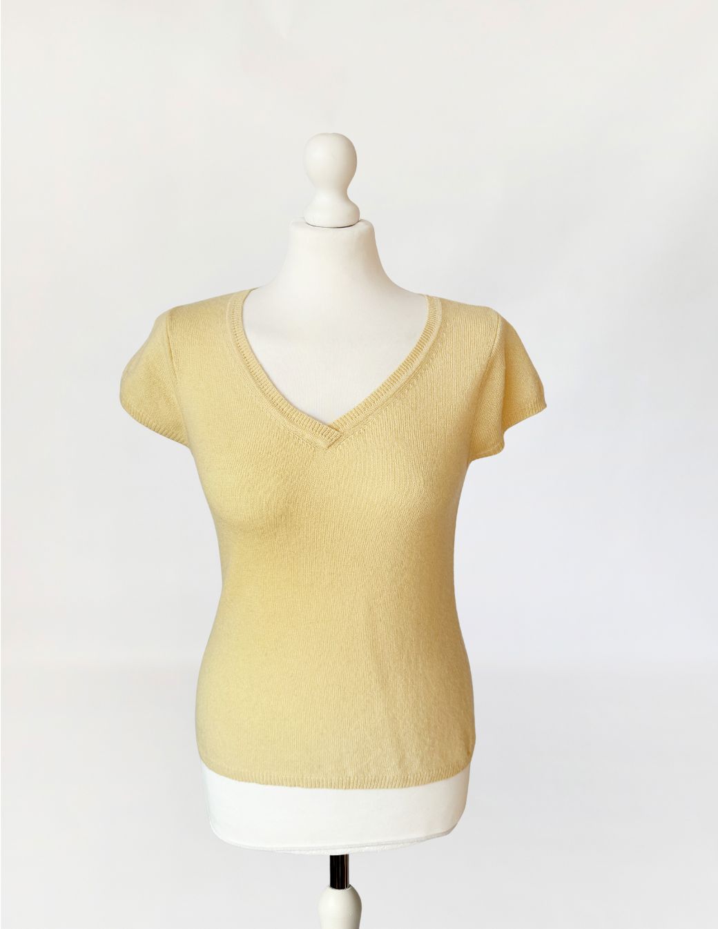 Minimalistyczny lekki sweter vintage o dopasowanym fasonie z krótkimi rękawami i dekoltem v-neck. Wykonany w całości z miękkiego kaszmiru w masełkowym kolorze.