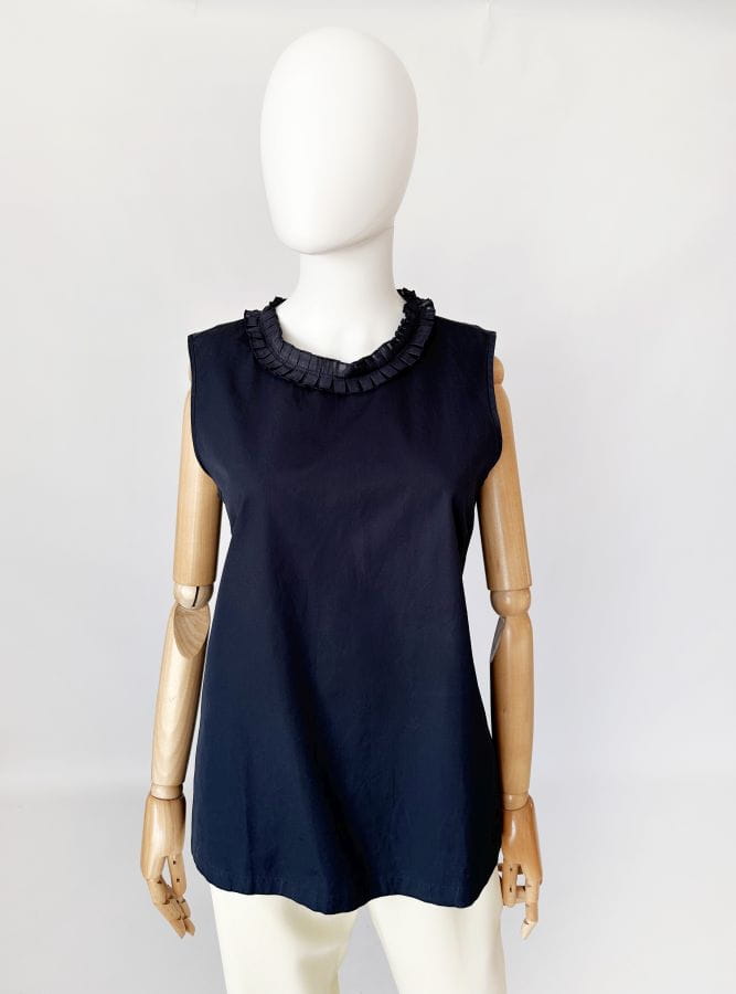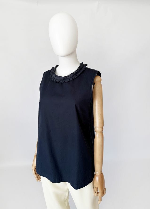 Klasyczna bawełniana bluzka marki Max Mara. Swobodny fason bez rękawów. Kołnierz obszyty plisowaną lamówką.