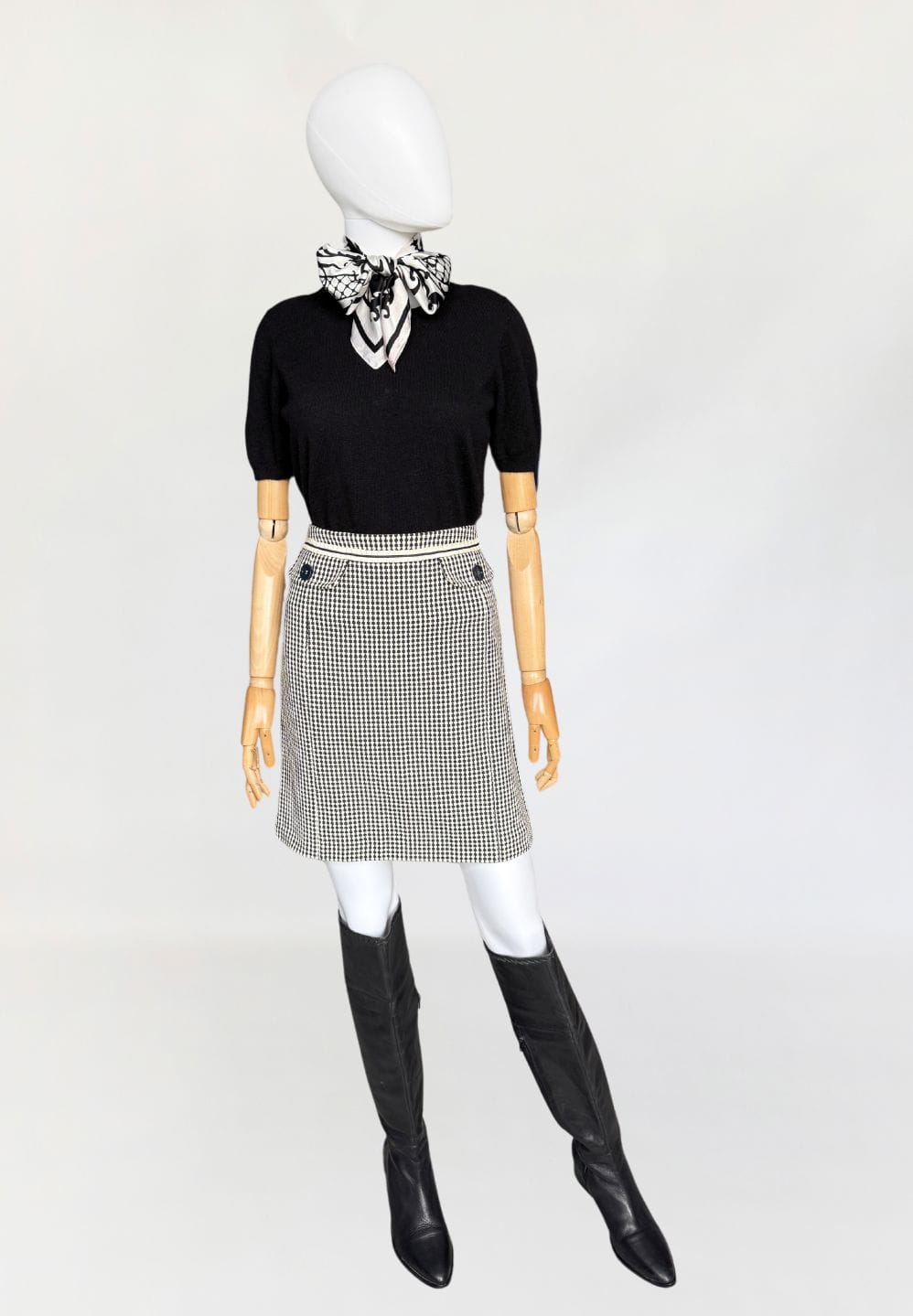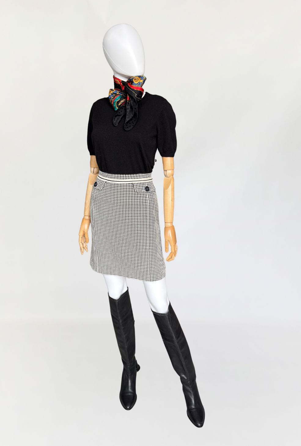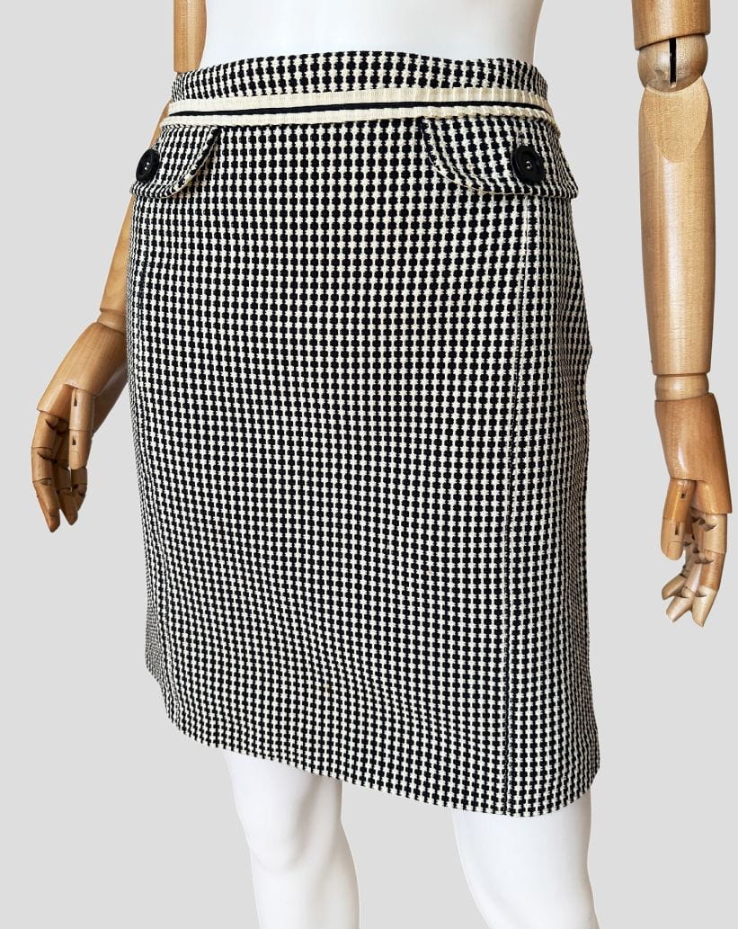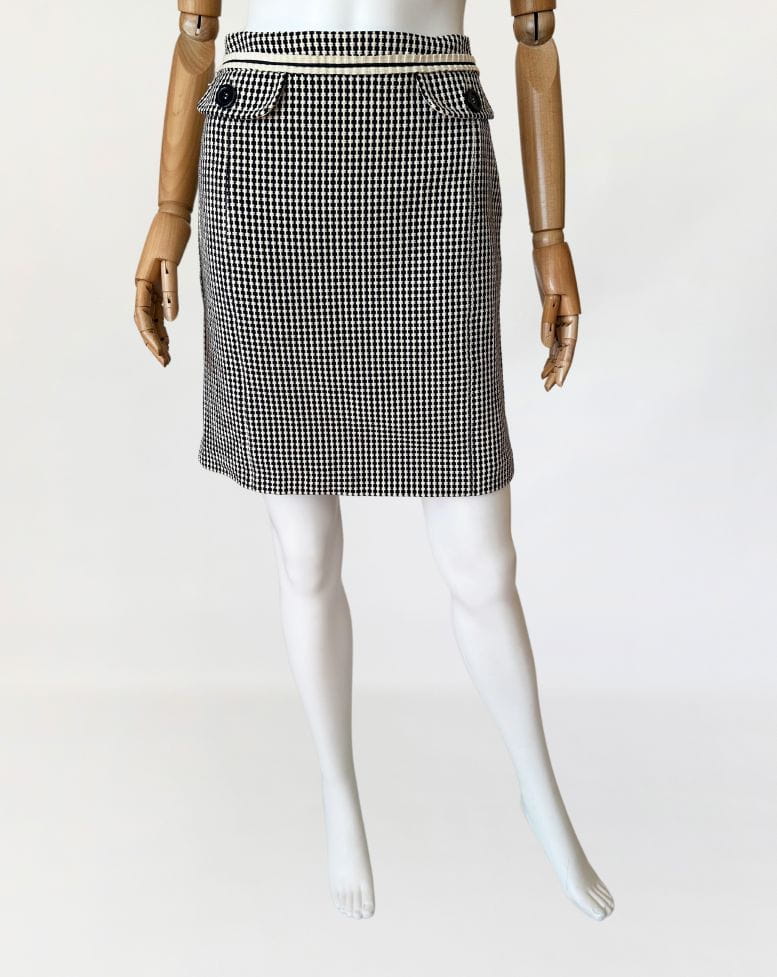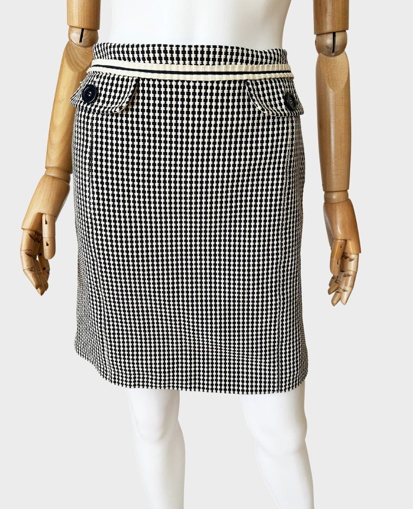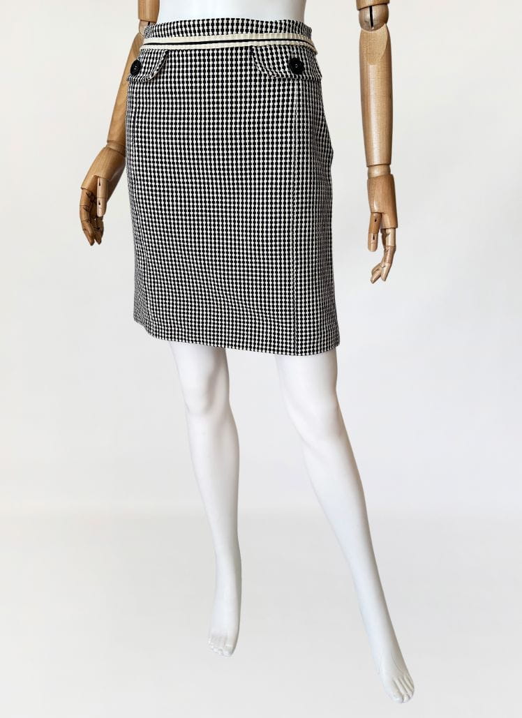 Krótka spódnica marki Max Mara. Prosty fason z patkami imitującymi kieszenie. W pasie dekoracyjna drapowana lamówka. Wizualnie przypomina tweedowe projekty od Chanel. Została wykonana z bawełny w odcieniach czarnym i ecru o splocie zbliżonym do panama. Od wewnątrz na podszewce.