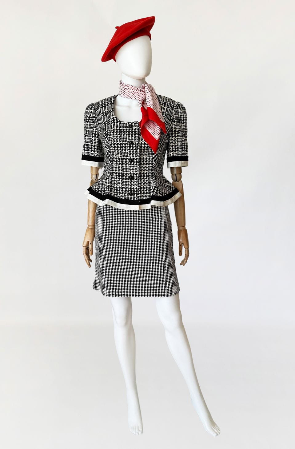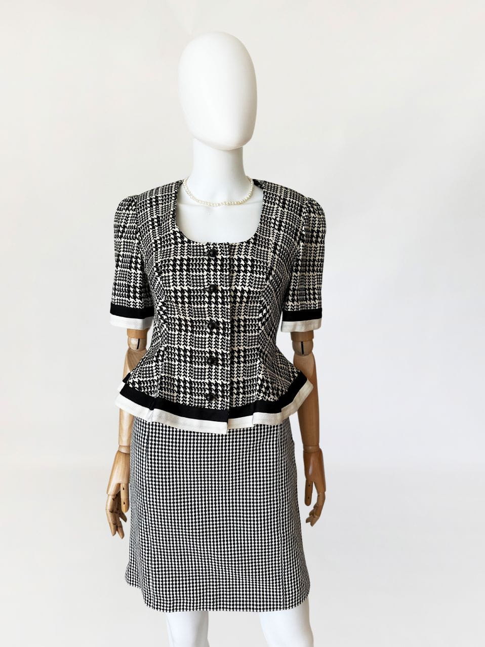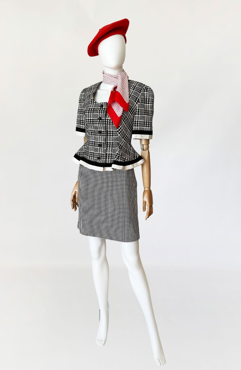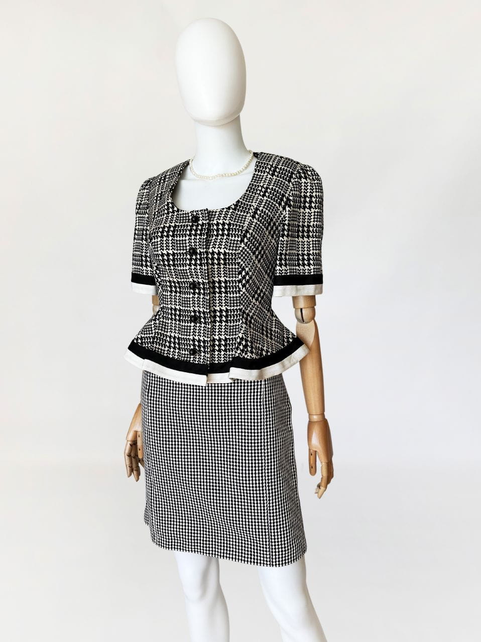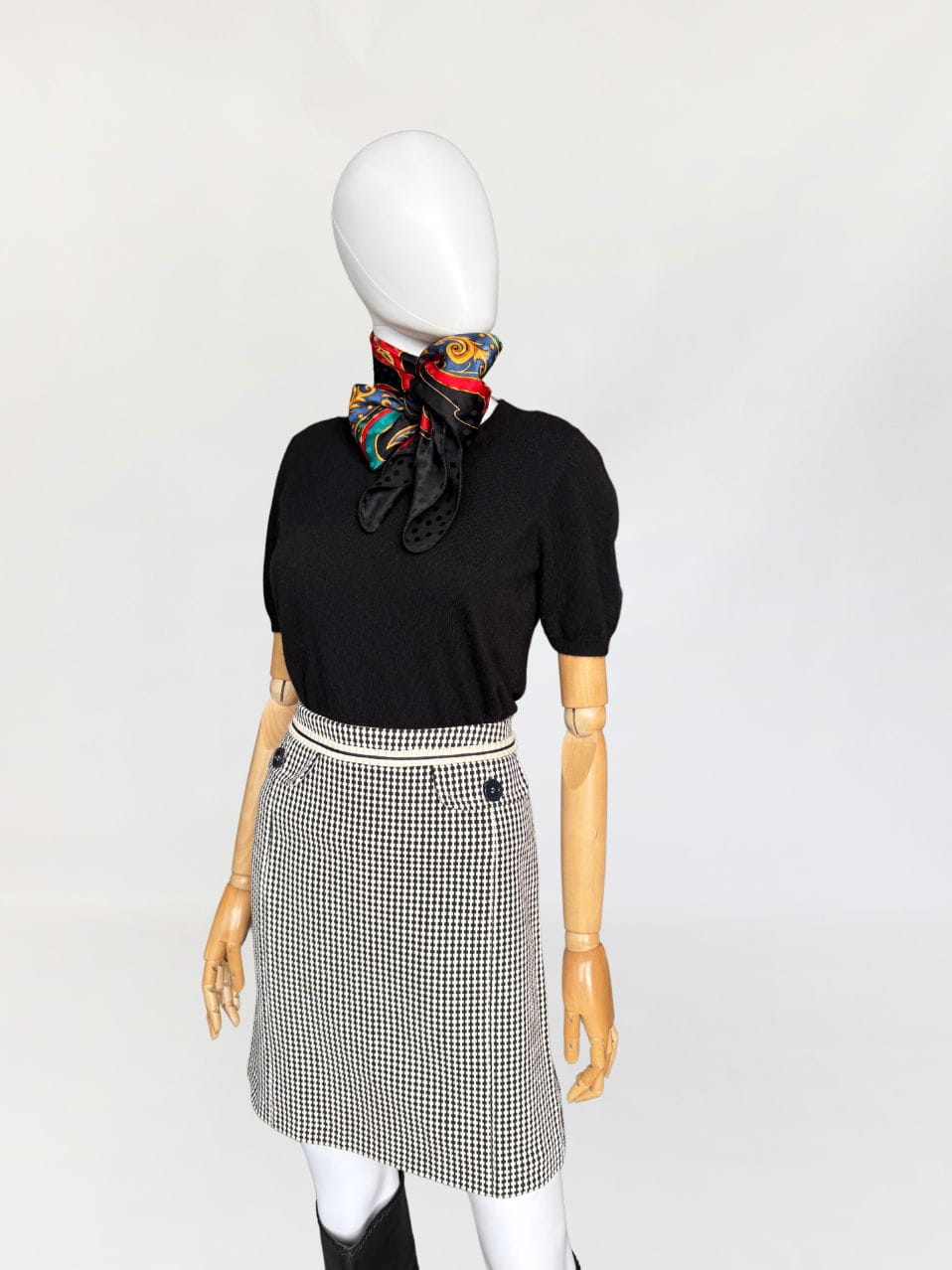 Krótka spódnica marki Max Mara. Prosty fason z patkami imitującymi kieszenie. W pasie dekoracyjna drapowana lamówka. Wizualnie przypomina tweedowe projekty od Chanel. Została wykonana z bawełny w odcieniach czarnym i ecru o splocie zbliżonym do panama. Od wewnątrz na podszewce.