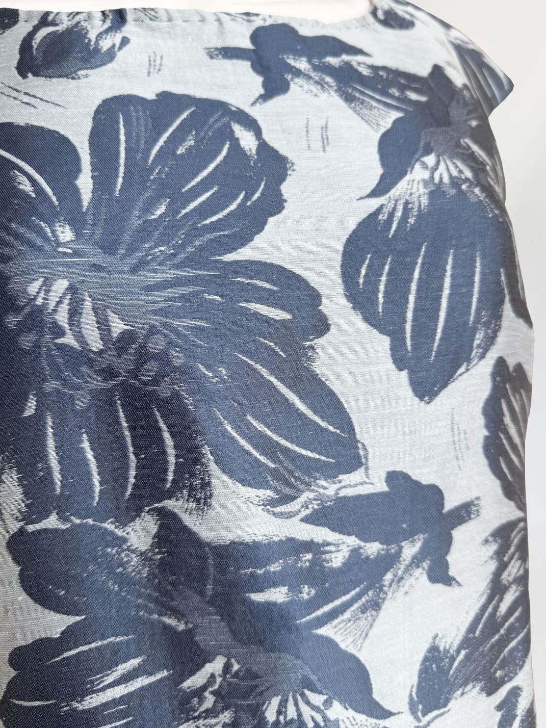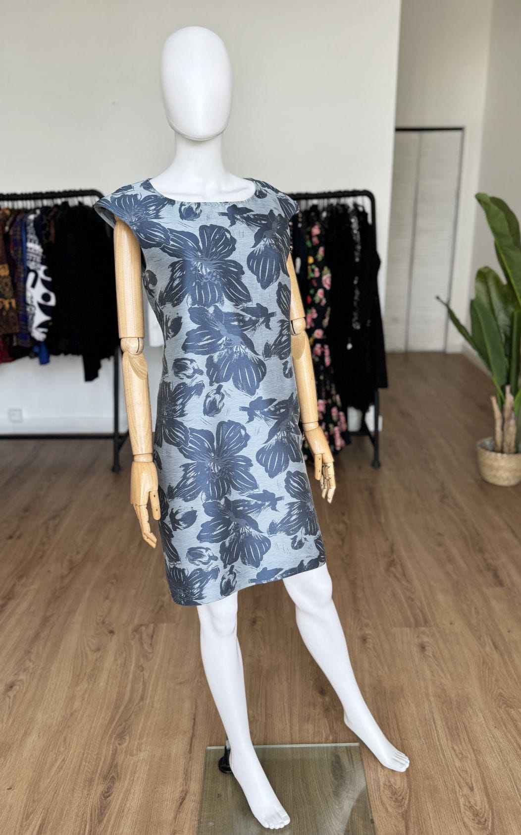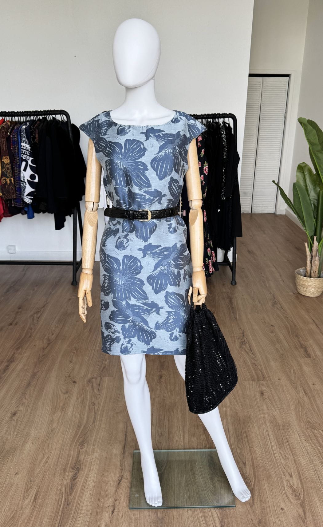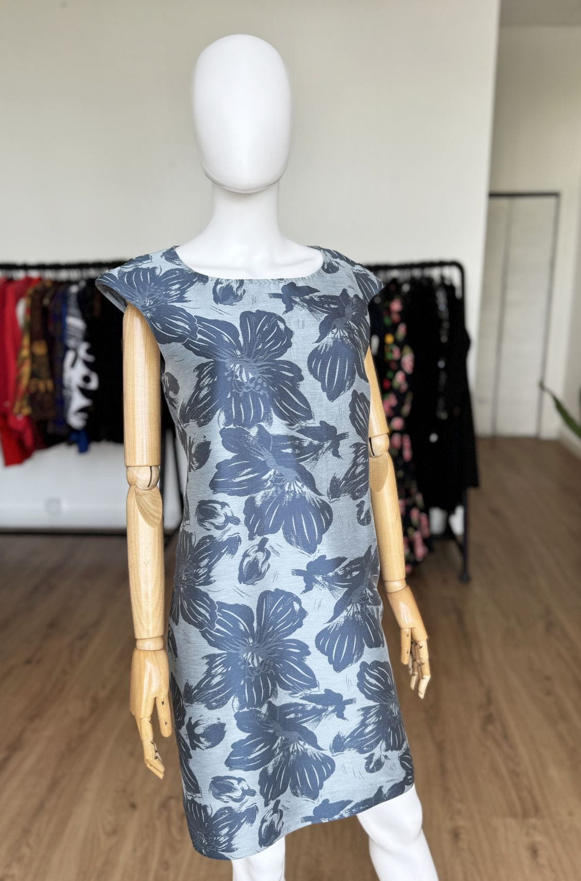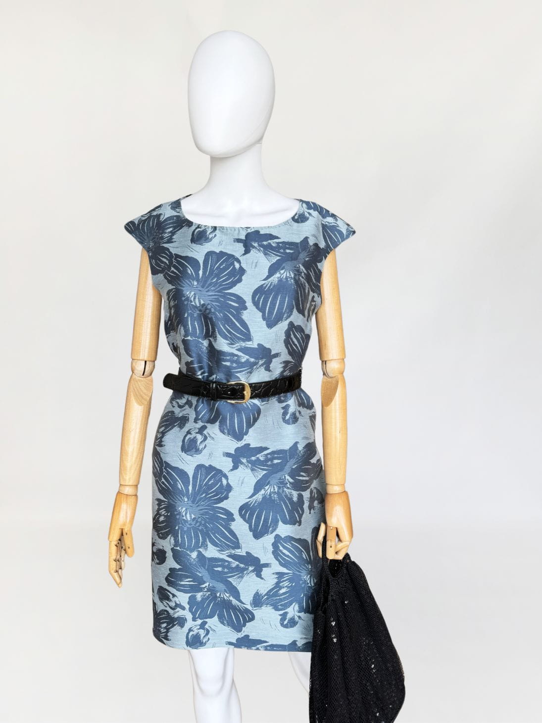 Sukienka marki Max Mara z linii Weekend o wzorzystym kwiatowym deseniu w kolorystyce błękitu i granatu. Góra bez rękawów z okrągłym płytkim dekoltem. Klasyczny fason.