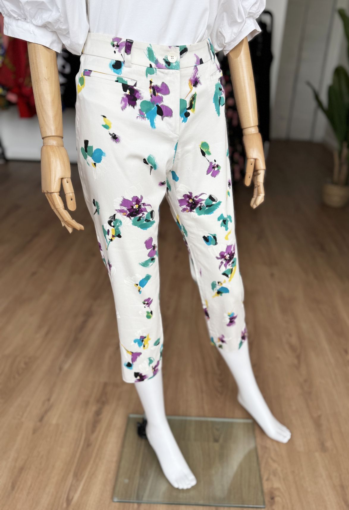Chinosy marki Max Mara wykonane z elastycznej bawełnianej tkaniny w kolorowe kwiatowe wzory. Nogawki 7/8, średnia wysokość stanu. Od frontu niewielkie kieszenie.