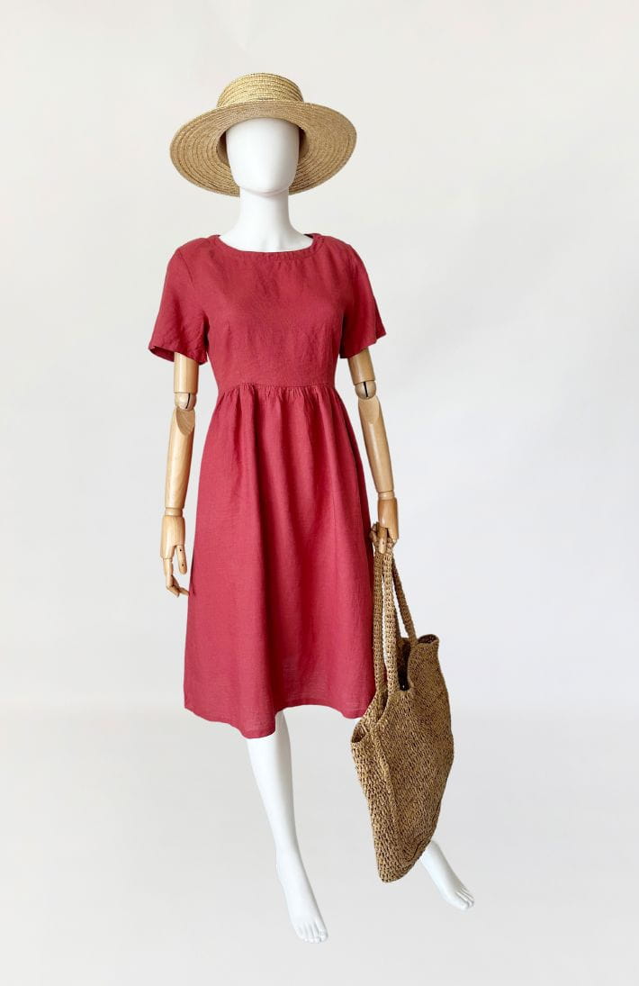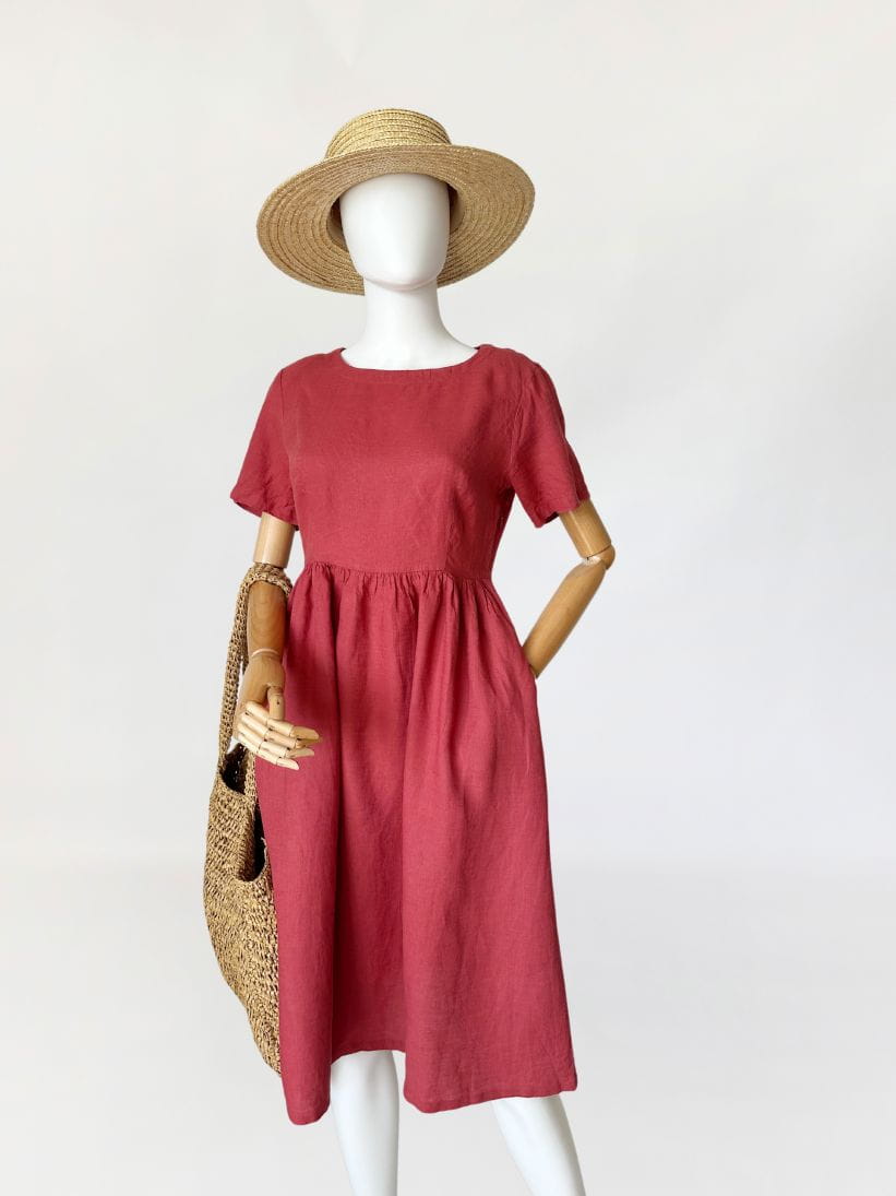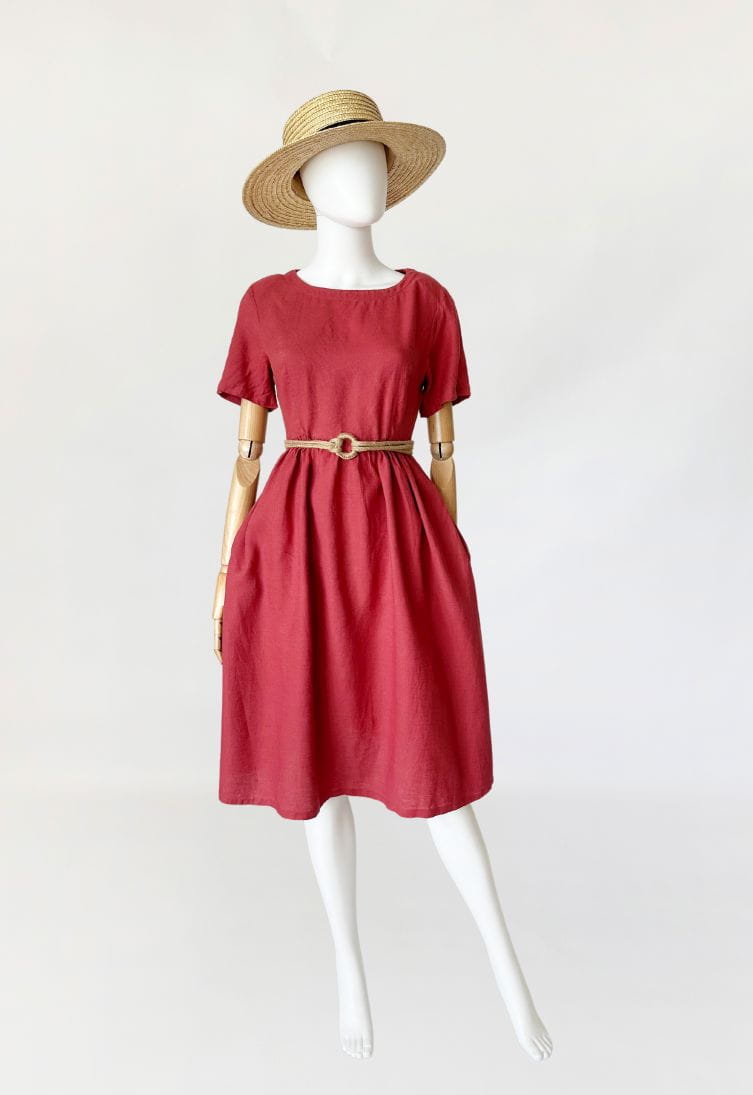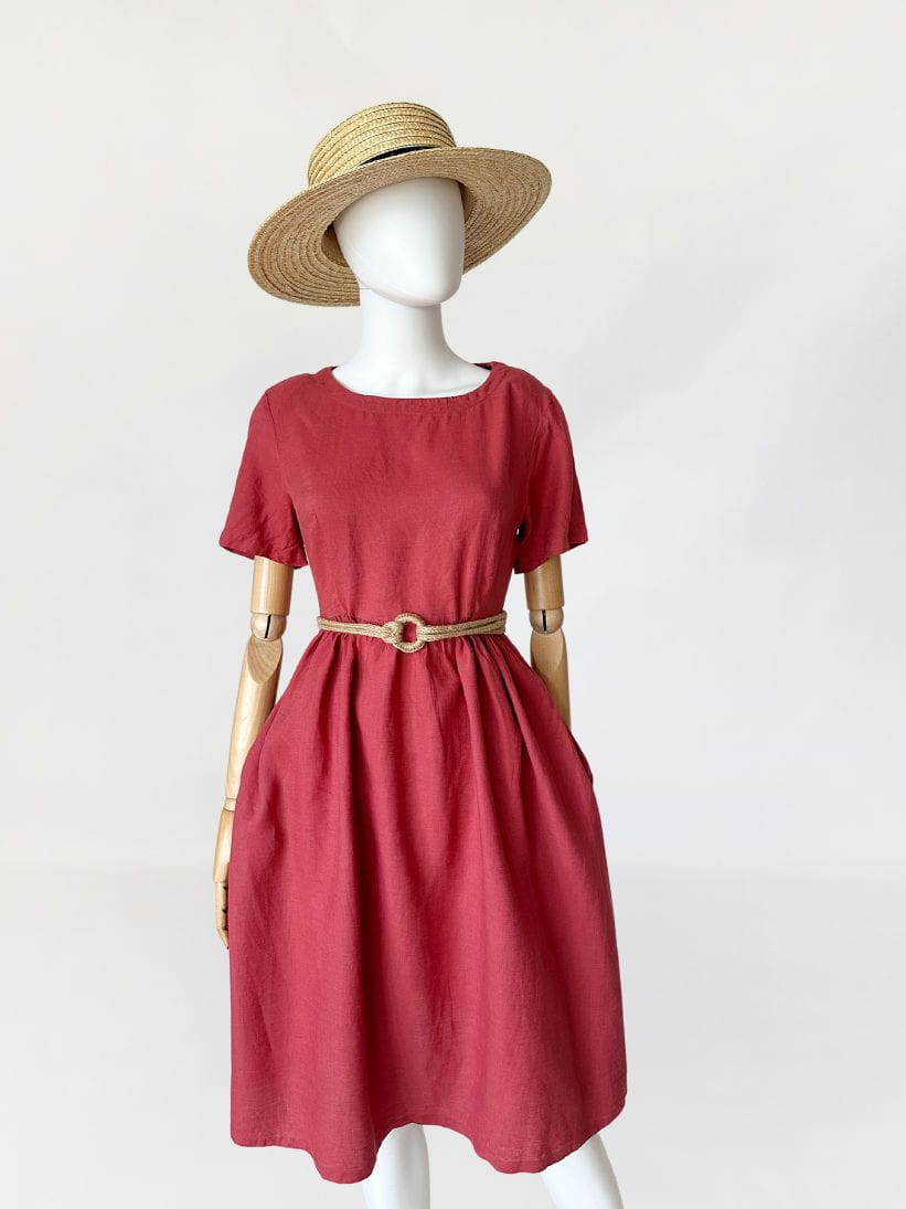 Sukienka marki Max&Co z grupy Max Mara. Wykonana z przewiewnej lnianej tkaniny. Góra z krótkimi rękawami, w pasie drapowana, odcinana z rozkloszowaną spódnicą. W bocznych szwach kieszenie.