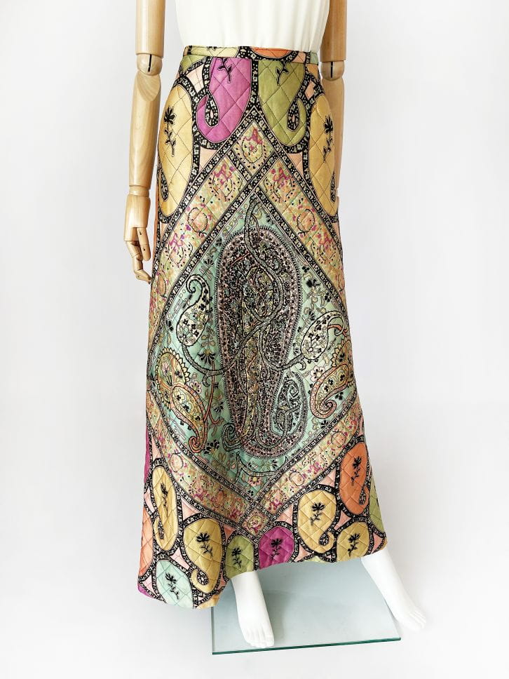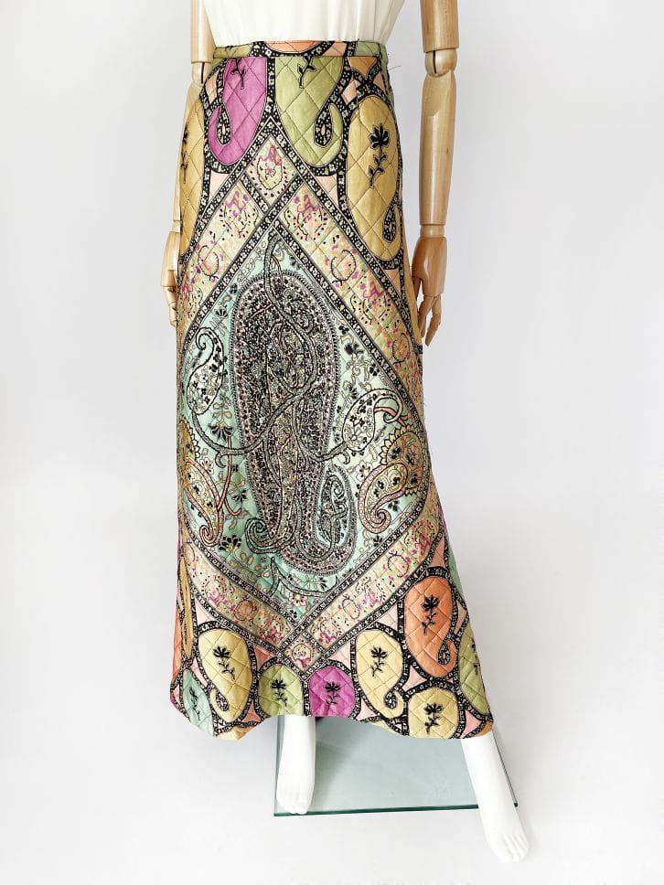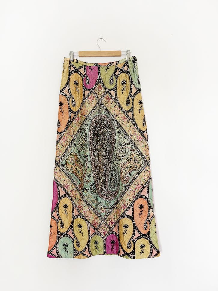 Autentyczna spódnica hippie z lat 70-tych. Model projektu marki Alex Colman, made in California. Trapezowy fason o długości maxi. Pikowana faktura o wzorzystym deseniu w multikolorowe wzory.
