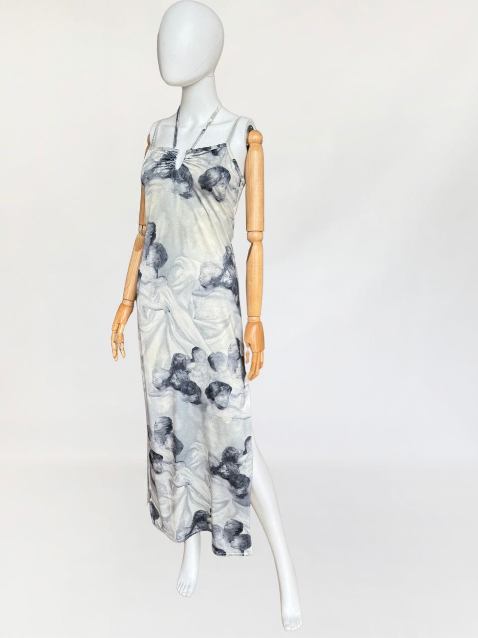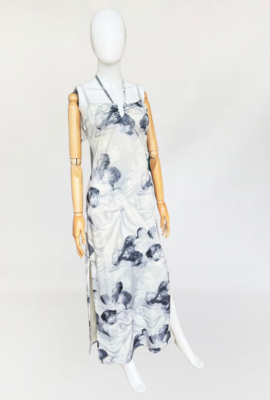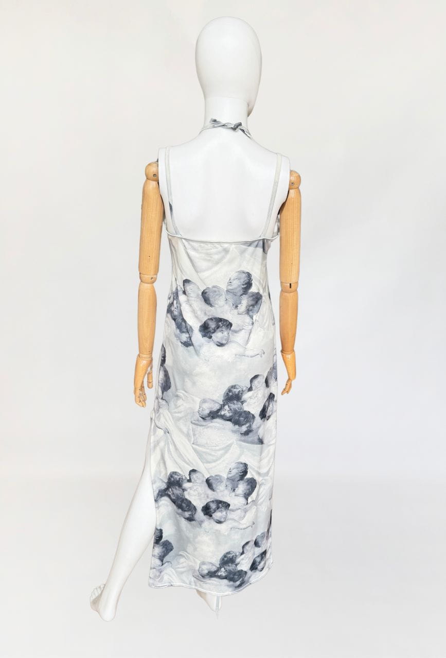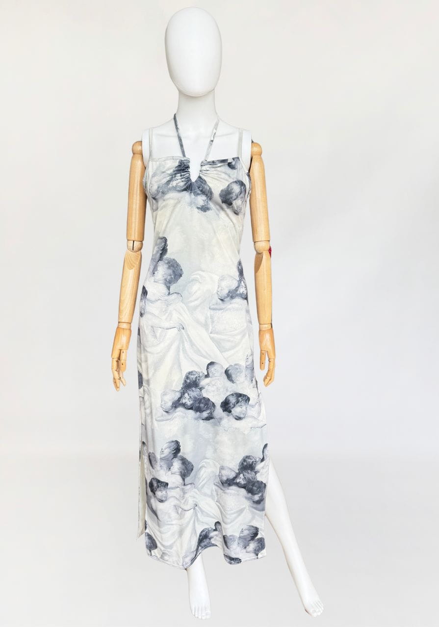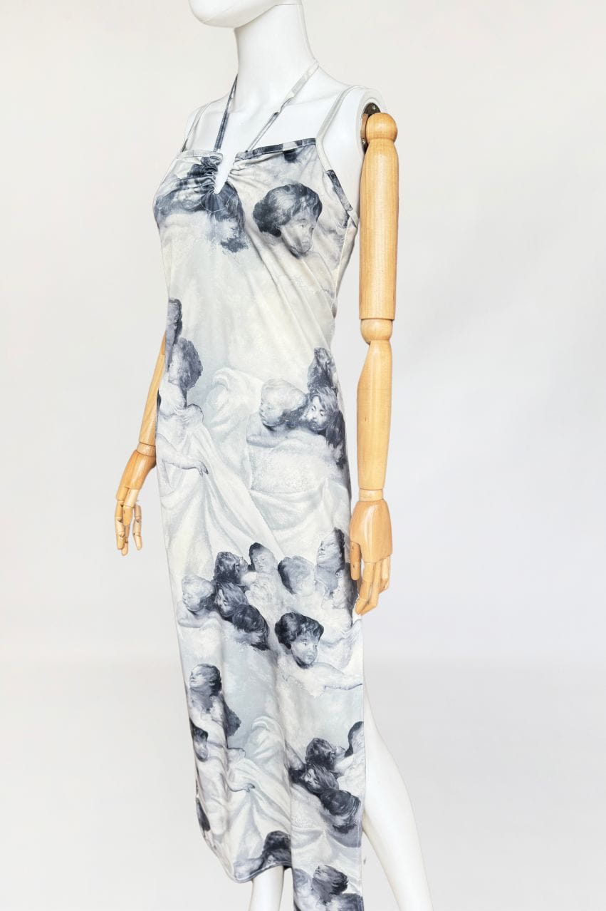 Sukienka vintage o długości maxi, o klasycznym fasonie z dekoltem halter i cienkimi ramiączkami. Wykonana z elastycznej, miękko układającej się tkaniny o barwnym nadruku przedstawiającym anielskie sylwetki – motyw przypominający włoskie malarstwo ścienne o renesansowym rodowodzie. Kompozycja graficzna przywodzi na myśl estetykę monumentalnych fresków, charakterystycznych dla sztuki sakralnej. Estetyka nadruku oraz forma modelu wpisują się w język wizualny typowy dla włoskich domów mody lat 80-tych i 90-tych jakie pojawiały się m.in. w kolekcjach Gianniego Versace, Dolce & Gabbana, Jean Paula Gaultiera czy Roberto Cavalli. Sukienka nie posiada podszewki – materiał jest miękki, lekko śliski i dobrze dopasowuje się do sylwetki. U dołu wysoki rozporek. Model z unikalnym nadrukiem, wpisujący się w estetykę artystycznych tkanin lat 90-tych.