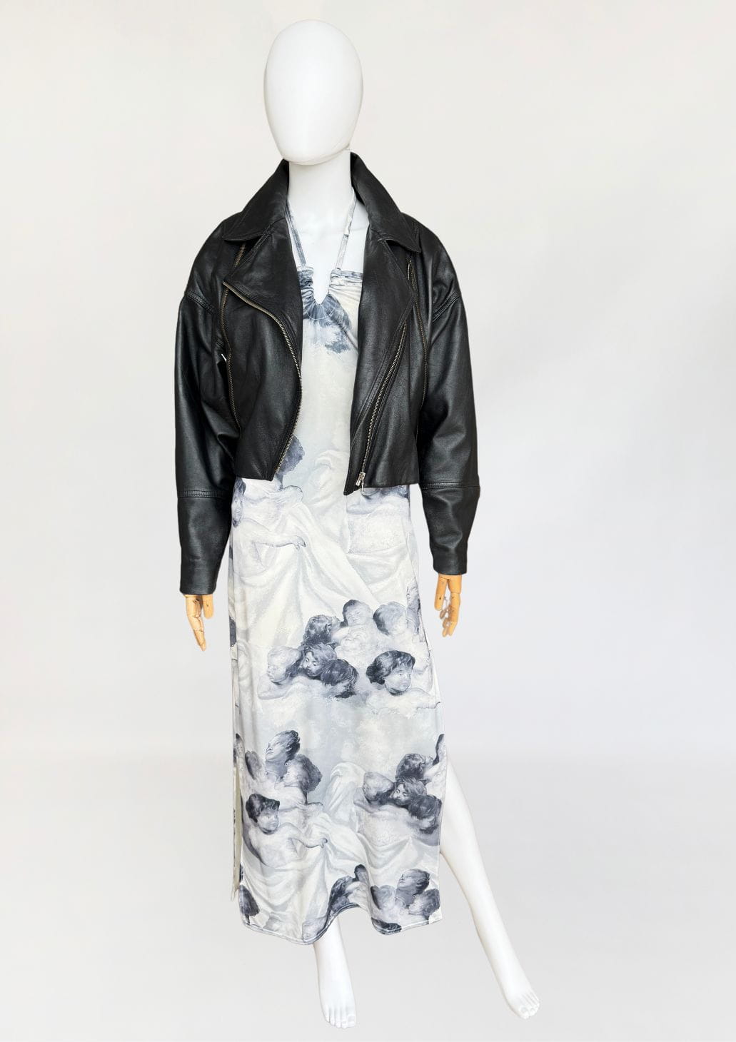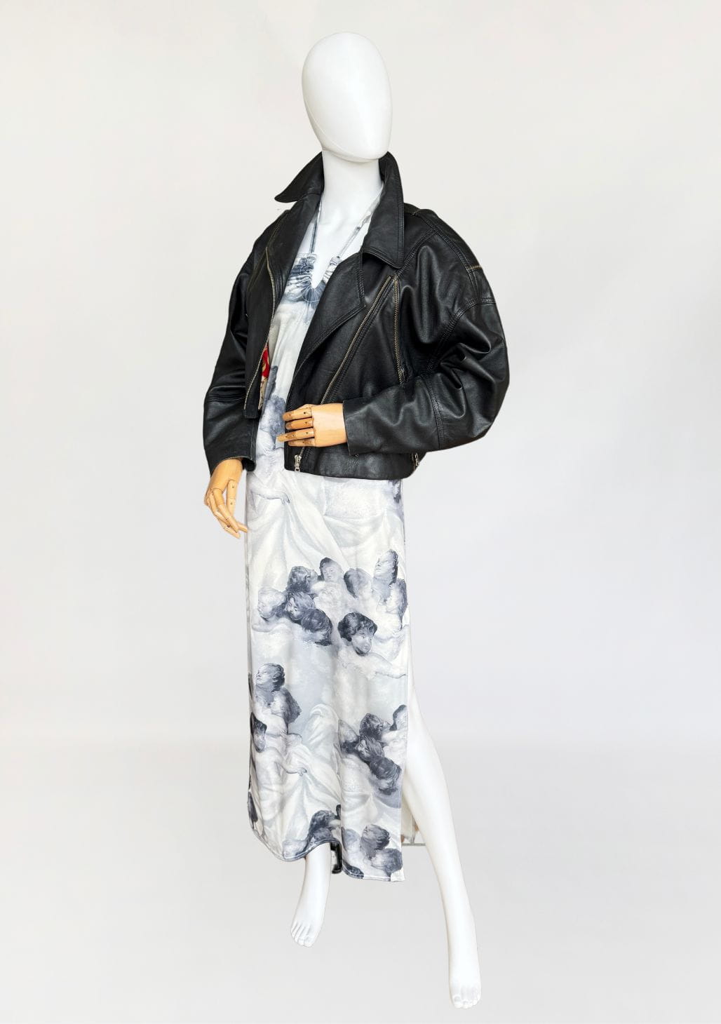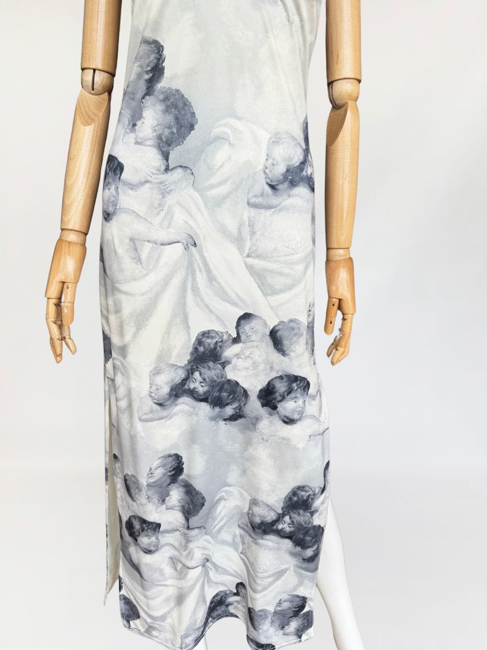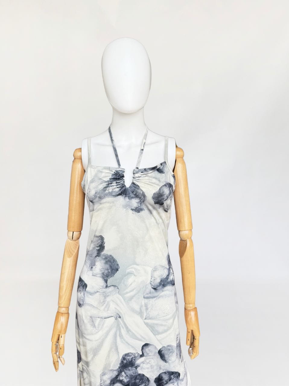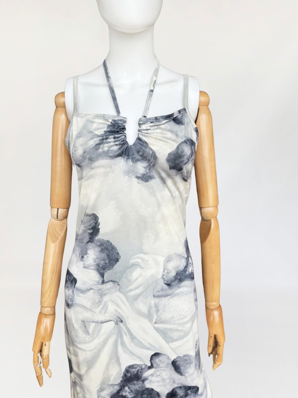 Sukienka vintage o długości maxi, o klasycznym fasonie z dekoltem halter i cienkimi ramiączkami. Wykonana z elastycznej, miękko układającej się tkaniny o barwnym nadruku przedstawiającym anielskie sylwetki – motyw przypominający włoskie malarstwo ścienne o renesansowym rodowodzie. Kompozycja graficzna przywodzi na myśl estetykę monumentalnych fresków, charakterystycznych dla sztuki sakralnej. Estetyka nadruku oraz forma modelu wpisują się w język wizualny typowy dla włoskich domów mody lat 80-tych i 90-tych jakie pojawiały się m.in. w kolekcjach Gianniego Versace, Dolce & Gabbana, Jean Paula Gaultiera czy Roberto Cavalli. Sukienka nie posiada podszewki – materiał jest miękki, lekko śliski i dobrze dopasowuje się do sylwetki. U dołu wysoki rozporek. Model z unikalnym nadrukiem, wpisujący się w estetykę artystycznych tkanin lat 90-tych.