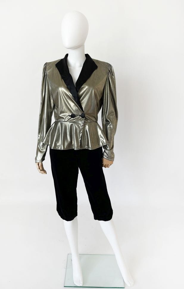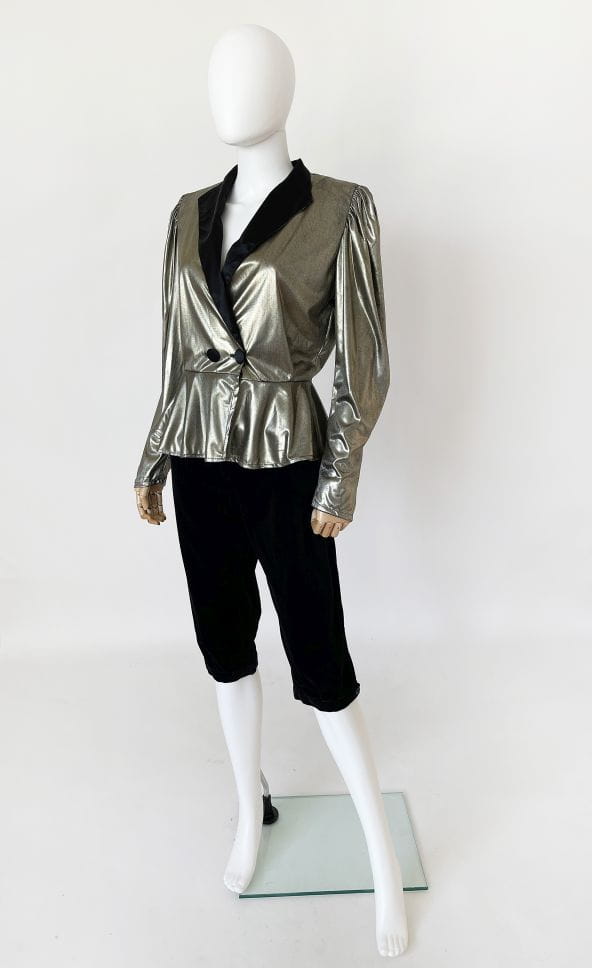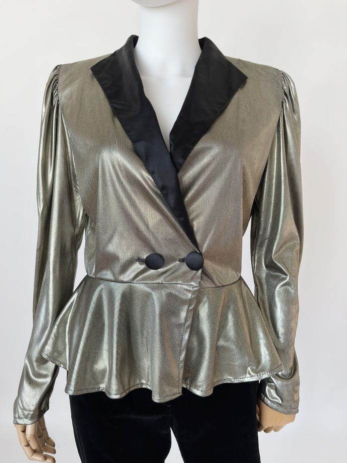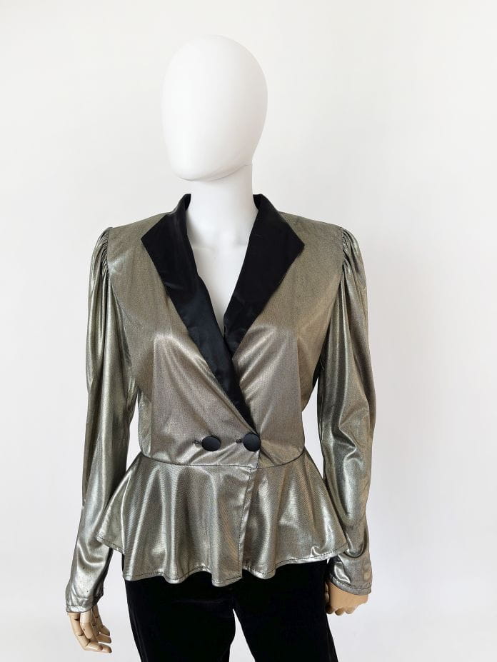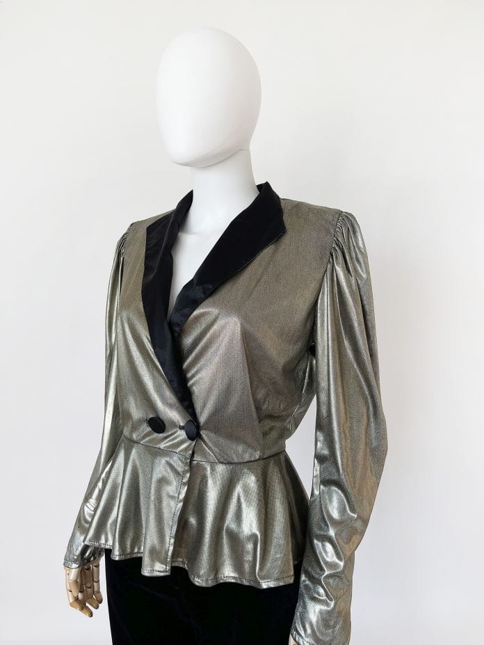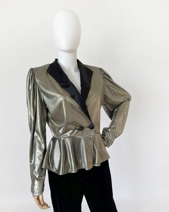Francuski żakiet vintage z lat 80-tych. Uszyty z lekkiej, lejącej metalicznej tkaniny. Długie rękawy z poduchami w ramionach. W pasie zapięcie na guziki, poniżej swobodna baskinka.