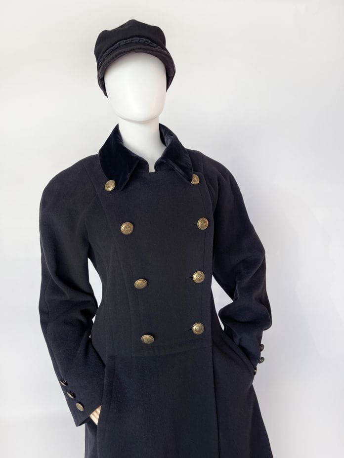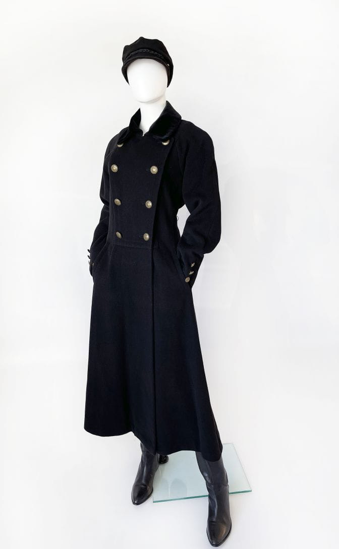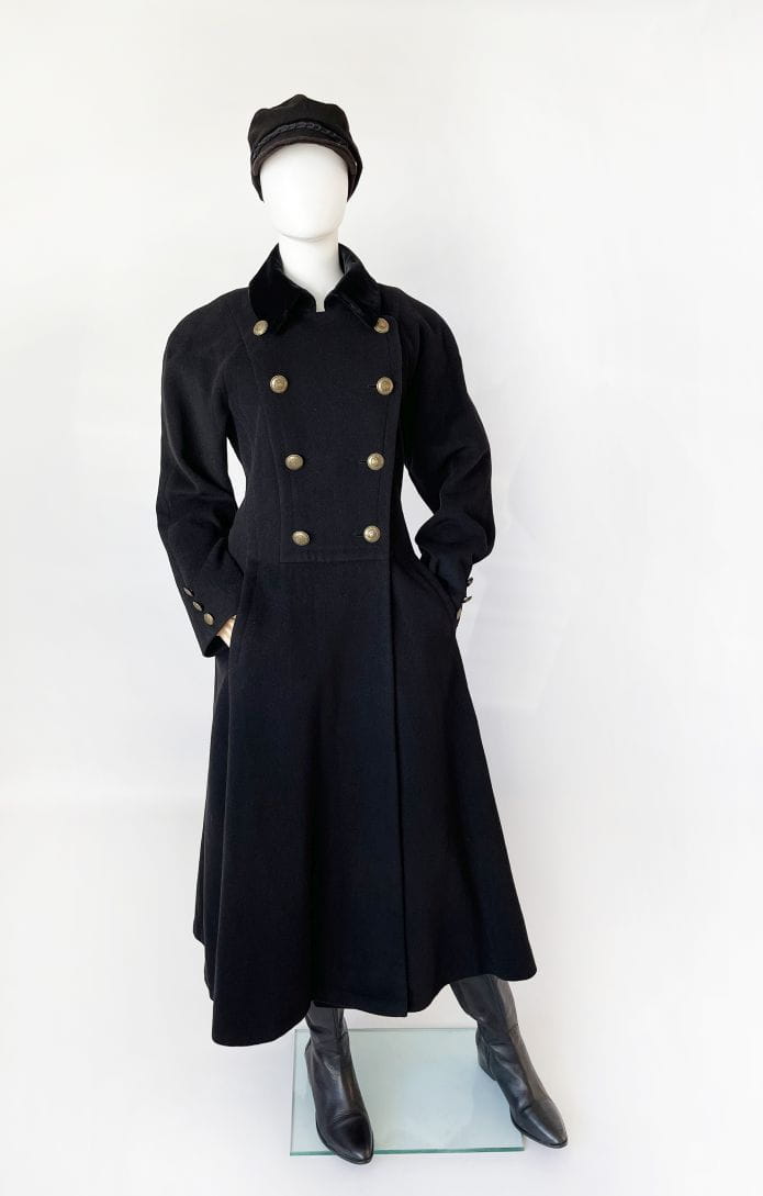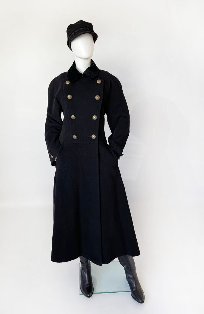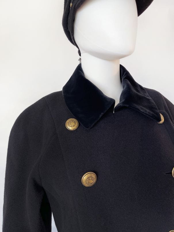 Zjawiskowy płaszcz true vintage w stylu militarnym. Wykonany z wełny z dodatkiem kaszmiru i poliamidu. Dwurzędowy model o długości maxi, z długimi raglanowymi rękawami. Ramiona lekko wyściełane. Odcinany w pasie, dół rozkloszowany. Na wysokości bioder wsuwane kieszenie. U góry aksamitny kołnierz. Od wewnątrz na podszewce.