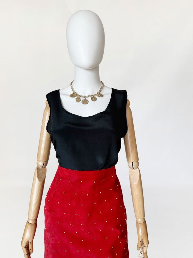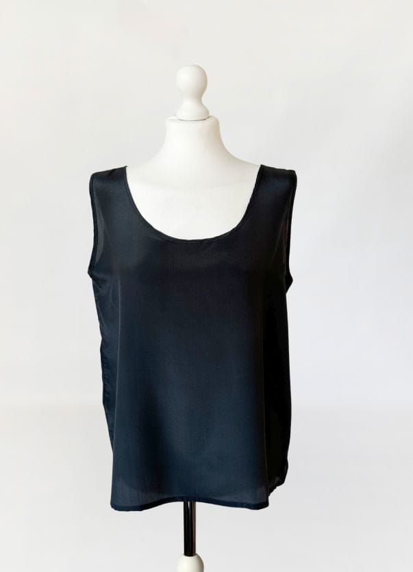 Minimalistyczny czarny top wykonany z naturalnego jedwabiu. Klasyczny fason na ramiączkach. Lekka przewiewna baza pod letnie marynarki i okrycia.