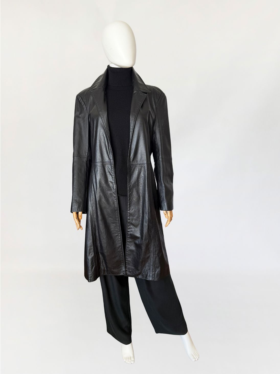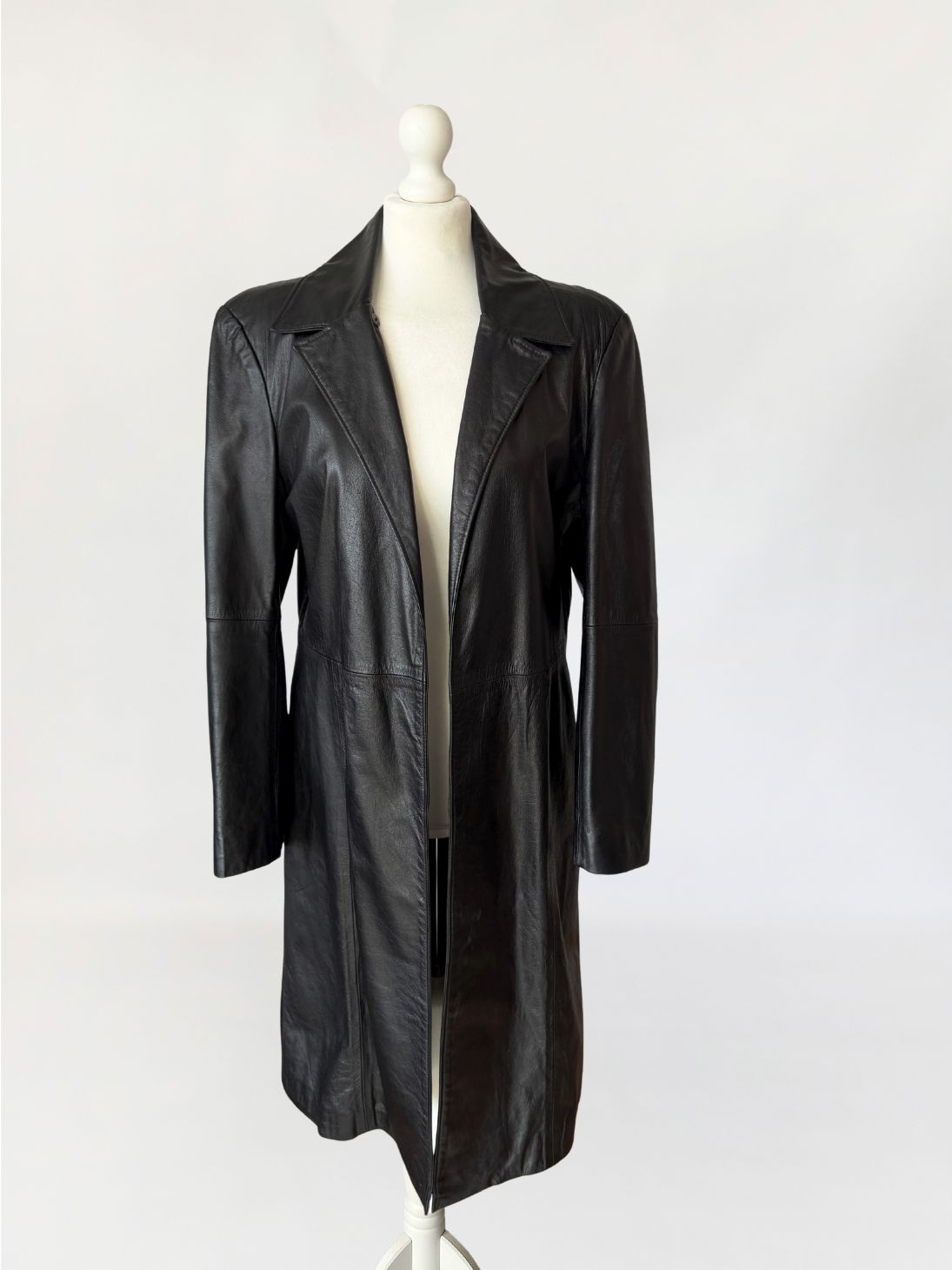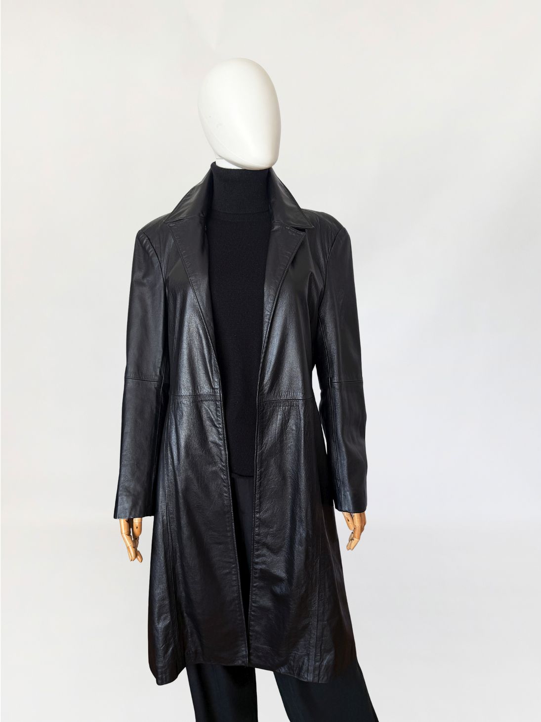 Minimalistyczny płaszcz vintage wykonany z czarnej skóry licowej. Klasyczny model o prostej linii o otwartym fasonie bez zapięcia. Kołnierz klasyczny z wyraźnie zaznaczonymi klapami. Długie rękawy wszywane klasycznie, konstrukcja oparta na pionowych cięciach modelujących sylwetkę.