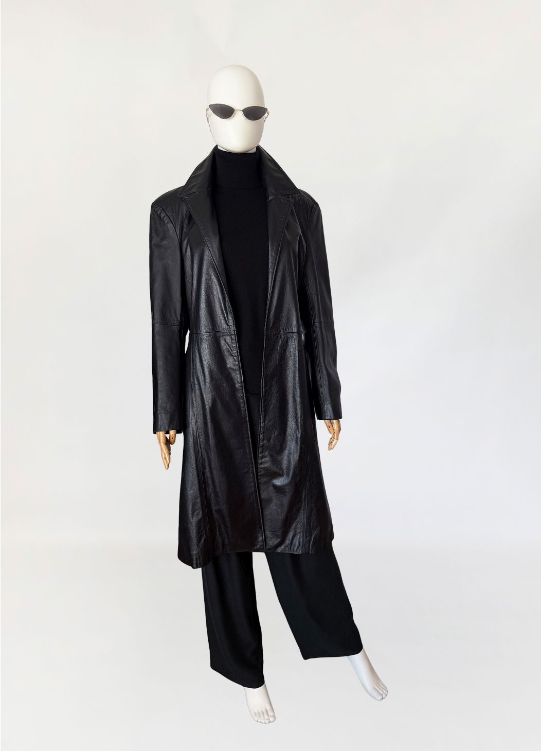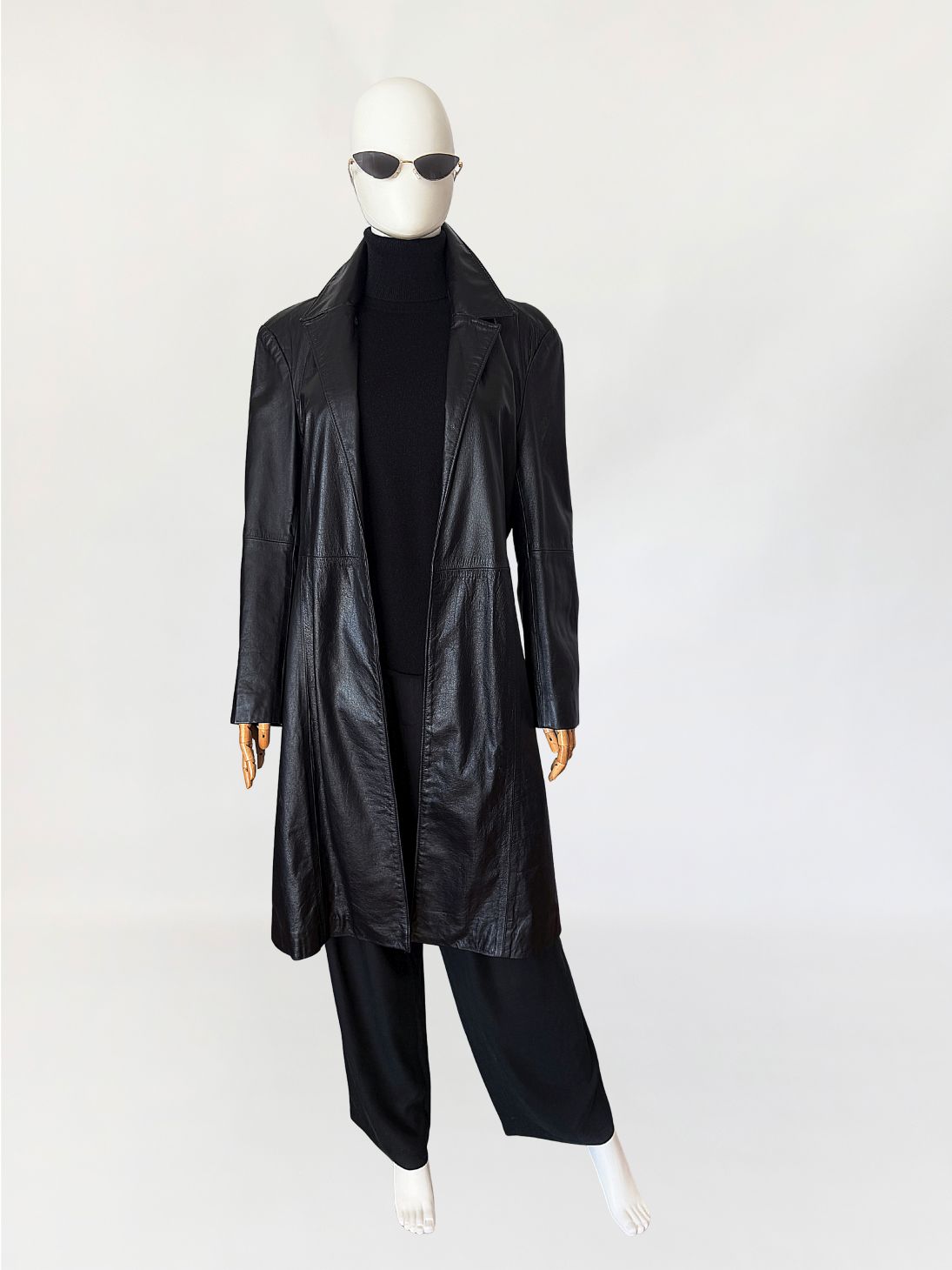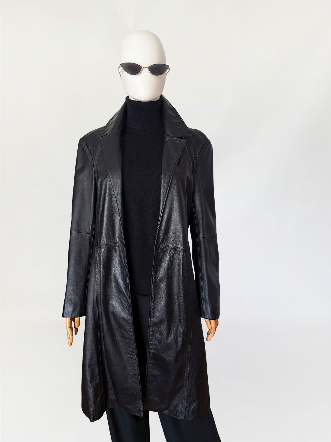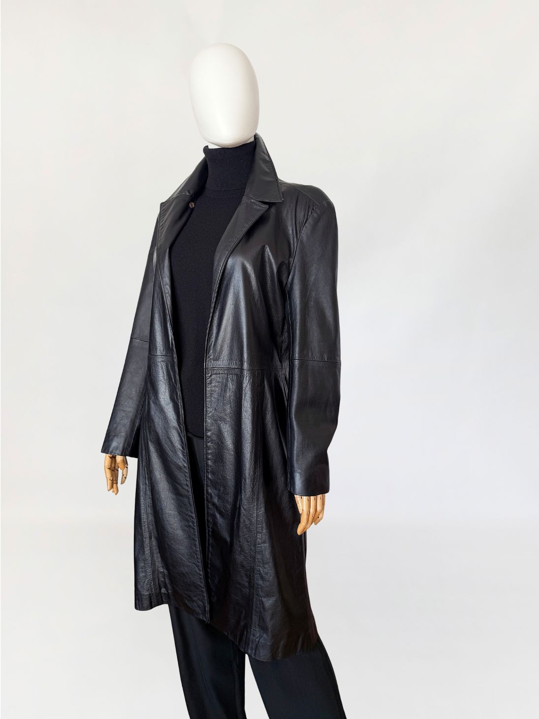 Minimalistyczny płaszcz vintage wykonany z czarnej skóry licowej. Klasyczny model o prostej linii o otwartym fasonie bez zapięcia. Kołnierz klasyczny z wyraźnie zaznaczonymi klapami. Długie rękawy wszywane klasycznie, konstrukcja oparta na pionowych cięciach modelujących sylwetkę.
