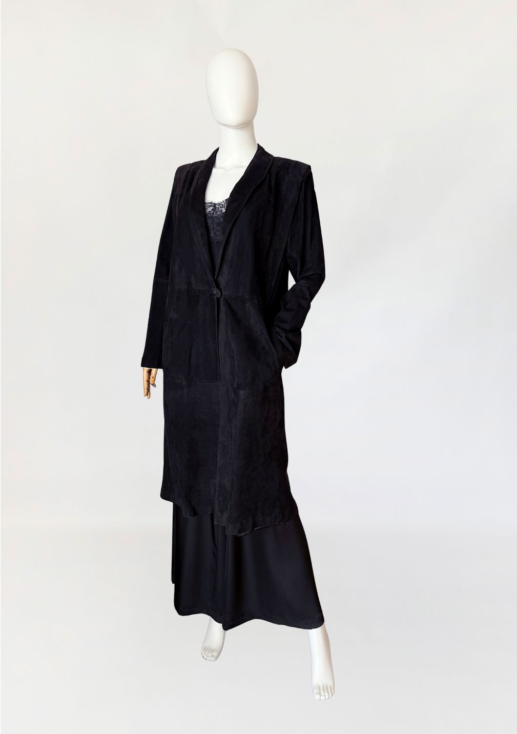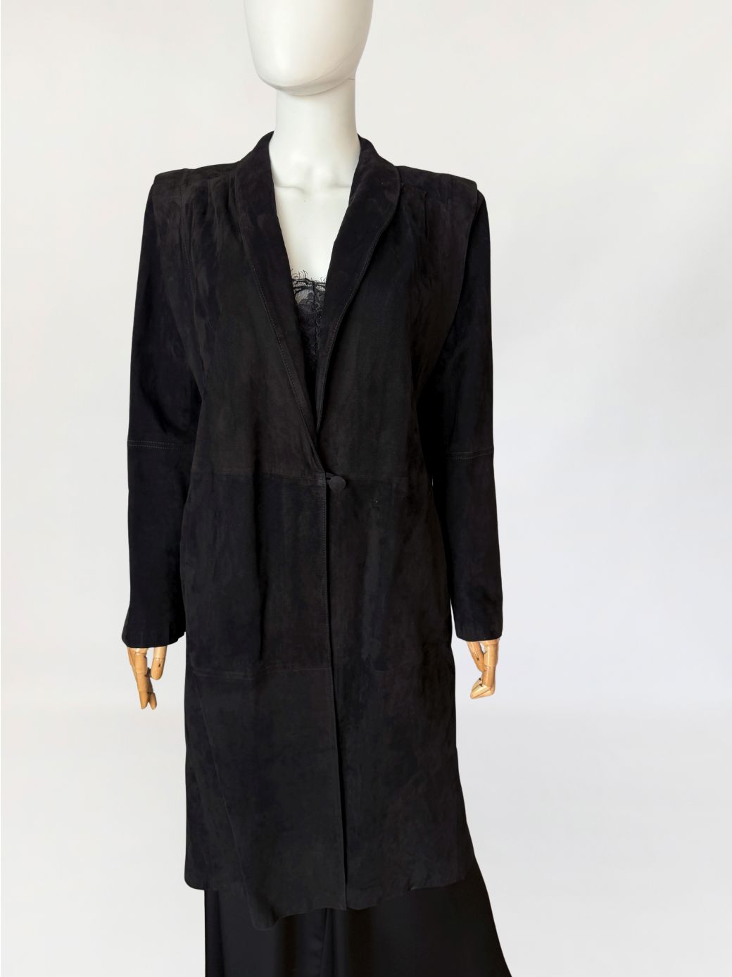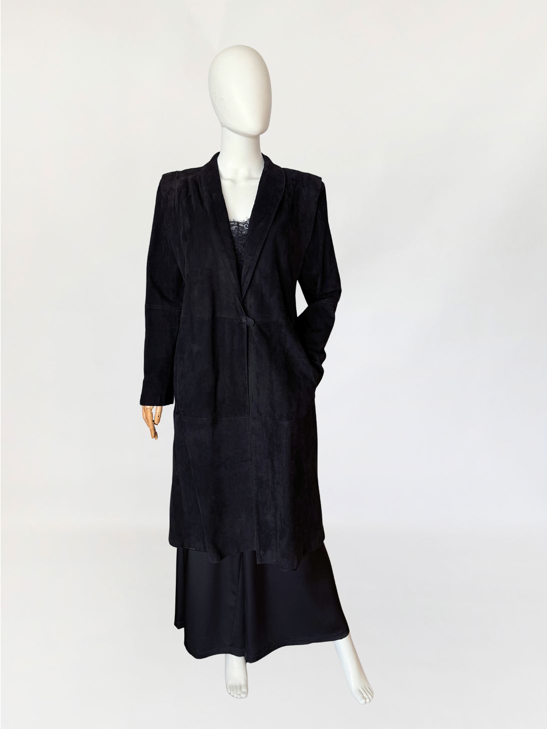 Minimalistyczny płaszcz vintage wykonany z miękkiego naturalnego zamszu w nasyconym odcieniu czerni. Swobodny, prosty fason modelowany pionowymi cięciami konstrukcyjnymi. Zapięcie centralne na jeden powlekany guzik umieszczony w linii talii. Kołnierz o wydłużonej formie, przechodzący w głęboki dekolt w kształcie litery V. Długie rękawy o prostej linii. Ramiona wyraźnie zaznaczone, z delikatnym podniesieniem konstrukcyjnym, od wewnątrz lekko wyściełane. Zdjęcia nie oddają w pełni walorów płaszcza, na żywo prezentuje się rewelacyjnie.