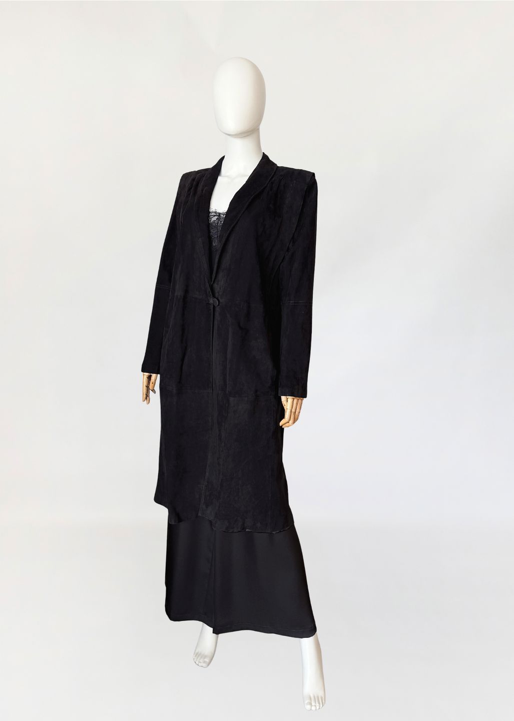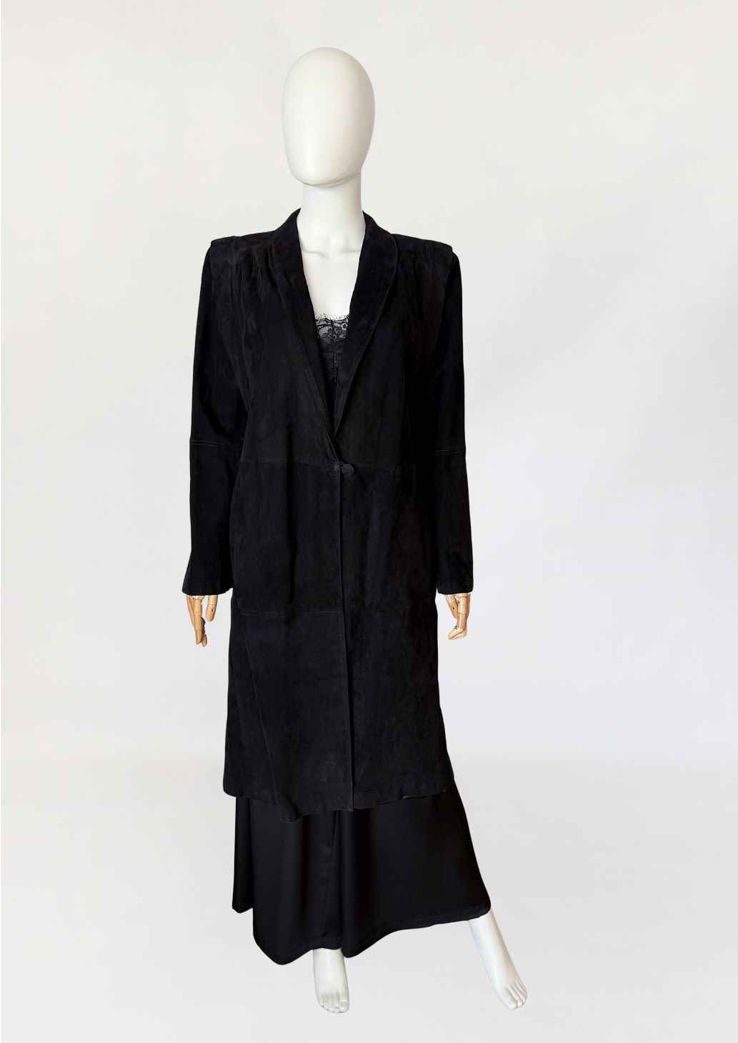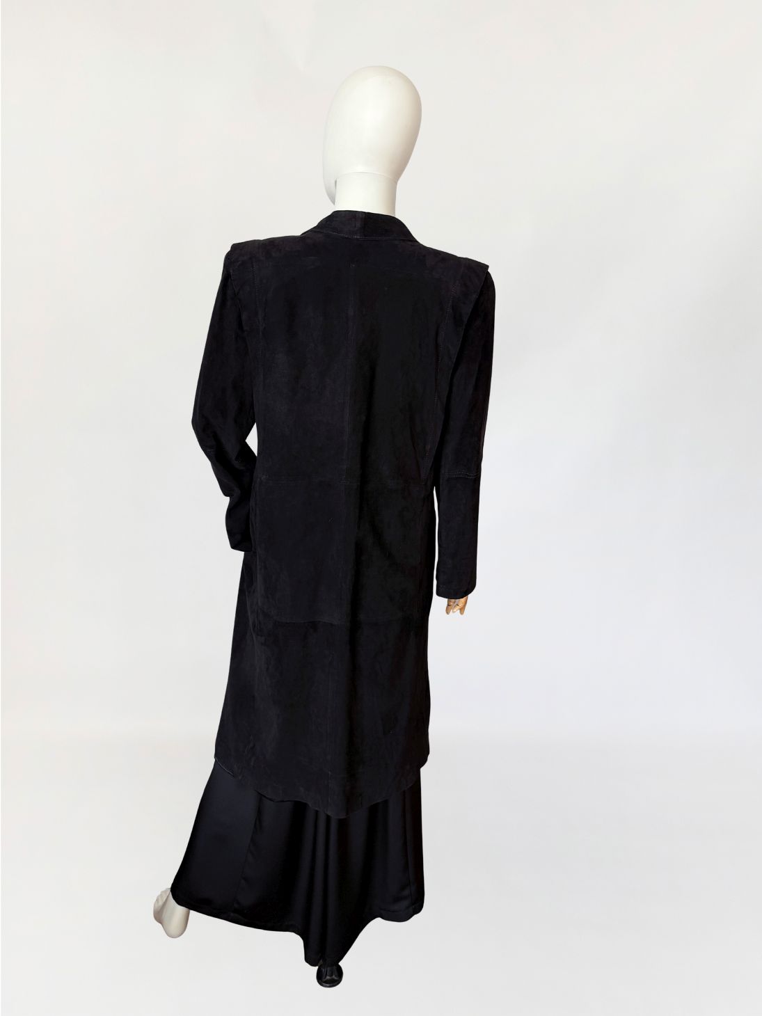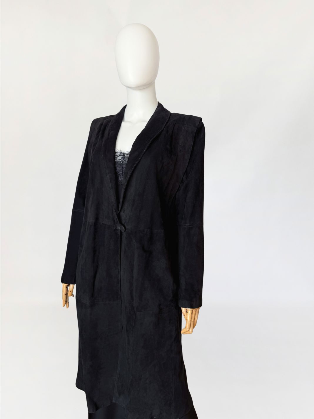 Minimalistyczny płaszcz vintage wykonany z miękkiego naturalnego zamszu w nasyconym odcieniu czerni. Swobodny, prosty fason modelowany pionowymi cięciami konstrukcyjnymi. Zapięcie centralne na jeden powlekany guzik umieszczony w linii talii. Kołnierz o wydłużonej formie, przechodzący w głęboki dekolt w kształcie litery V. Długie rękawy o prostej linii. Ramiona wyraźnie zaznaczone, z delikatnym podniesieniem konstrukcyjnym, od wewnątrz lekko wyściełane. Zdjęcia nie oddają w pełni walorów płaszcza, na żywo prezentuje się rewelacyjnie.
