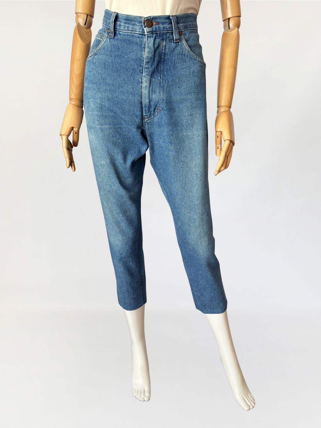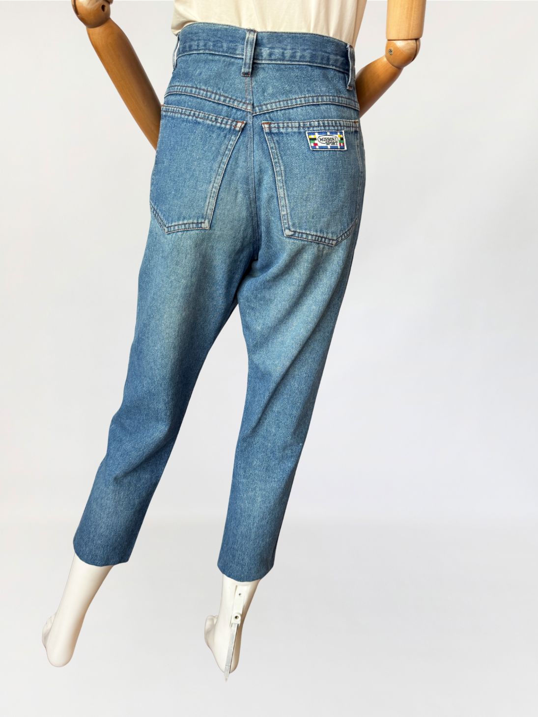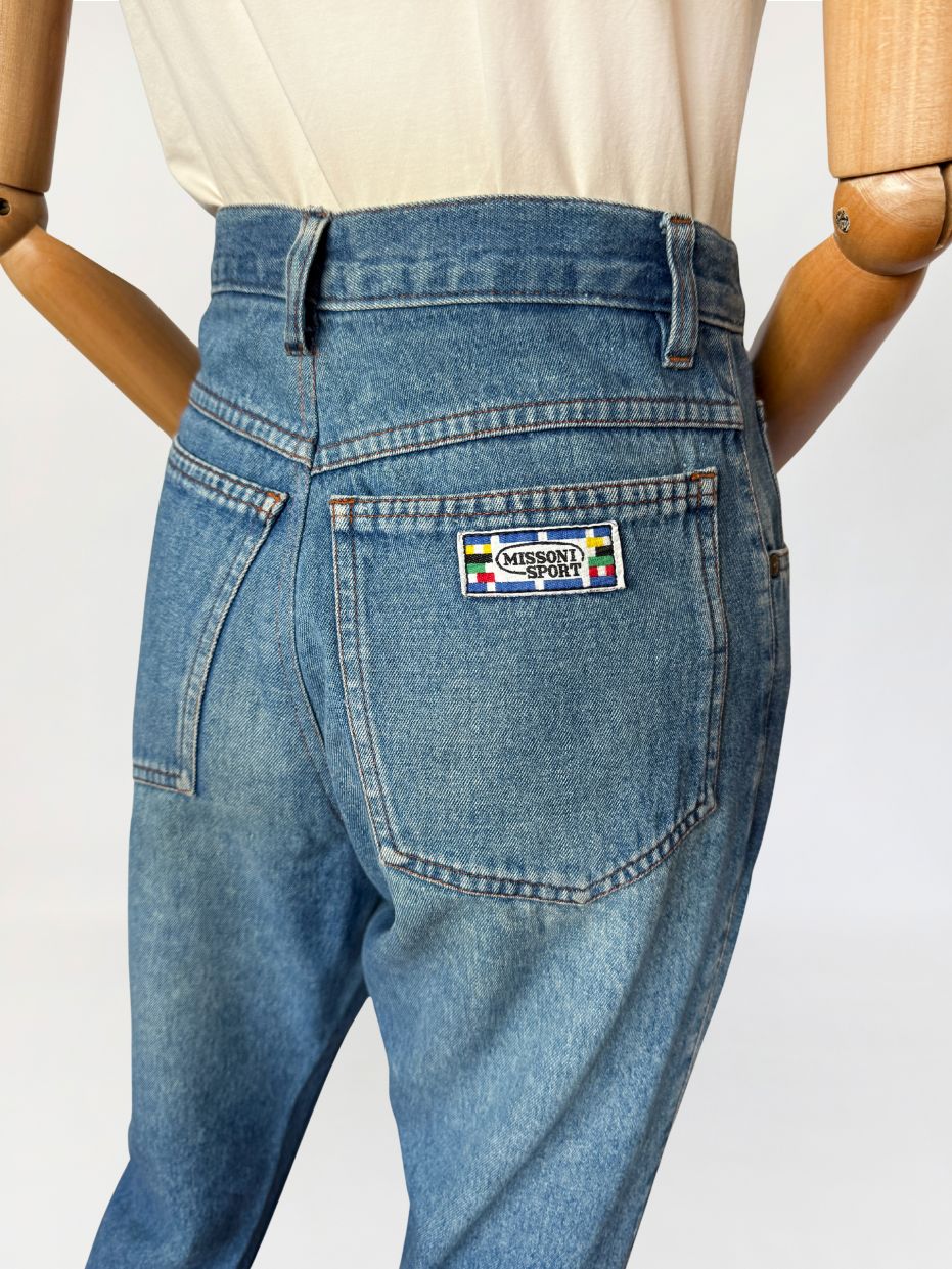 Jeansowe spodnie vintage z la 90-tych marki Missoni. Model z wysokim stanem i nogawkami 7/8. Z tyłu duża logowana metka, oraz mniejsza wszyta w bocznym szwie. Klasyczny układ kieszeni.