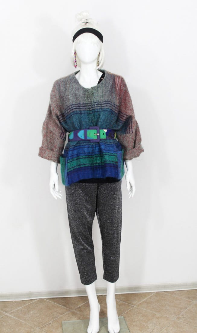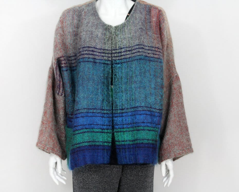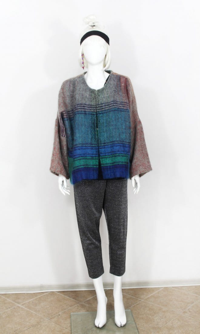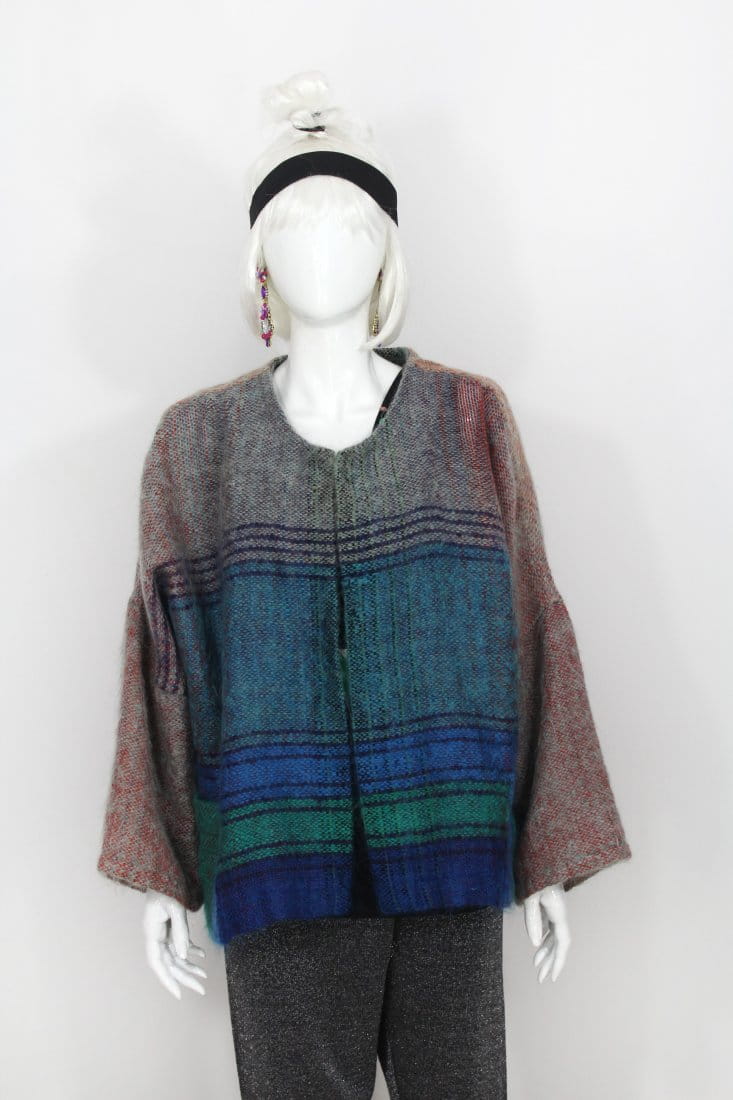 Pudełkowy kolorowy kardigan z moheru. Krój oversizowy, nie jest zapinany. U dołu po bokach naszywane kieszenie.