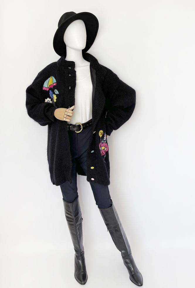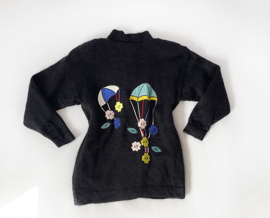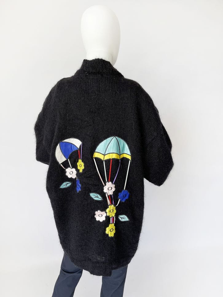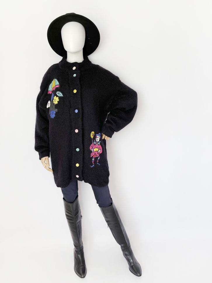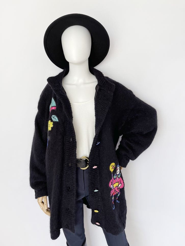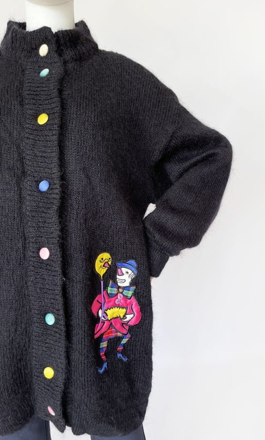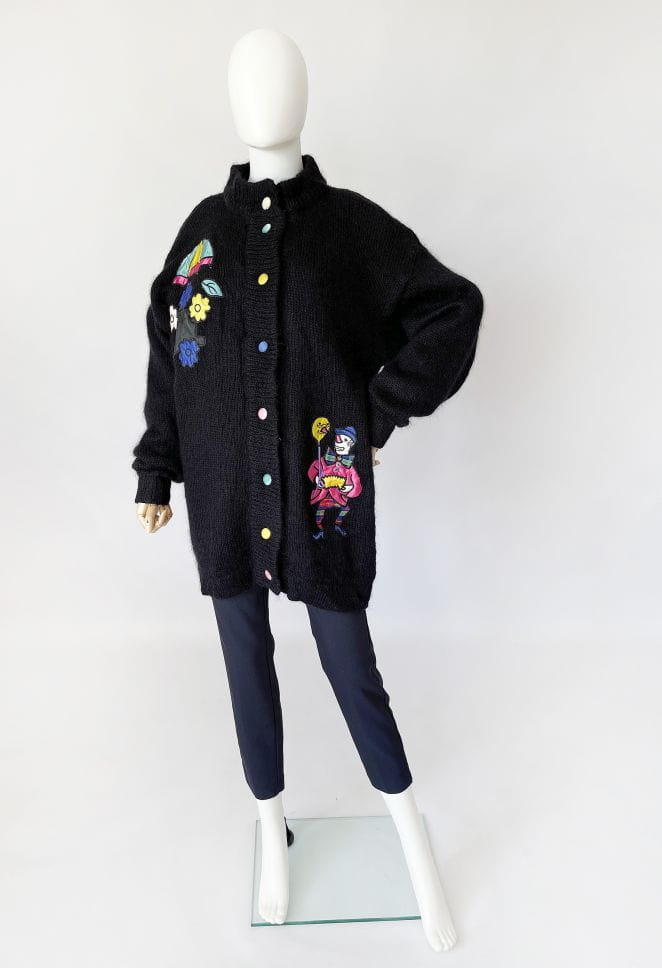 Przepiękny, rzadki okaz vintage z lat 80-tych. Jeden z - kultowych już modeli, moherowych swetrów z motywem klaunów, których ceny na zagranicznych portalach osiągają zawrotne rozmiary. Rozpinany długi kardigan vintage. Wykonany z puchatego moheru w kolorze czarnym. Zapinany na kolorowe oblekane guziki. Długie rękawy, ramiona lekko usztywnione. Obustronne wyszywane okazałe aplikacje, kwiaty, klauny i balony z kolorowymi tasiemkami. Od wewnątrz na podszewce. Z powodzeniem zastąpi płaszcz jesienią.