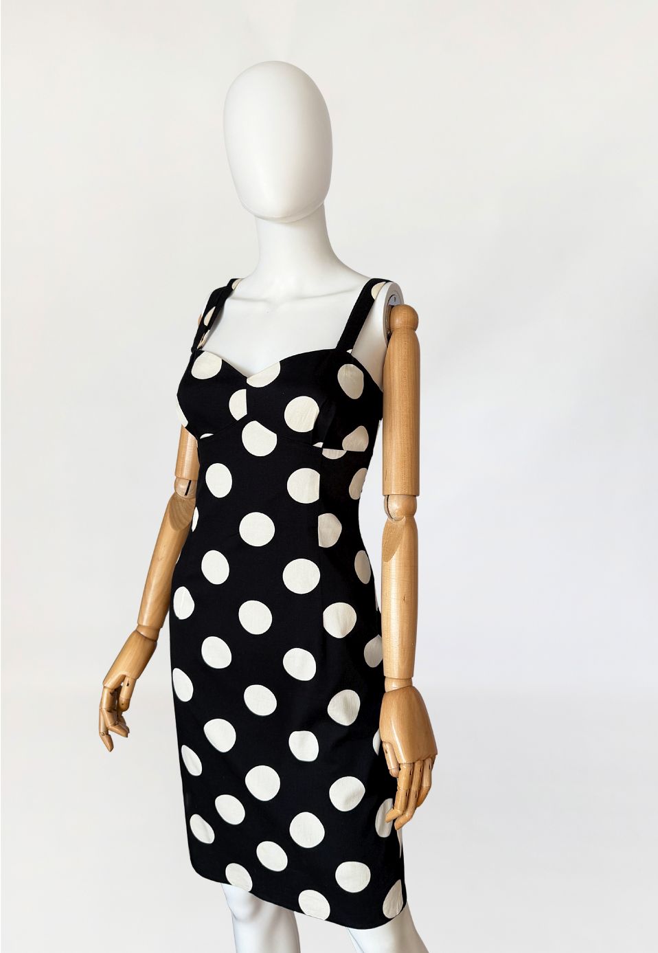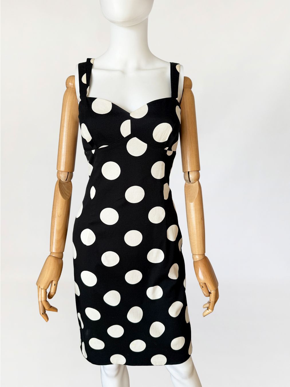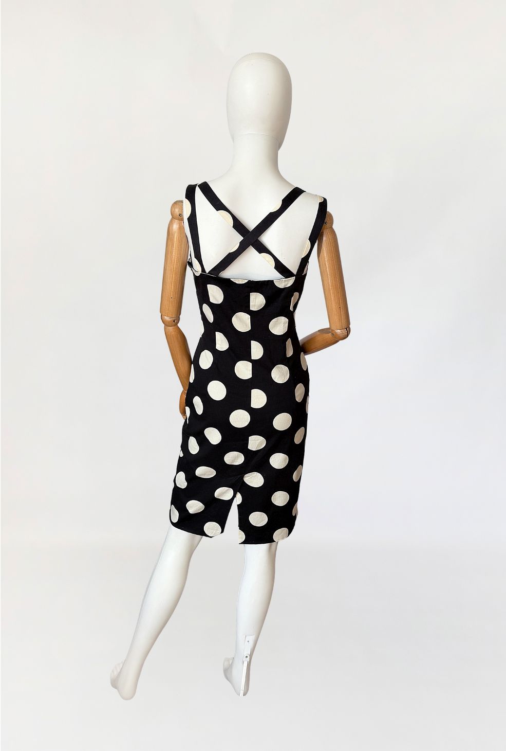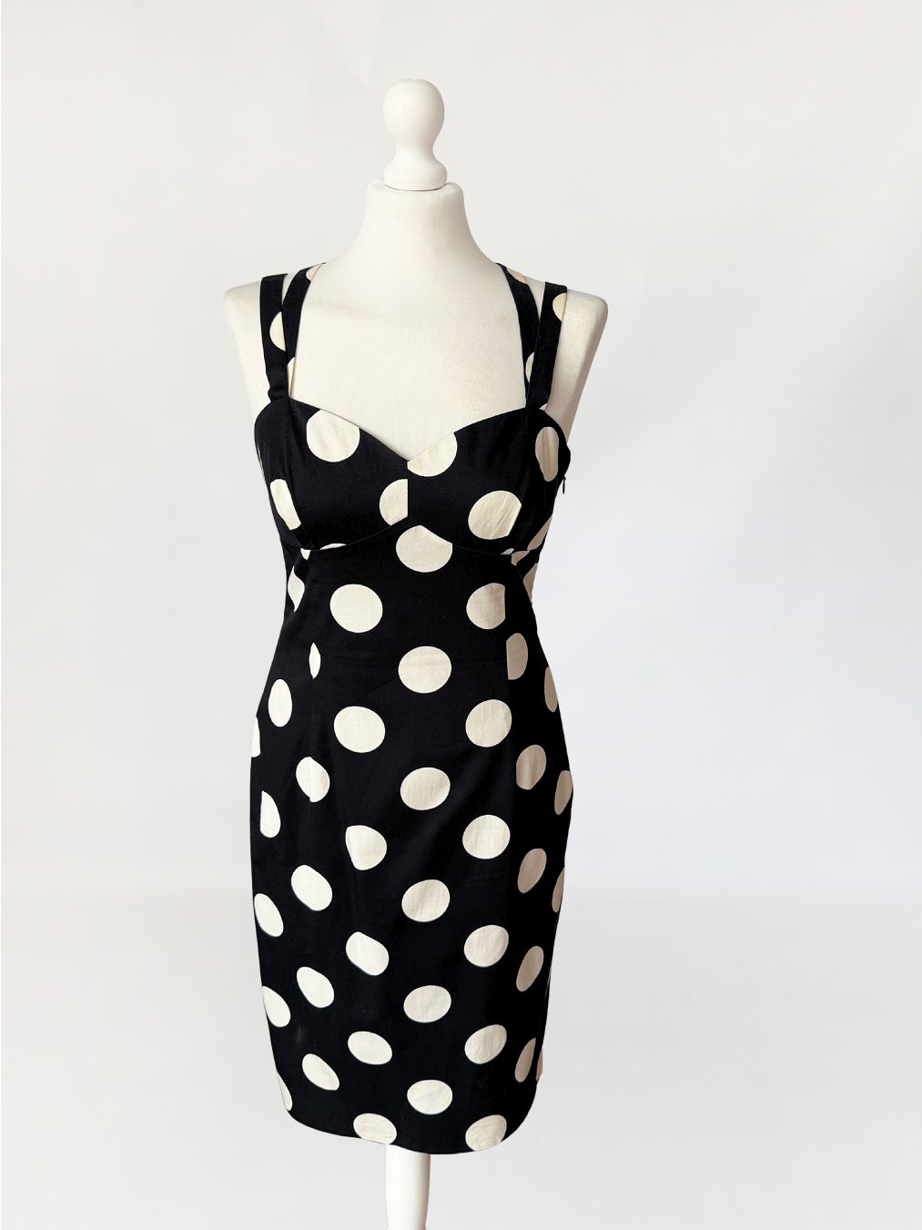 Sukienka vintage z lat 90-tych od marki Moschino, linia Moschino Jeans. Wykonana z czarnej elastycznej bawełnianej tkaniny o deseniu w duże kontrastowe grochy. Dopasowany fason modelujący sylwetkę poprzez pionowe cięcia. Góra o konstrukcji gorsetowej z profilowanymi miseczkami i wyraźnie zaznaczoną linią biustu. Dekolt prosty z lekkim wycięciem w kształcie serca. Cienkie podwójne ramiączka krzyżujące się na plecach. Z tyłu rozporek. Od wewnątrz na podszewce.