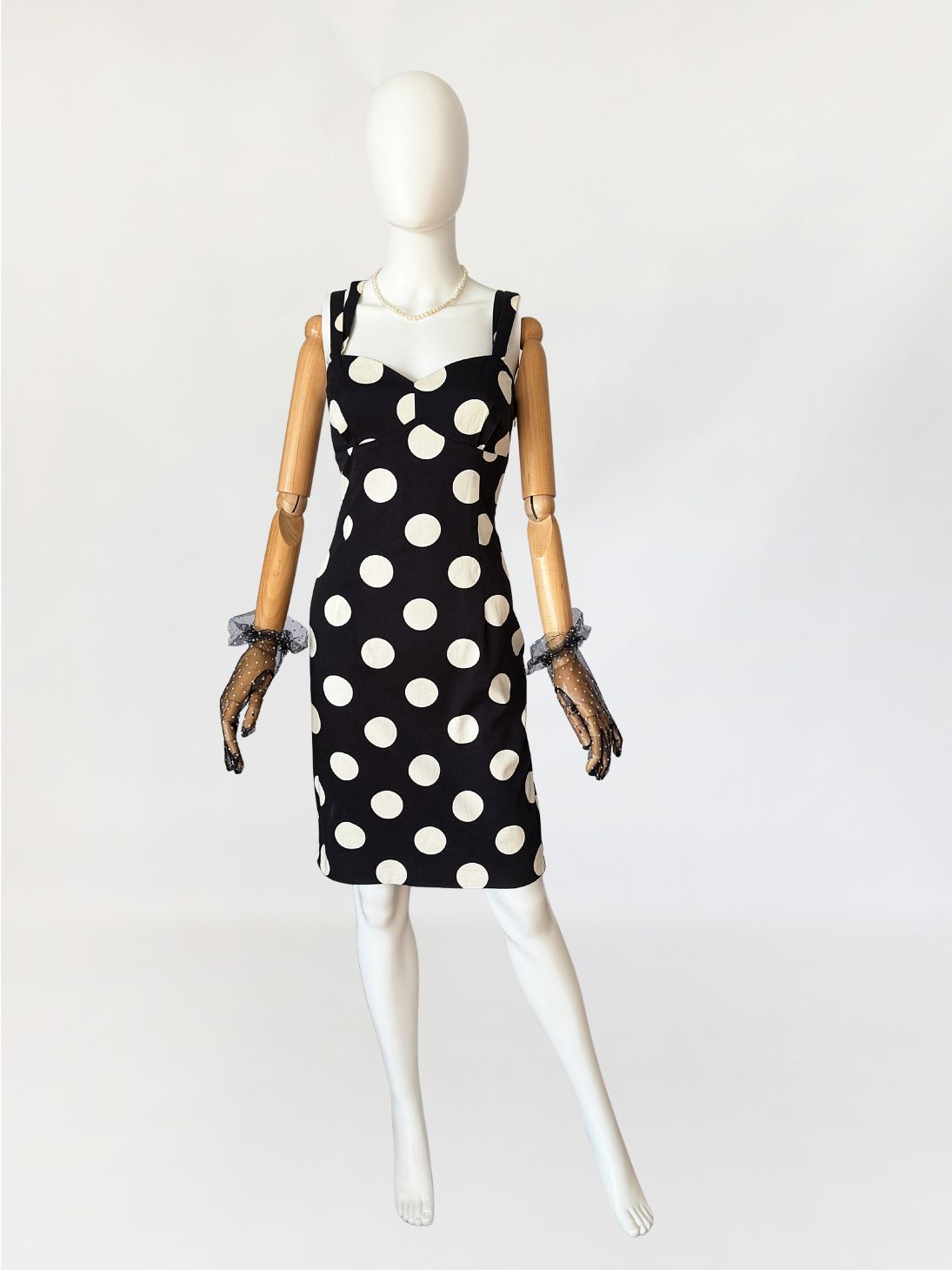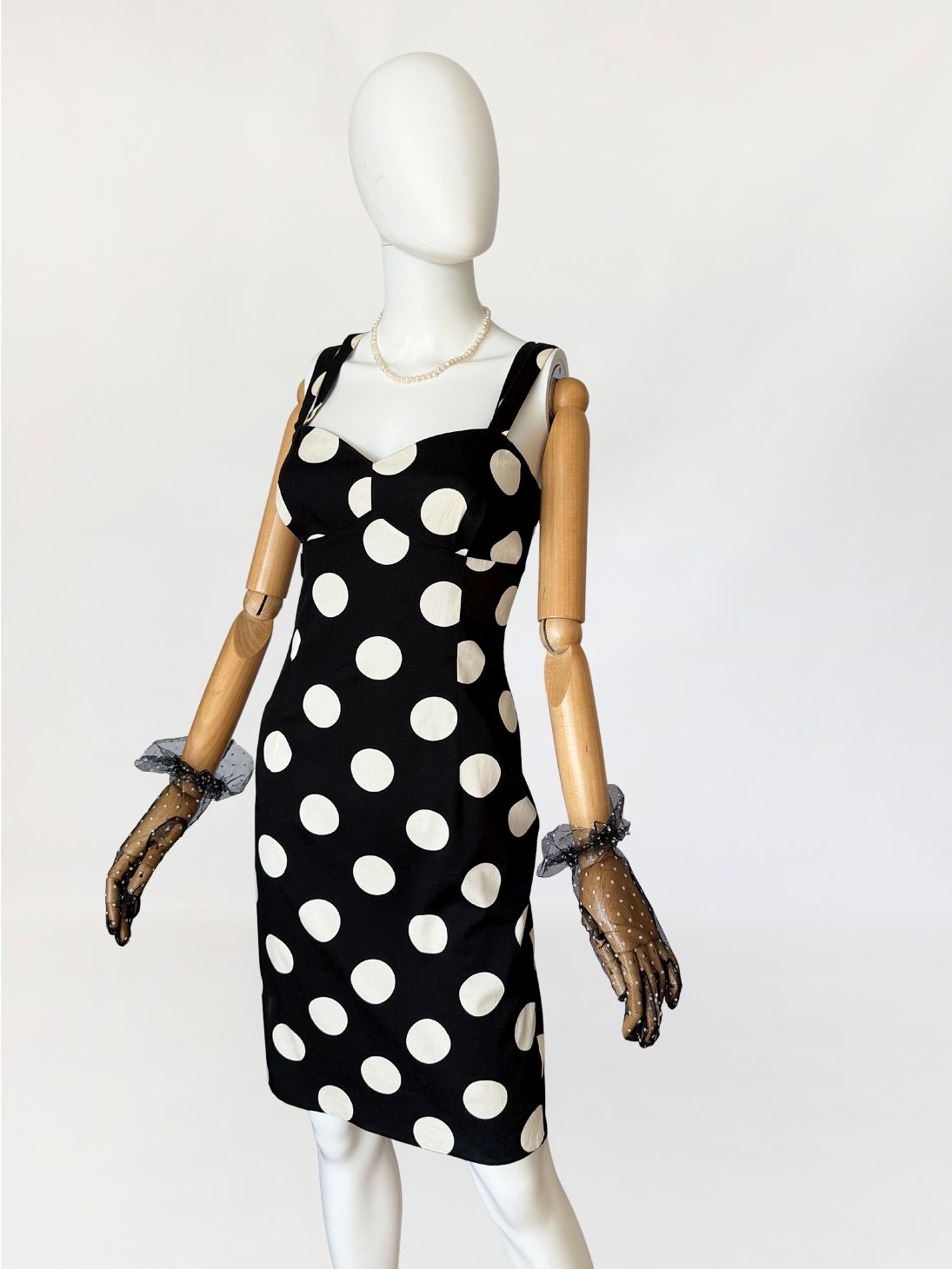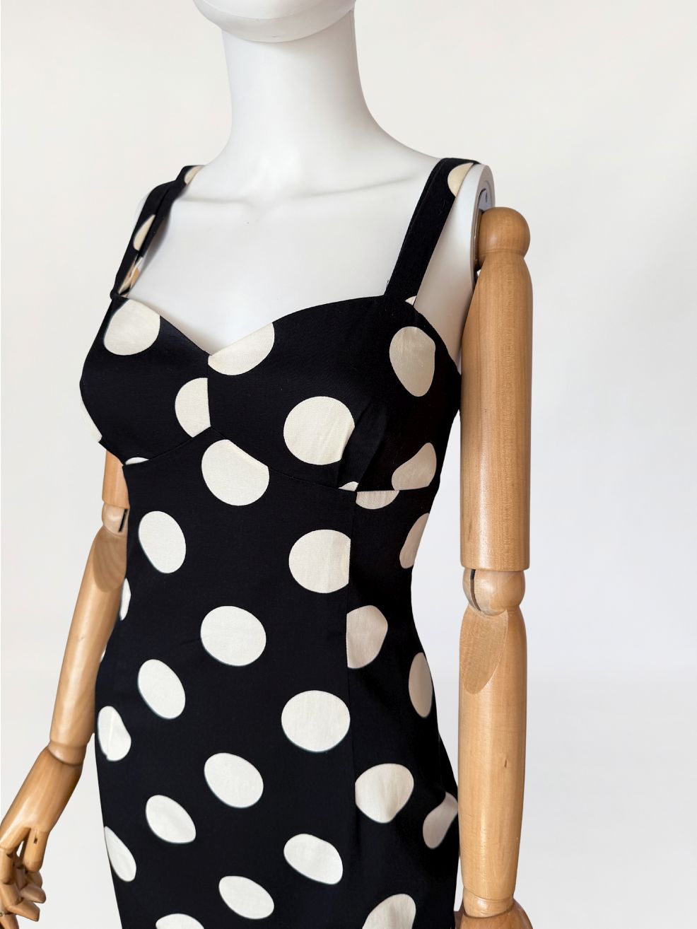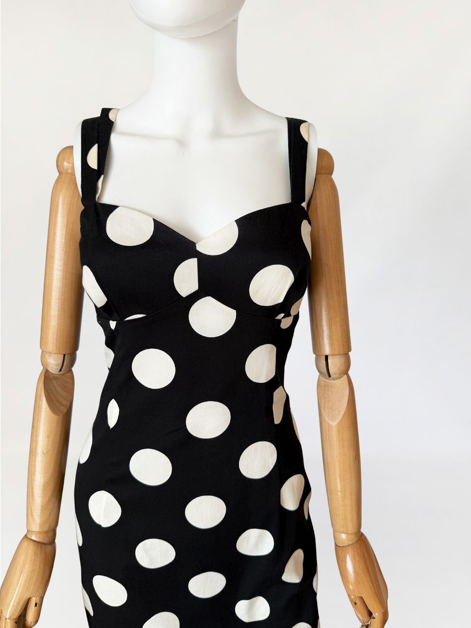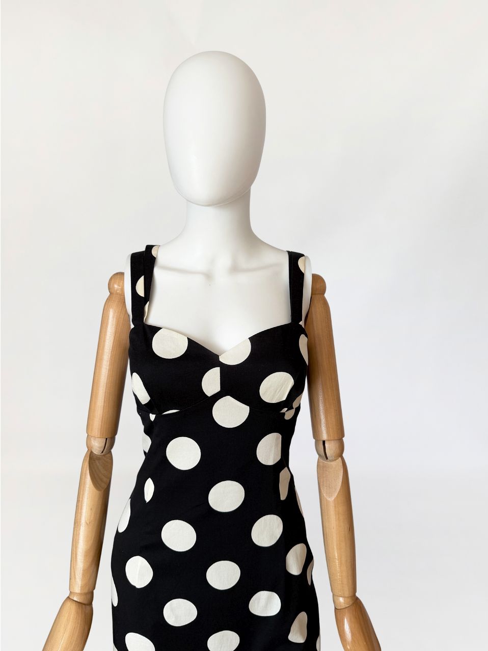 Sukienka vintage z lat 90-tych od marki Moschino, linia Moschino Jeans. Wykonana z czarnej elastycznej bawełnianej tkaniny o deseniu w duże kontrastowe grochy. Dopasowany fason modelujący sylwetkę poprzez pionowe cięcia. Góra o konstrukcji gorsetowej z profilowanymi miseczkami i wyraźnie zaznaczoną linią biustu. Dekolt prosty z lekkim wycięciem w kształcie serca. Cienkie podwójne ramiączka krzyżujące się na plecach. Z tyłu rozporek. Od wewnątrz na podszewce.