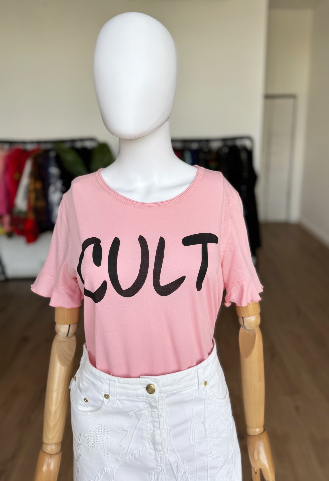 T-shirt marki Moschino wykonany z lekkiej bawełnianej tkaniny w cukierkowym różowym kolorze. Krótkie rękawy z falbaniastym wykończeniem. Od frontu duży nadruk, na karku mniejszy - z nazwą marki.