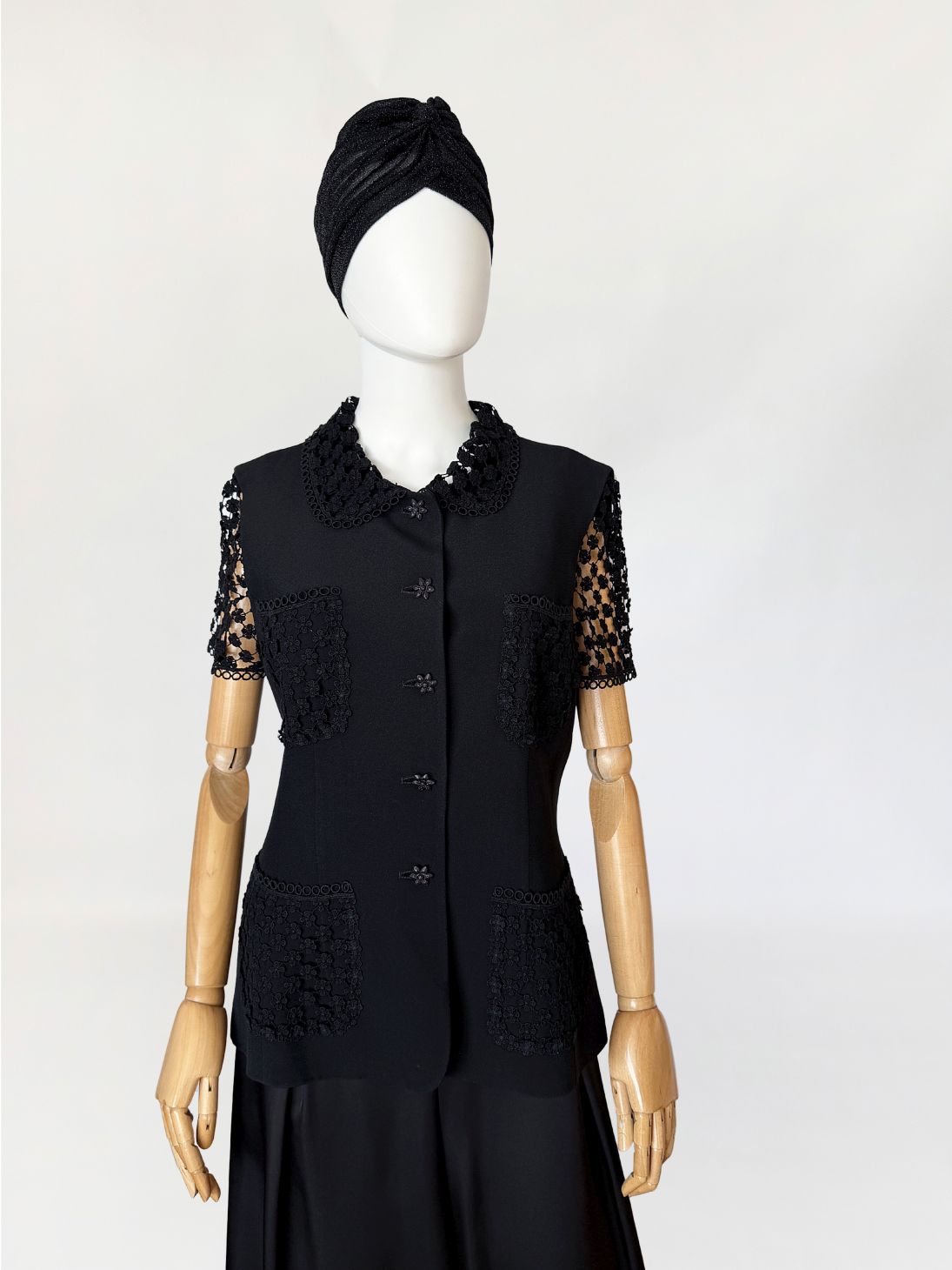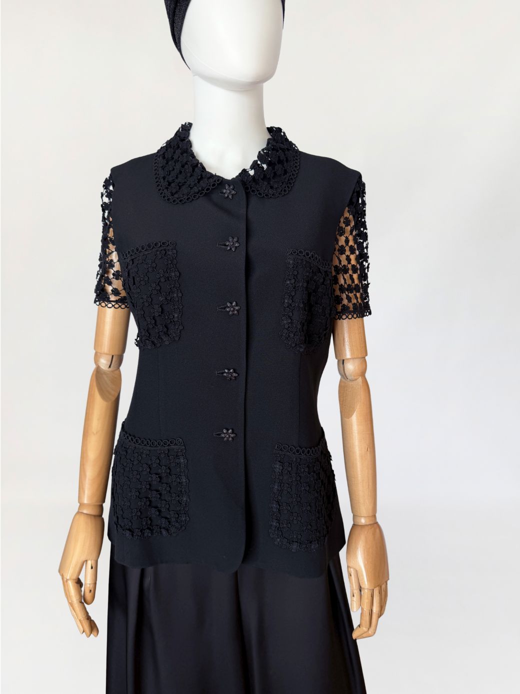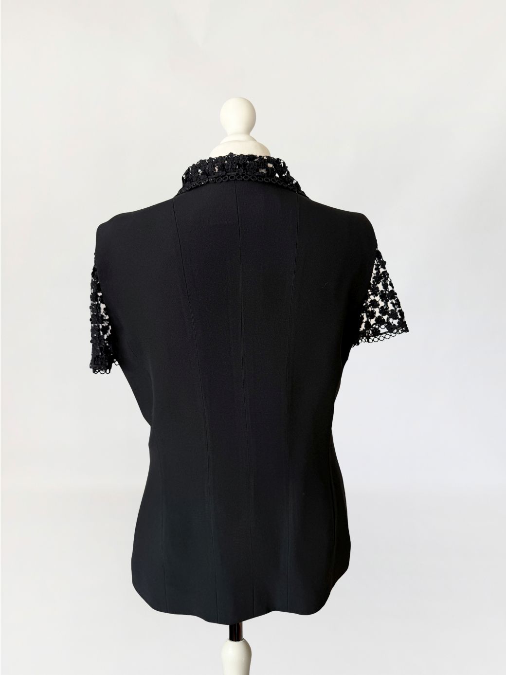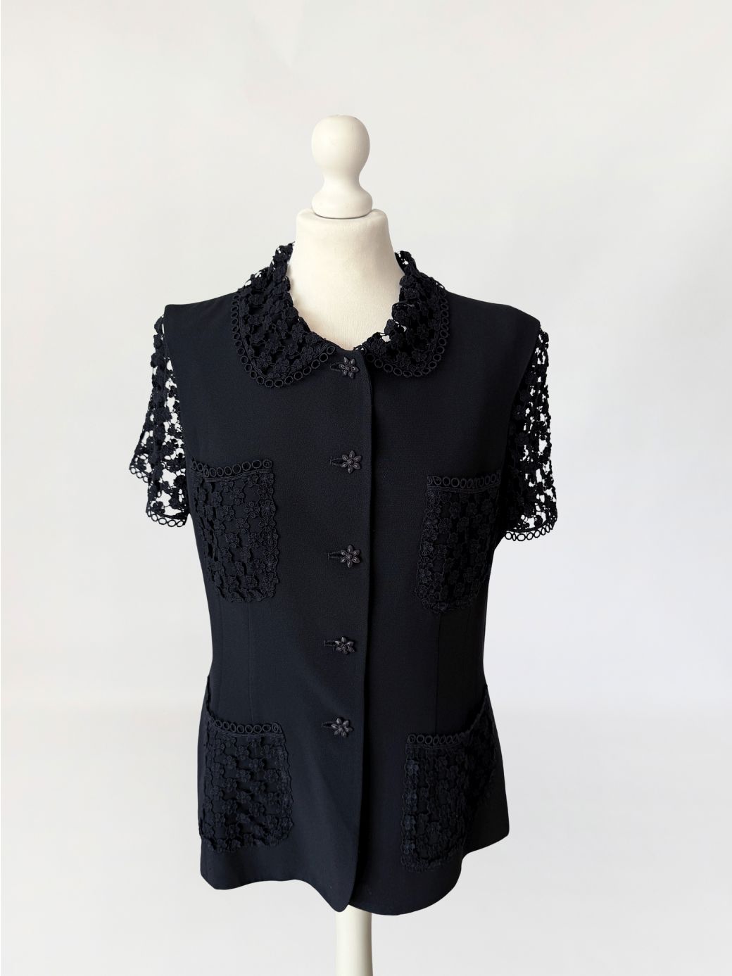 Żakiet Moschino, z lini Cheap&Chick vintage 90s/00s. Dopasowany fason, talia podkreślona dzięki precyzyjnym cięciom modelującym. U góry nieduży, zaokrąglany kołnierz z grubej koronki. Zapięcie na rząd dekoracyjnych guzików o formie kwiatowej, rozmieszczonych centralnie na przodzie. Rękawy krótkie, wykonane z z grubej koronki o powtarzalnym motywie florystycznym, z wykończeniem krawędzi taśmą dekoracyjną spójną z detalami przy kołnierzu i kieszeniach. Na wysokości biustu oraz w dolnej części przodu naszyte cztery kieszenie nakładane, w całości pokryte koronką. Tył gładki, z pionowymi cięciami konstrukcyjnymi.