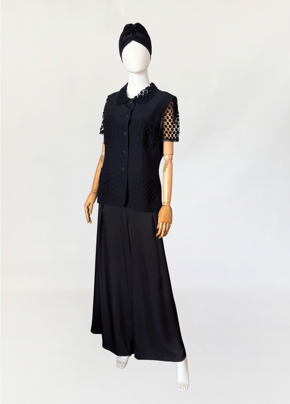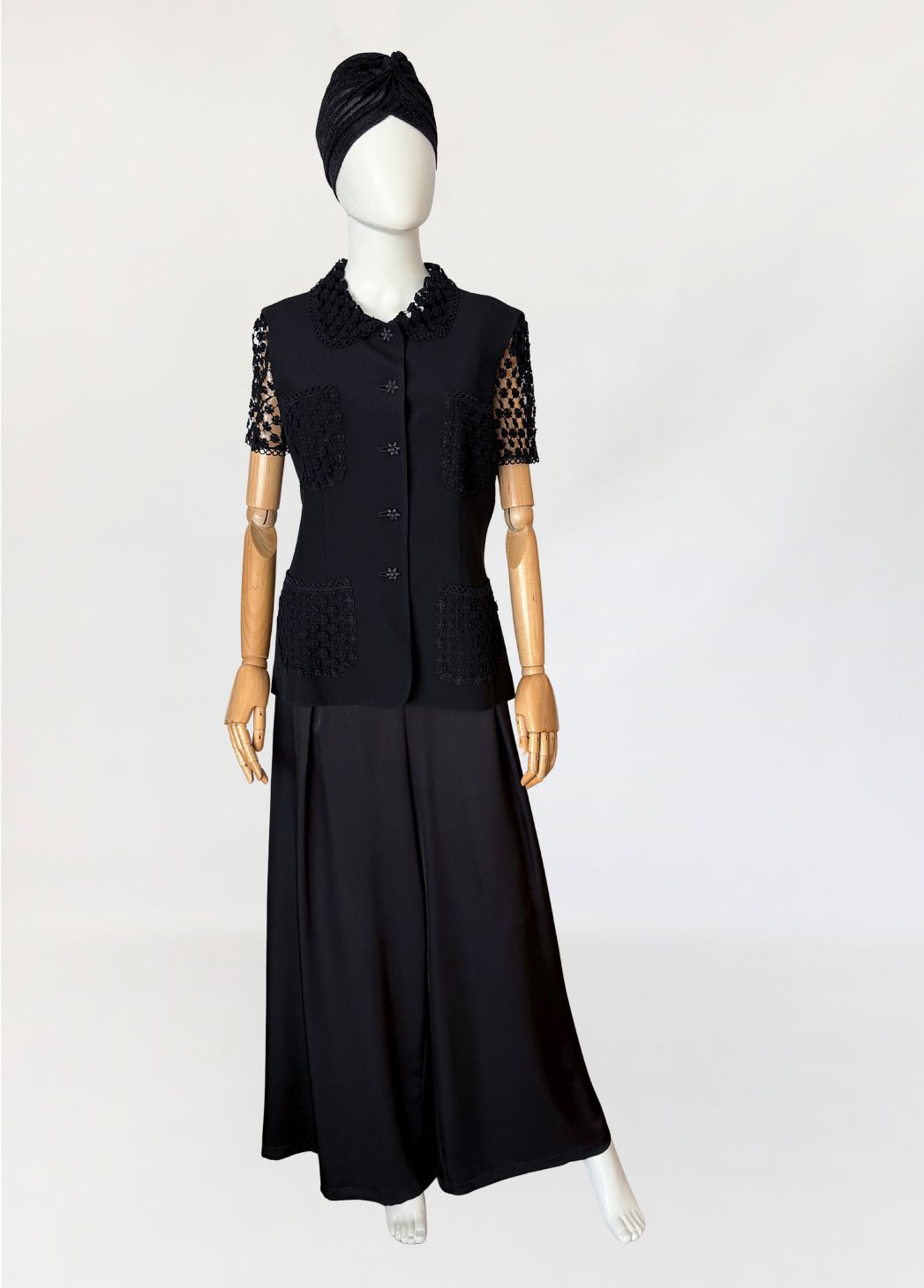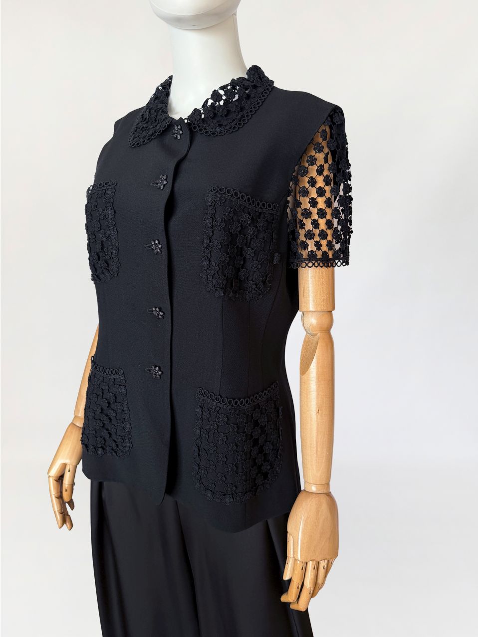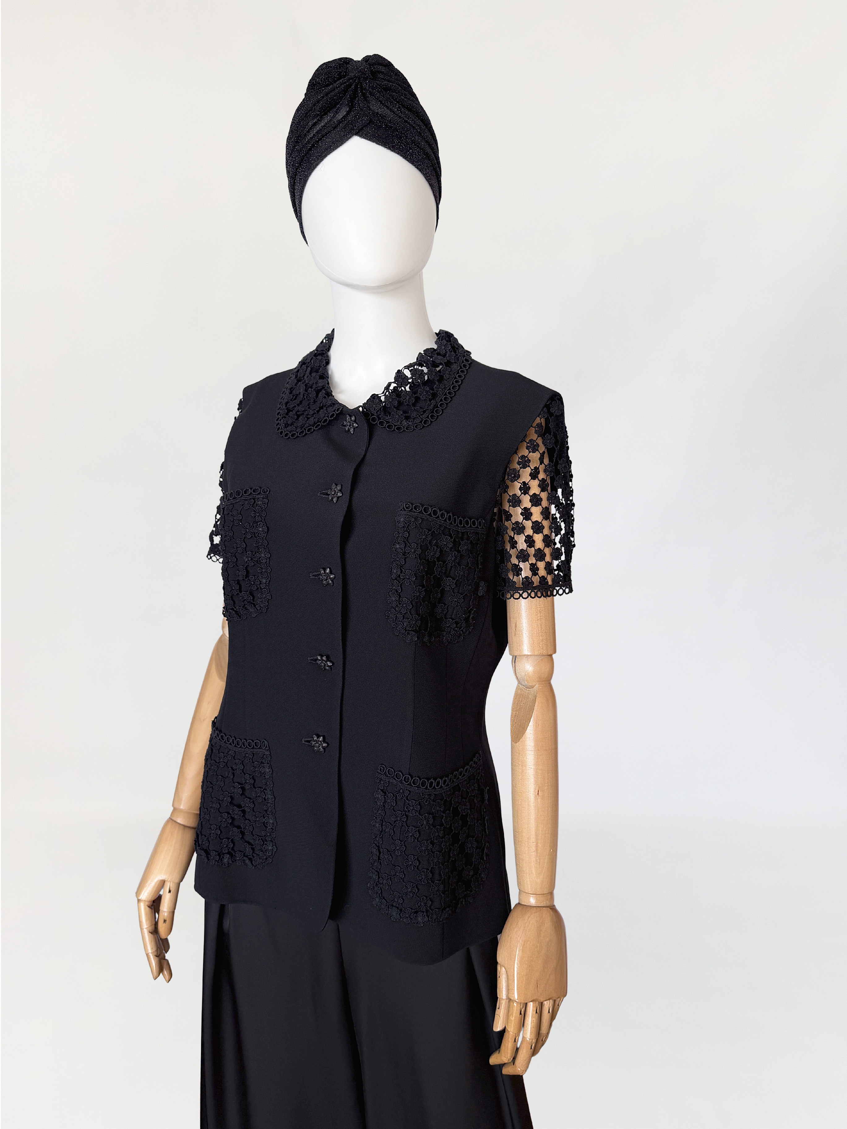 Żakiet Moschino, z lini Cheap&Chick vintage 90s/00s. Dopasowany fason, talia podkreślona dzięki precyzyjnym cięciom modelującym. U góry nieduży, zaokrąglany kołnierz z grubej koronki. Zapięcie na rząd dekoracyjnych guzików o formie kwiatowej, rozmieszczonych centralnie na przodzie. Rękawy krótkie, wykonane z z grubej koronki o powtarzalnym motywie florystycznym, z wykończeniem krawędzi taśmą dekoracyjną spójną z detalami przy kołnierzu i kieszeniach. Na wysokości biustu oraz w dolnej części przodu naszyte cztery kieszenie nakładane, w całości pokryte koronką. Tył gładki, z pionowymi cięciami konstrukcyjnymi.