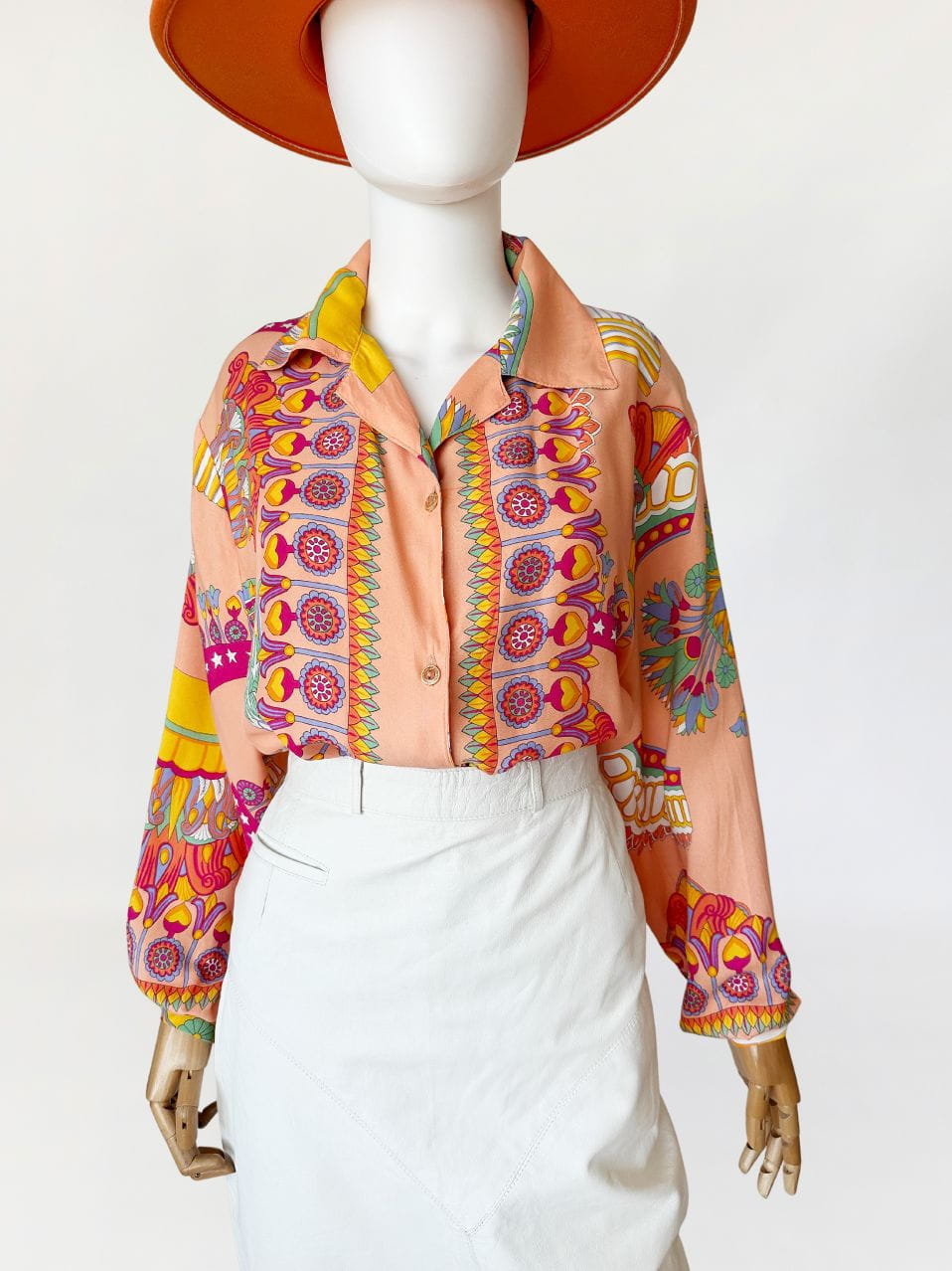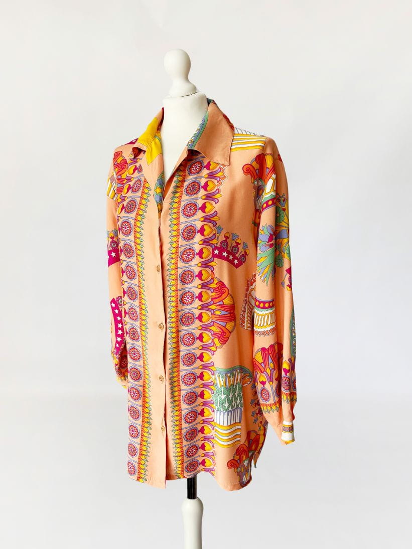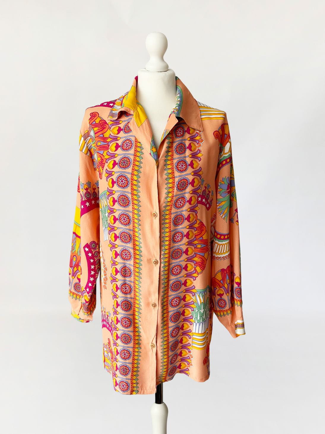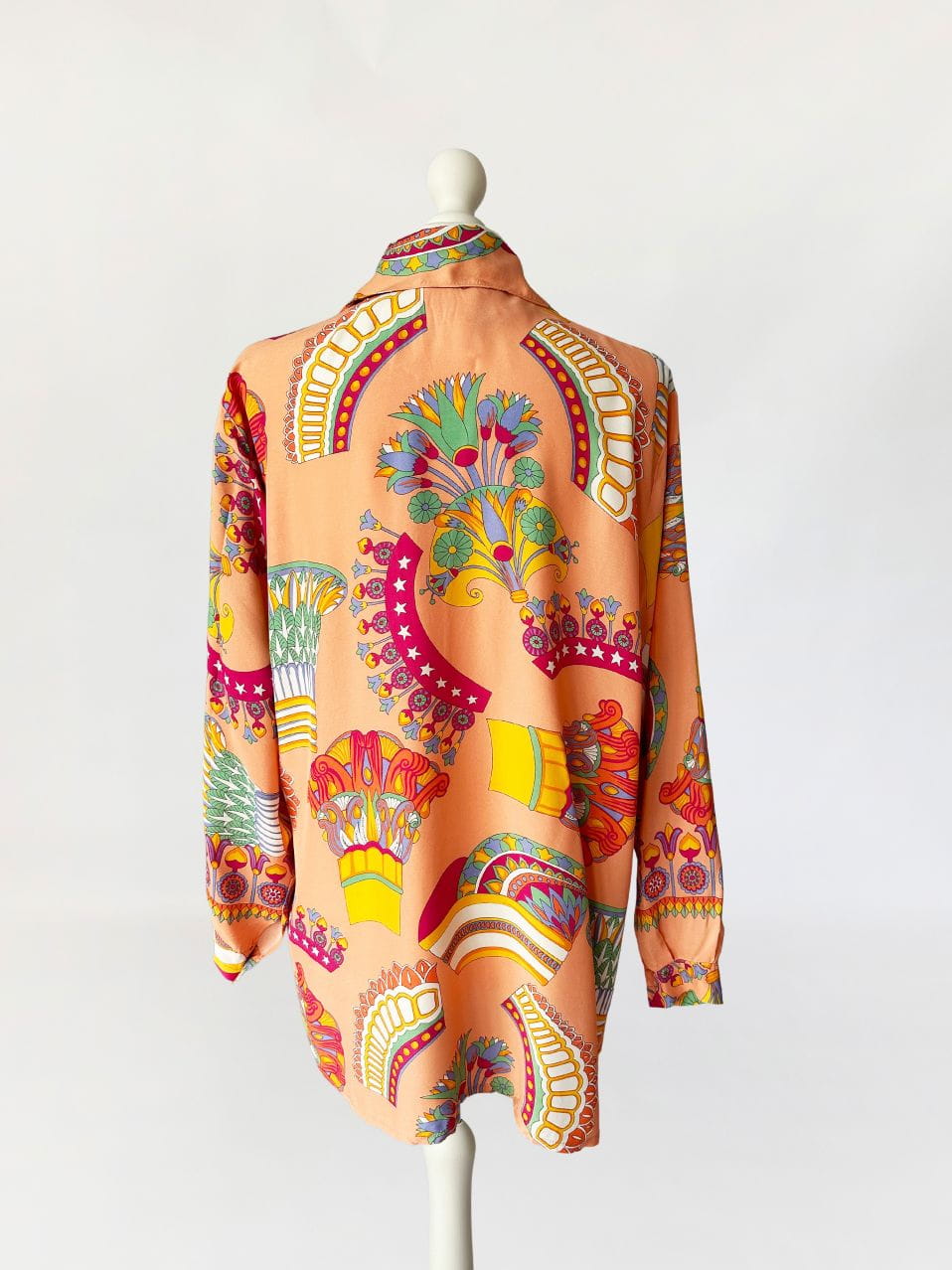 Włoska koszula vintage wykonana z wiskozowej tkaniny w multikolorowe wzory w stylu lat 70-tych. Klasyczny fason z długimi rękawami.