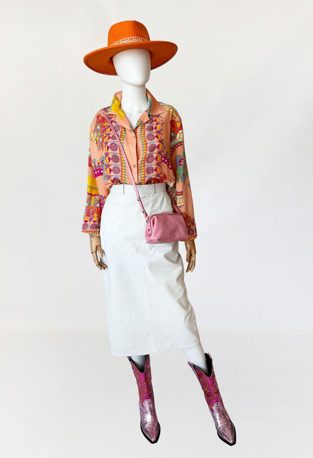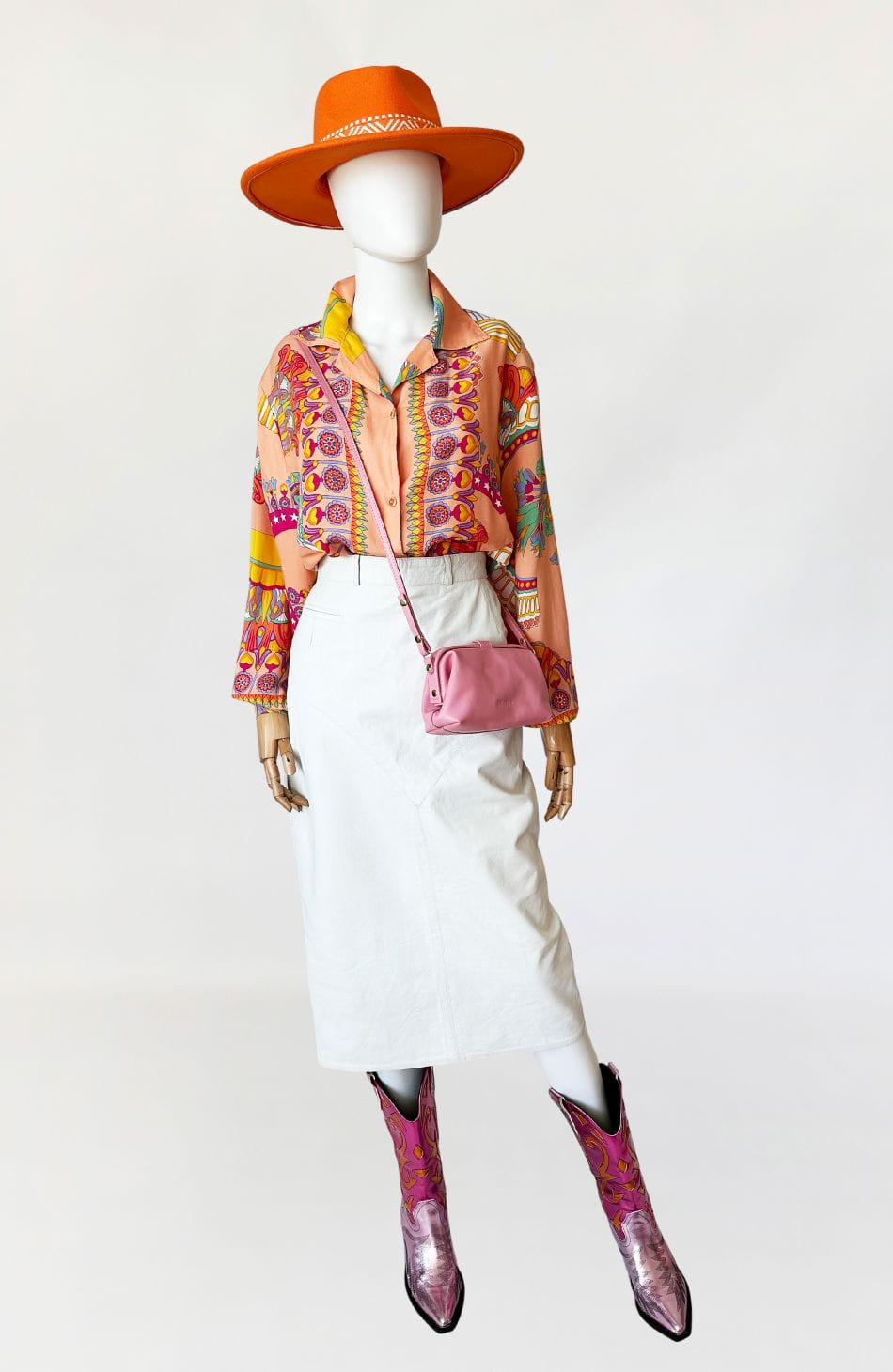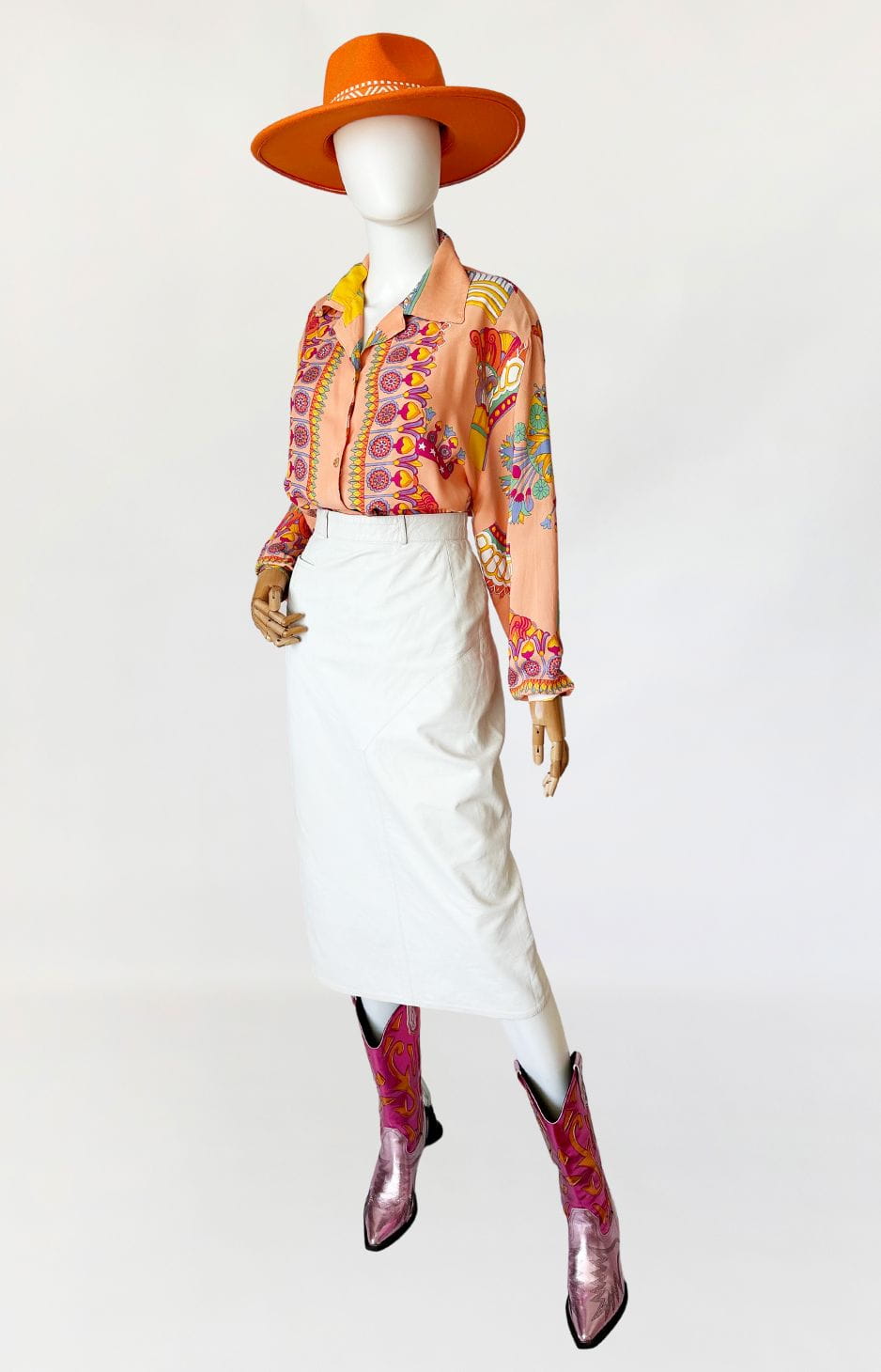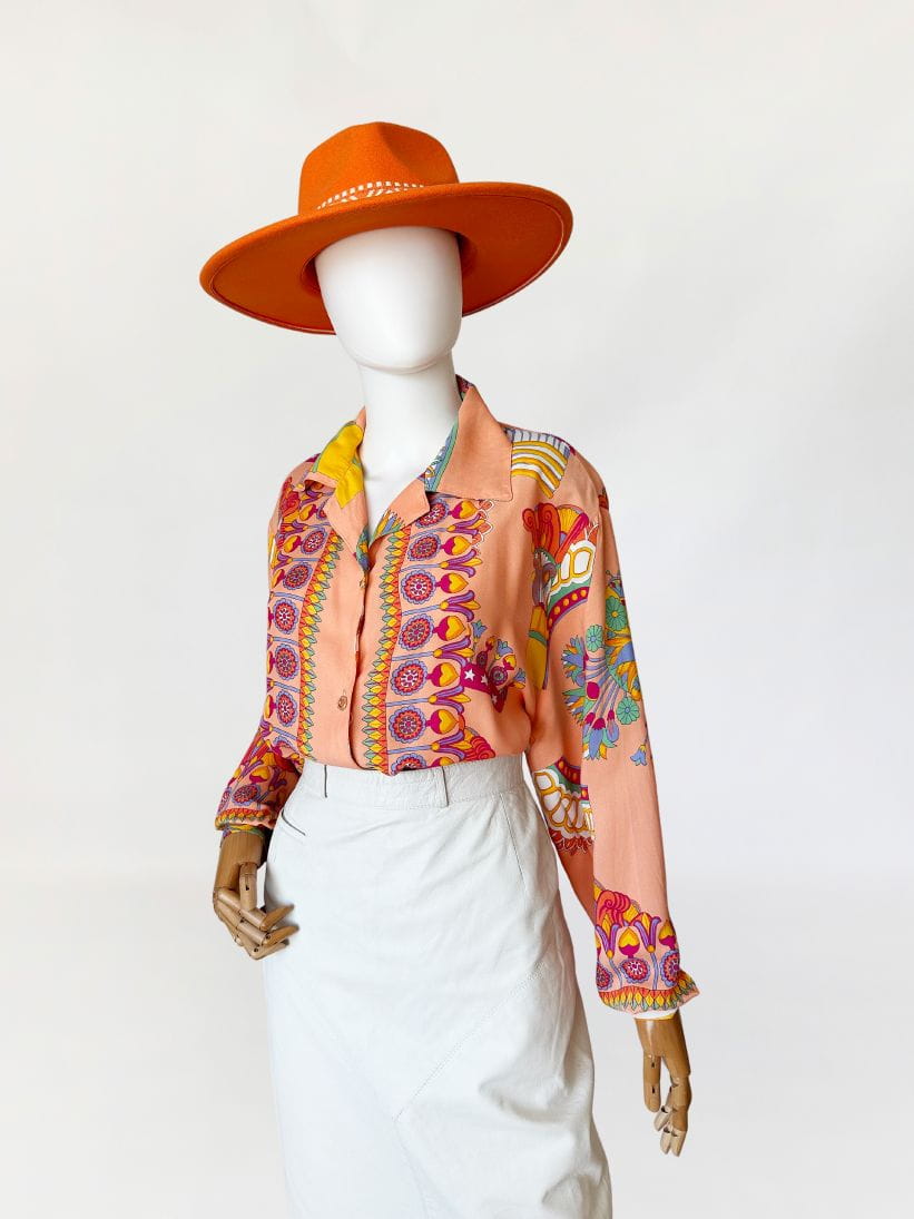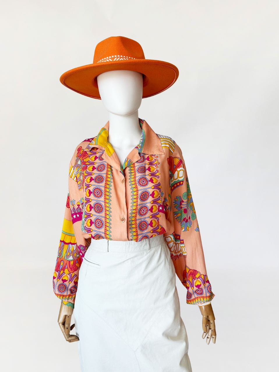 Włoska koszula vintage wykonana z wiskozowej tkaniny w multikolorowe wzory w stylu lat 70-tych. Klasyczny fason z długimi rękawami.