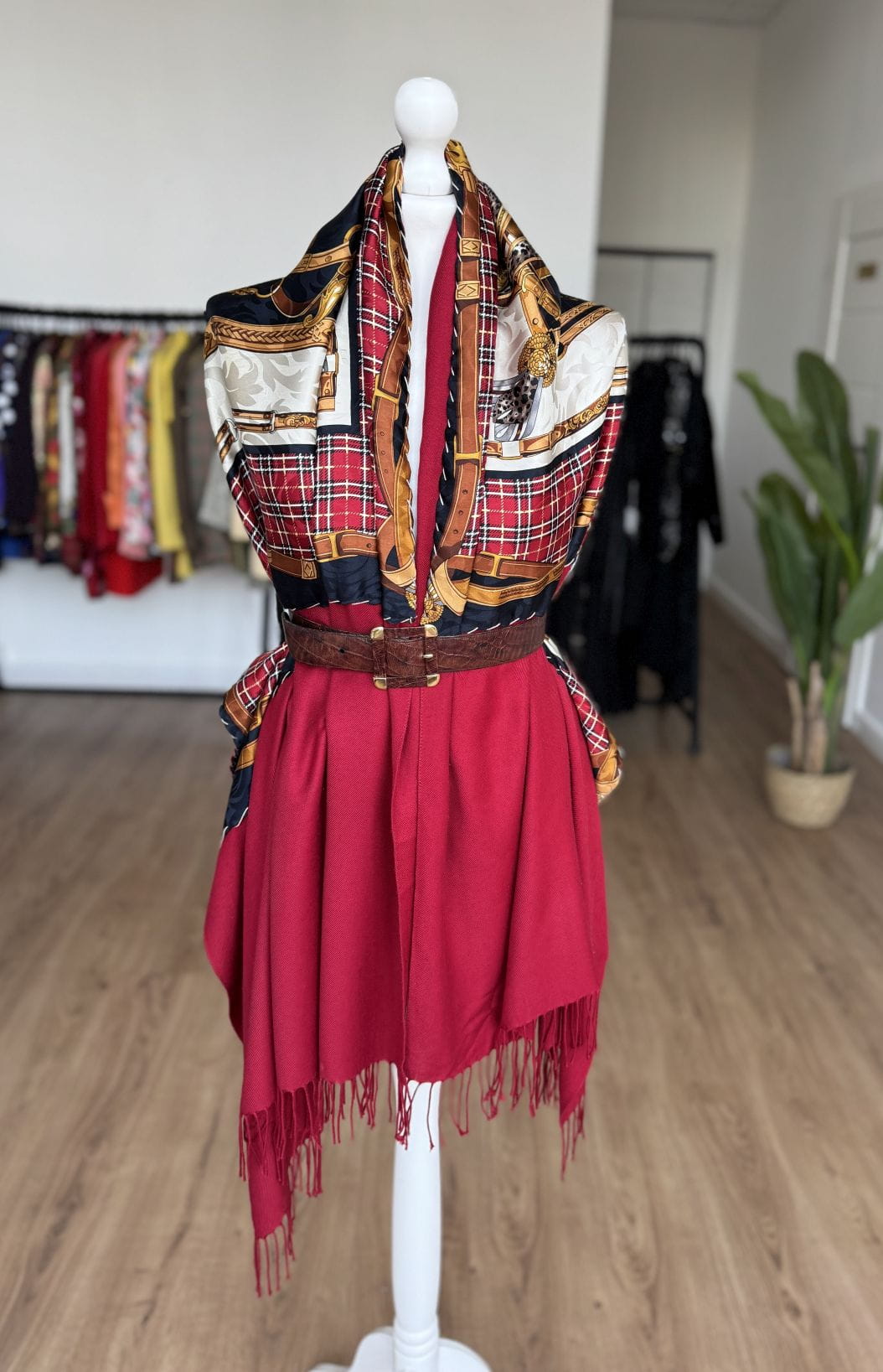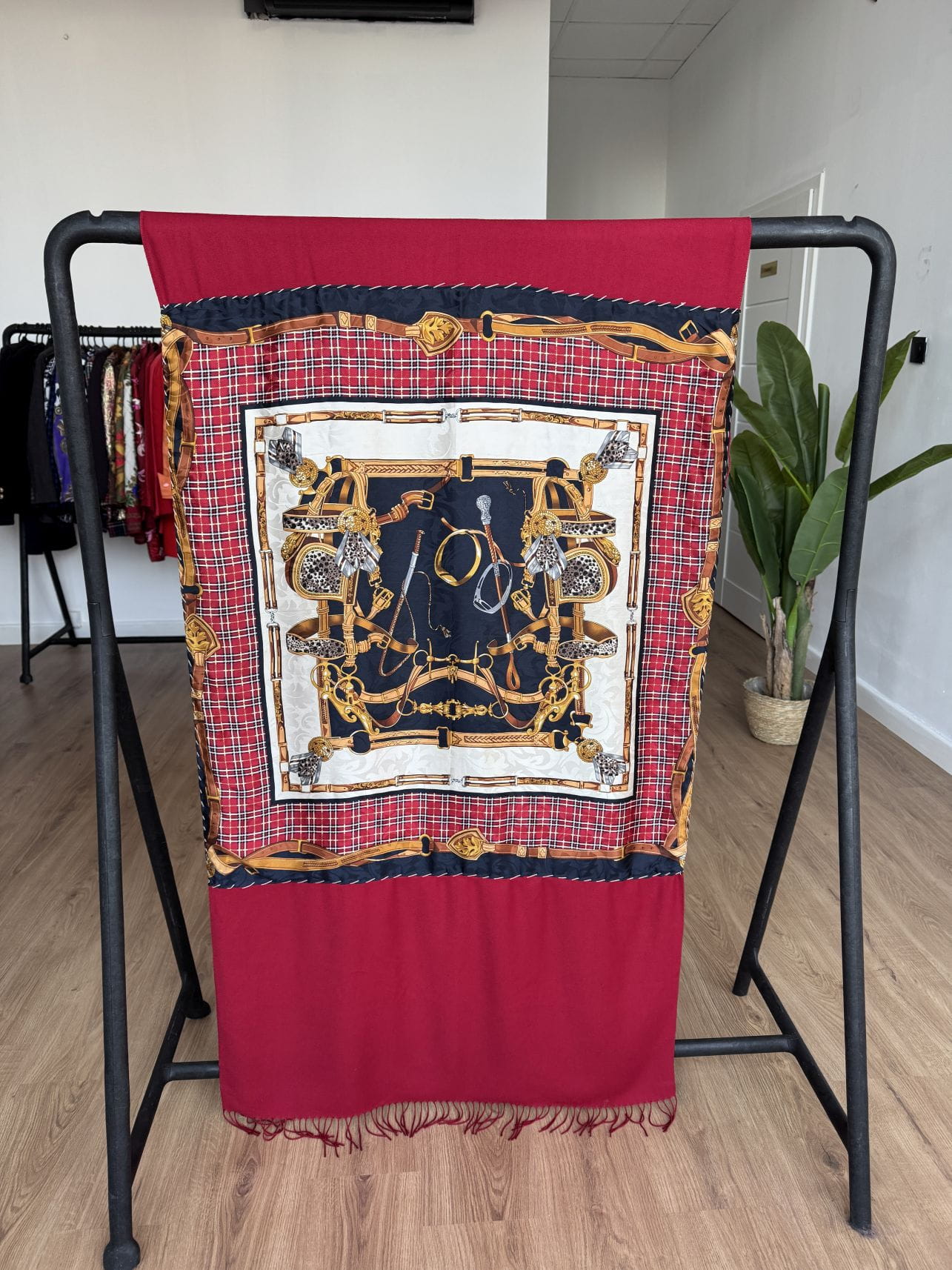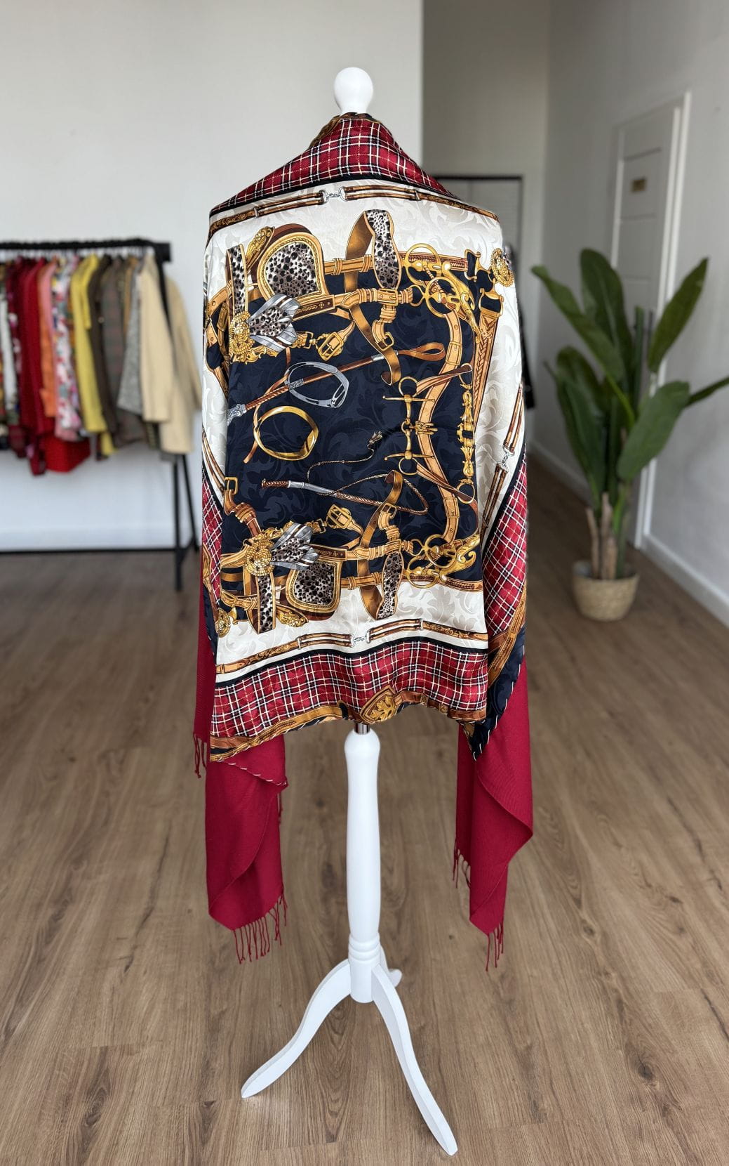 Ogromny szal vintage. Obszerny, długi, zakończony drobnymi frędzlami. W centralnej części jedwabna 'apaszkowa' wstawka w barokowe wzory.
