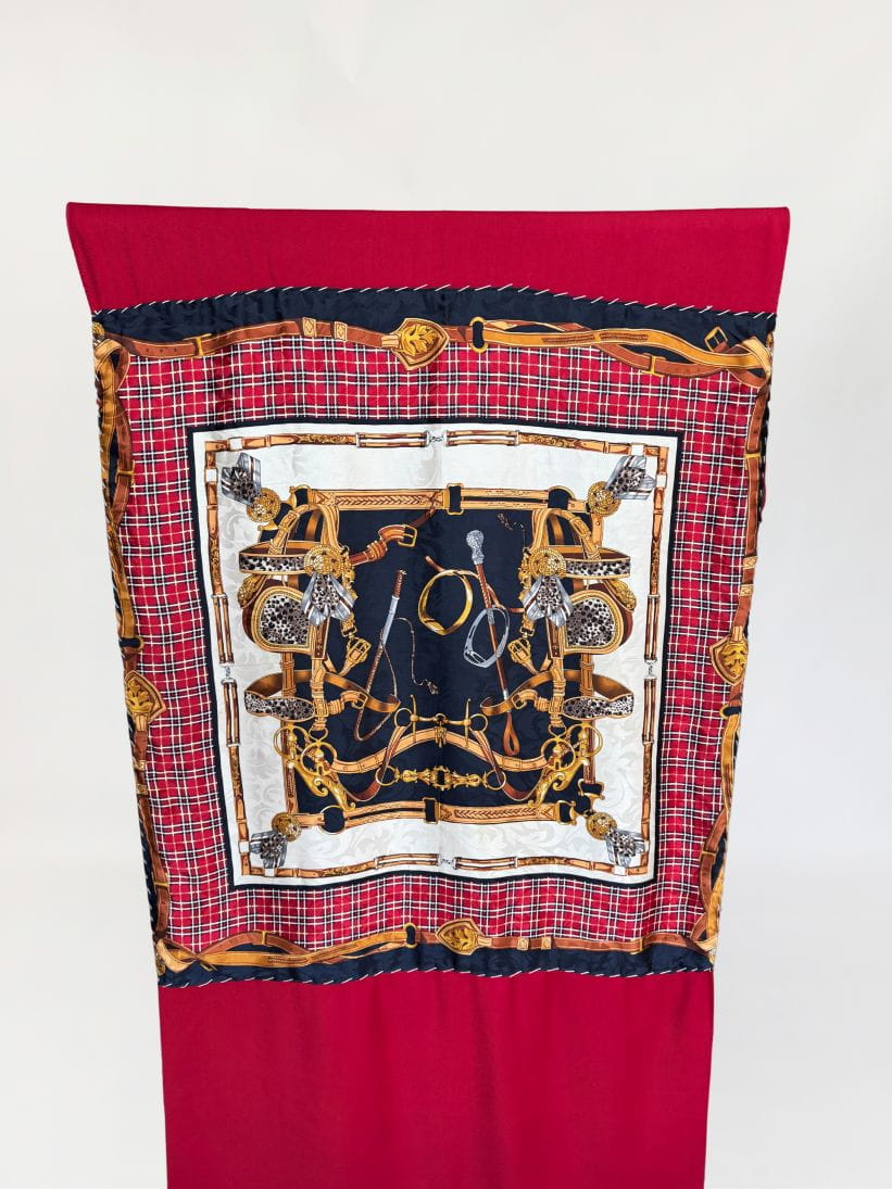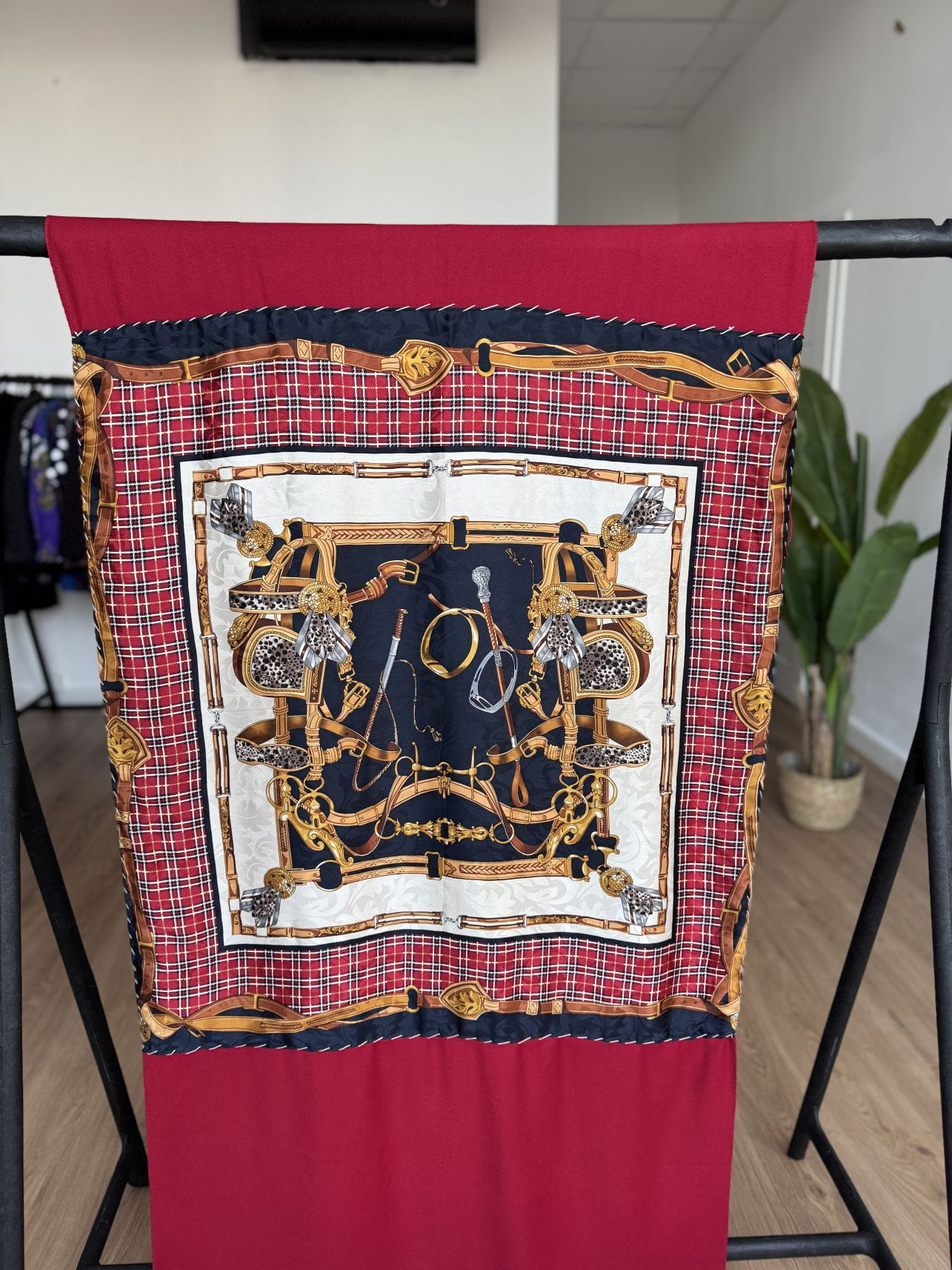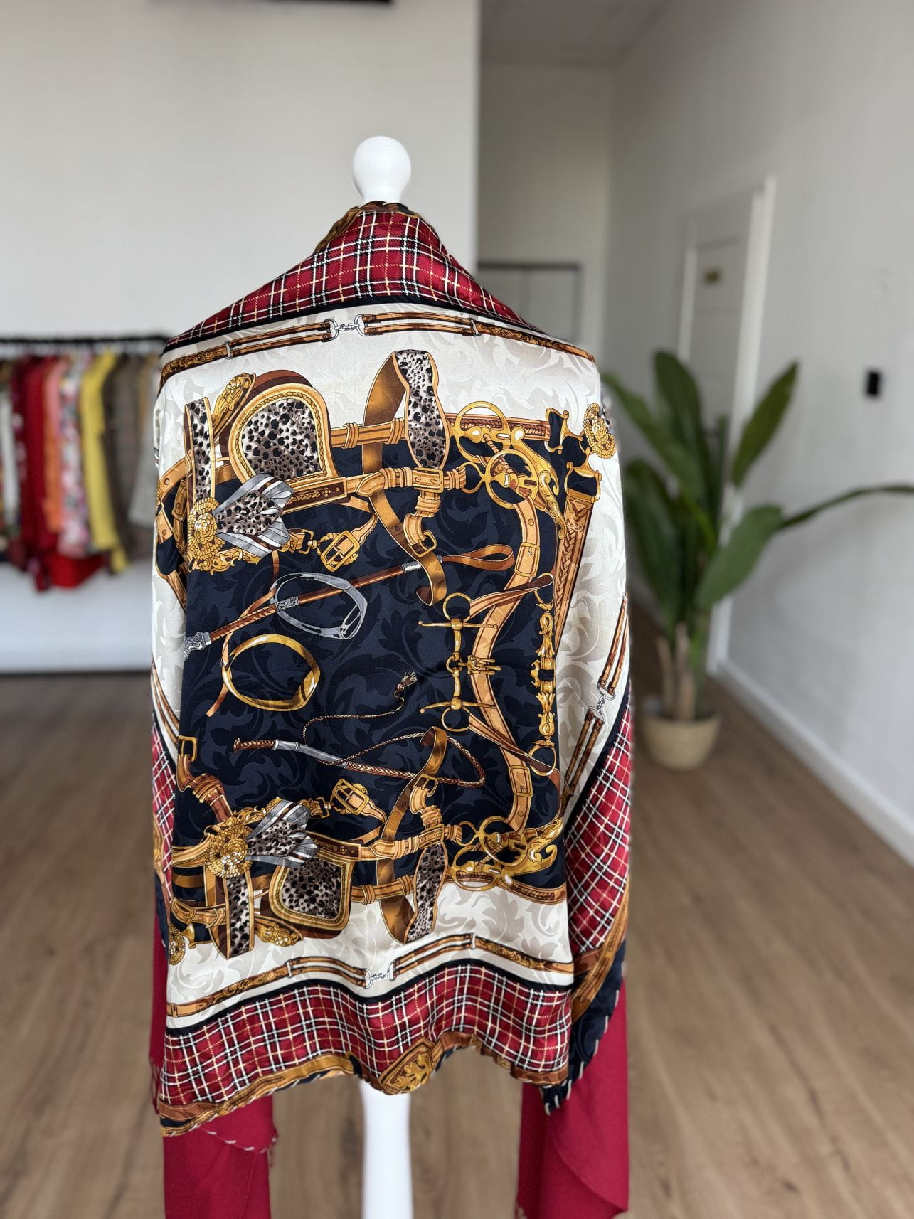 Ogromny szal vintage. Obszerny, długi, zakończony drobnymi frędzlami. W centralnej części jedwabna 'apaszkowa' wstawka w barokowe wzory.